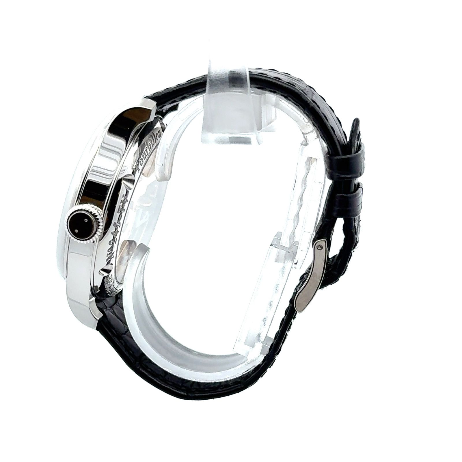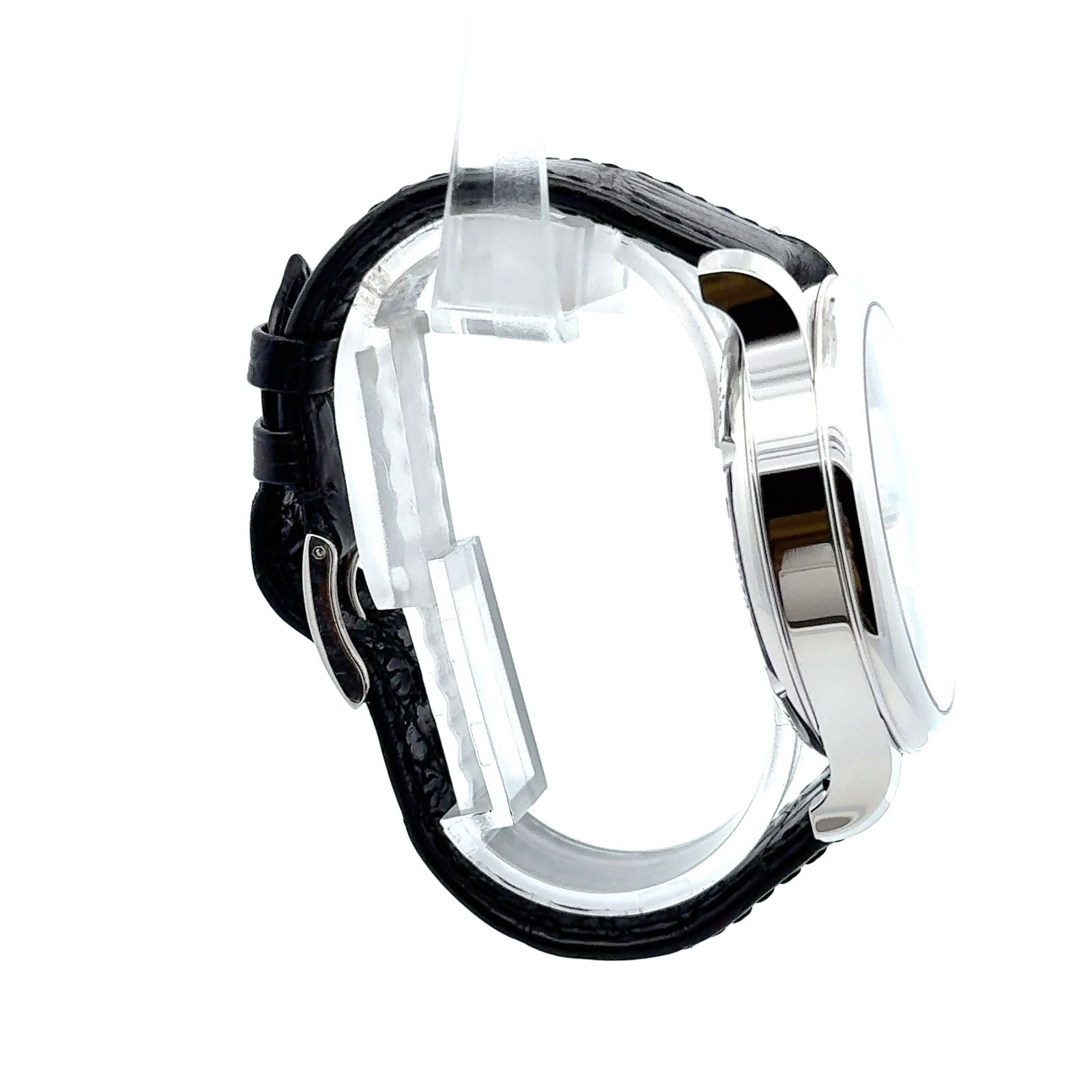 F.P. Journe Tourbillon Souverain Black Label is a rare and masterful expression of haute horlogerie, reserved exclusively for existing F.P. Journe collectors and available only through the brand’s boutiques. Encased in platinum, the most precious of metals, this timepiece features a 40mm case housing the manual-winding Calibre 1519, a movement crafted in 18k rose gold and visible through the dial’s open architecture. The dial itself is formed by blackened movement bridges with Clou de Paris guilloché, engraved and hand-painted inscriptions, and a Grand Feu enamel hour subdial at 3 o’clock. The layout showcases a vertical tourbillon cage, a remontoir d’égalité for constant force delivery, and a deadbeat seconds complication (Seconde Morte)—a trio of mechanisms that elevate precision and mechanical artistry. The tourbillon completes a rotation every 30 seconds, a departure from the traditional 60-second cycle, enhancing visual dynamism and regulating consistency. A power reserve indicator sits at 12 o’clock, while the small seconds and time display are harmoniously balanced across the dial. The rhodium-plated steel hands offer crisp legibility against the dark backdrop, and the black leather strap complements the monochromatic elegance of the Black Label aesthetic.