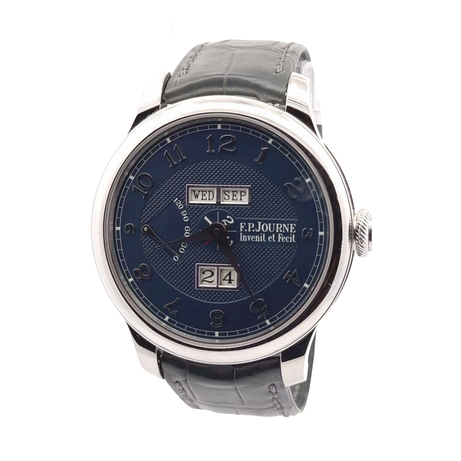 F.P. Journe Quantième Perpétuel is a masterfully engineered perpetual calendar that blends technical ingenuity with elegant simplicity. Housed in a platinum case and paired with a grey leather strap, this timepiece features a deep blue dial with silver Arabic numerals and a guilloché center, offering refined contrast and clarity. The calendar functions are displayed through large, legible apertures: the day and month at the top, and a signature oversized date at 6 o’clock. A small seconds subdial at 9 o’clock adds balance to the layout. Powered by the automatic Caliber 1300.3, the movement incorporates an instantaneous jump mechanism that changes all calendar indications simultaneously, a rare and sophisticated feature.