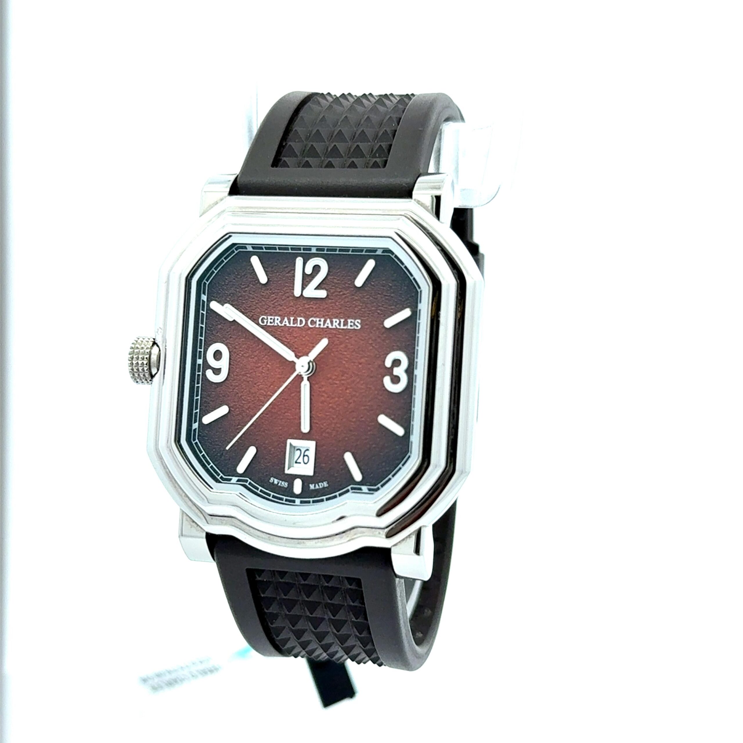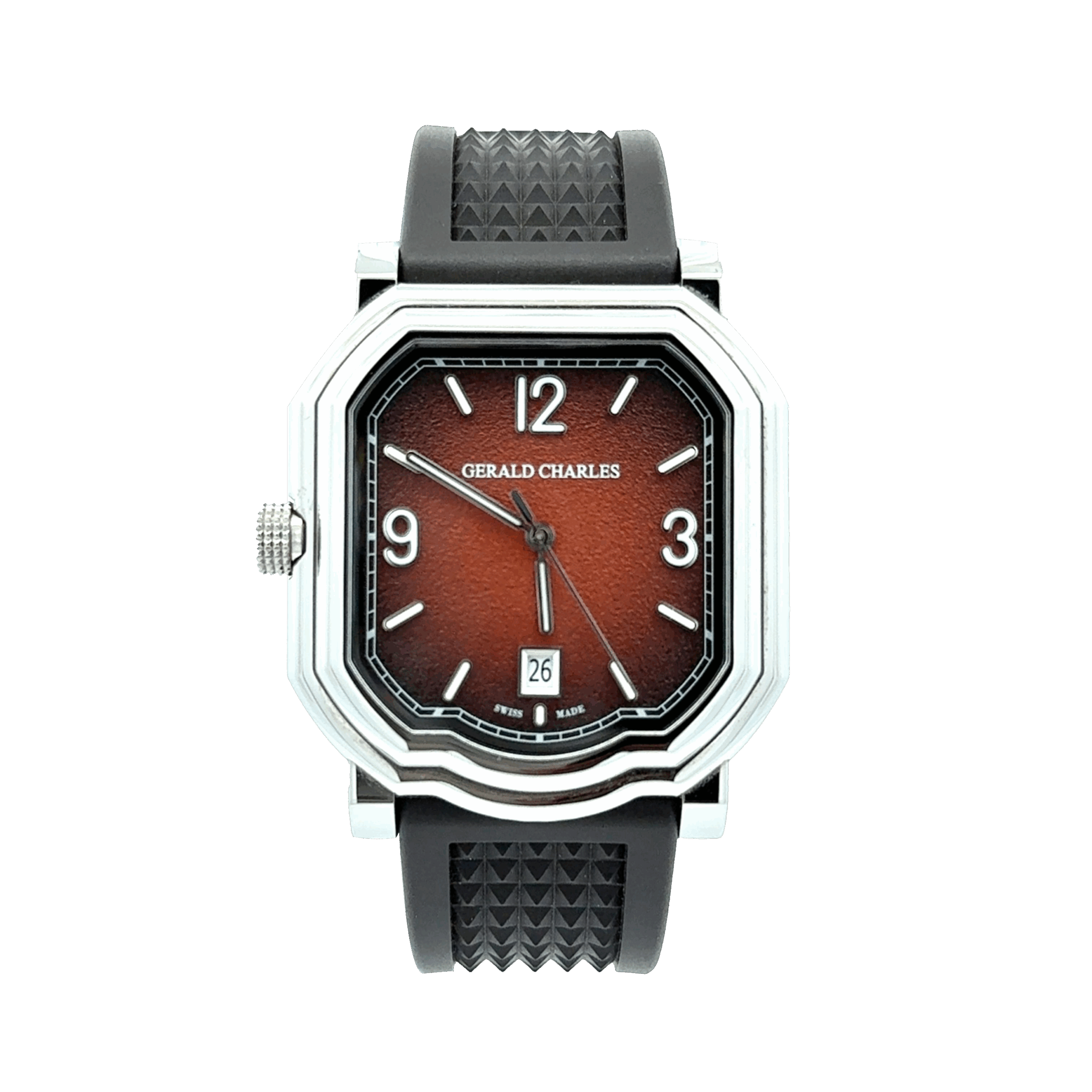 Gerald Charles Maestro GC2.0-TX-TN-08-GR is a refined sports-luxury watch that embodies the artistic vision of Gérald Genta and the modern identity of Gerald Charles. Its standout feature is the Maestro case, an asymmetrical yet harmonious design first drawn by Genta himself, here executed in polished stainless steel with distinctive stepped edges and the instantly recognizable “smile” curve at 6 o’clock.