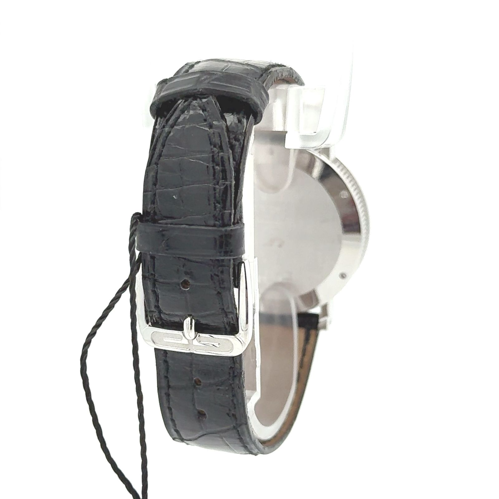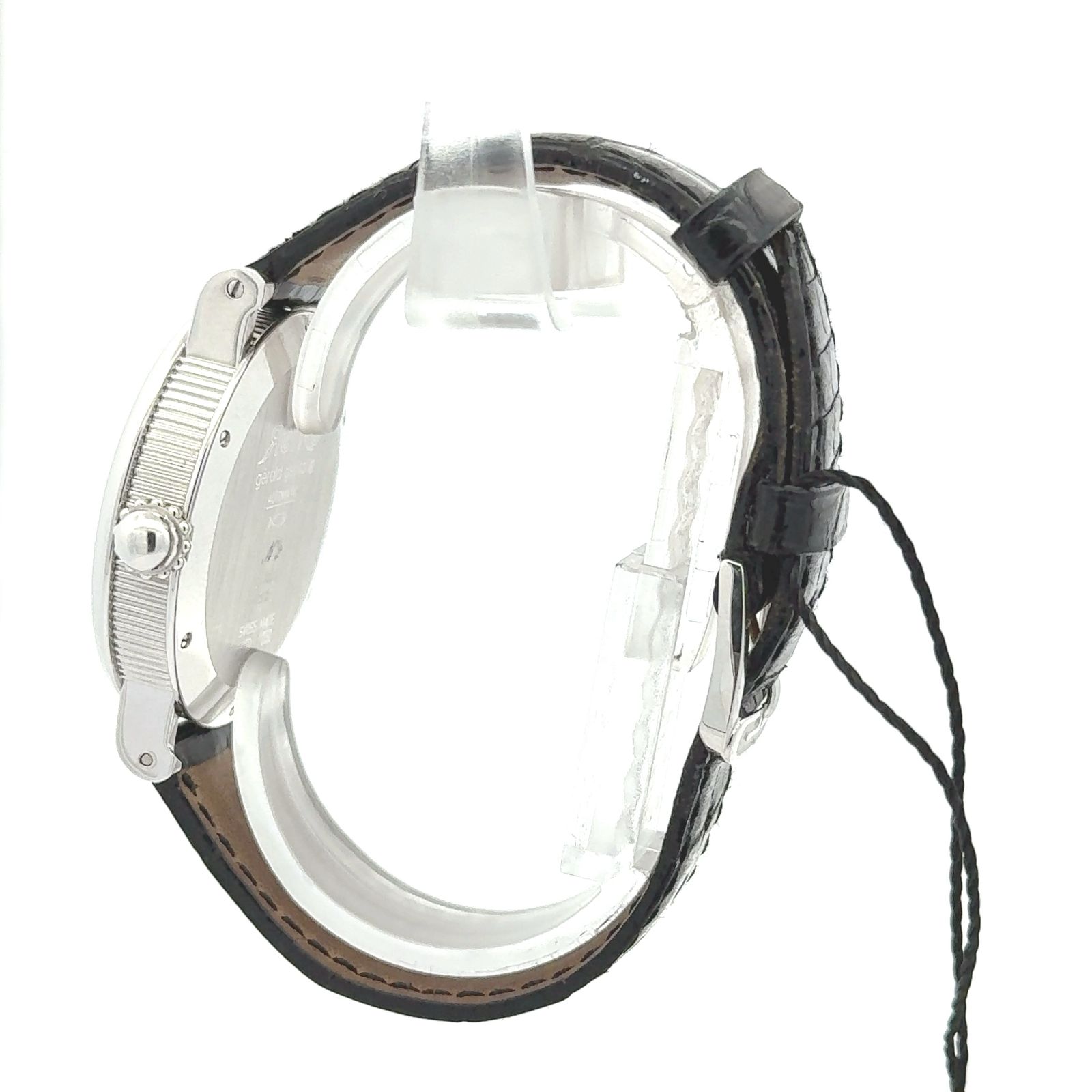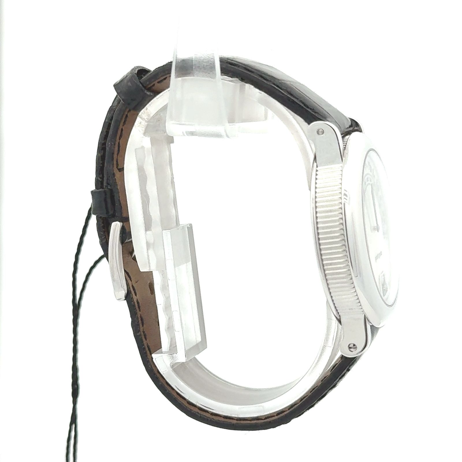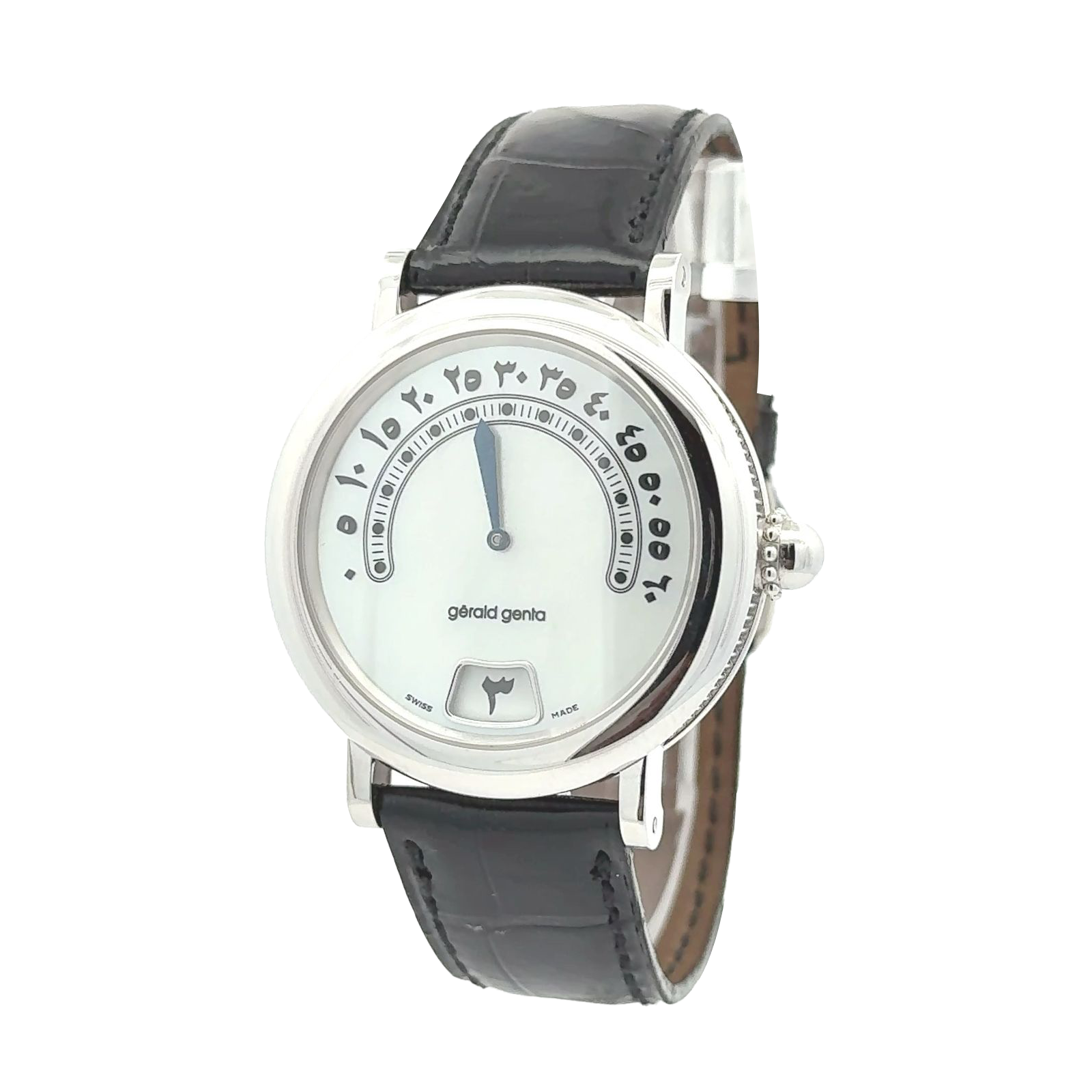 Gérald Genta 3634G is a striking embodiment of avant-garde horology, showcasing the legendary designer’s flair for blending mechanical ingenuity with bold aesthetics. At its heart lies a retrograde minute display—a single hand arcs gracefully across a semi-circular scale from 0 to 60, snapping back at the hour’s end in a theatrical flourish. The dial is rendered in a light tone with stark black markings, ensuring high legibility while maintaining a minimalist elegance. Encased in polished metal, the watch exudes a refined luster that complements its technical sophistication. Paired with a textured black leather strap, the 3634G balances modernity and classicism, making it not just a timepiece but a statement of design heritage. Gérald Genta’s signature is unmistakable—this watch is a celebration of complication, clarity, and character.