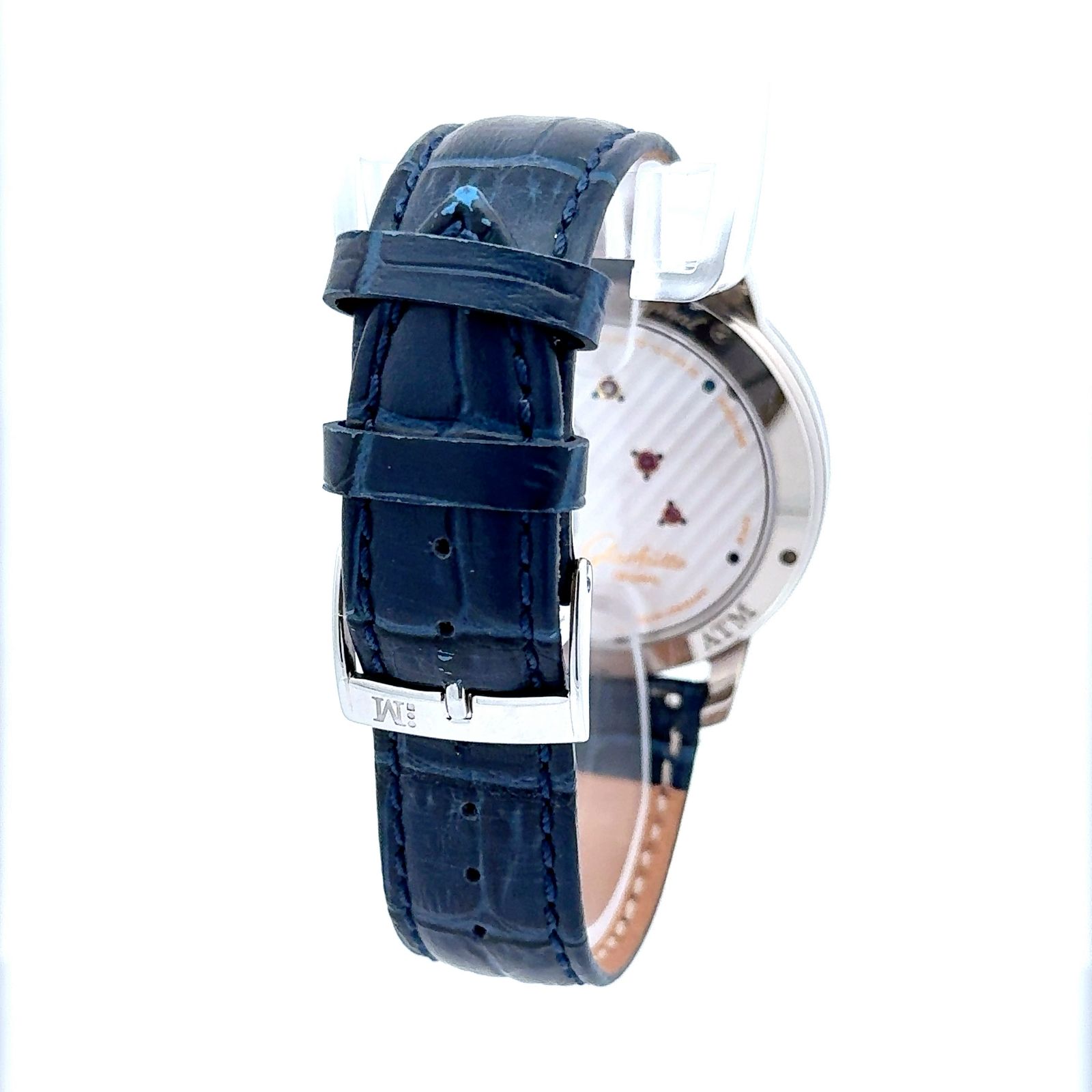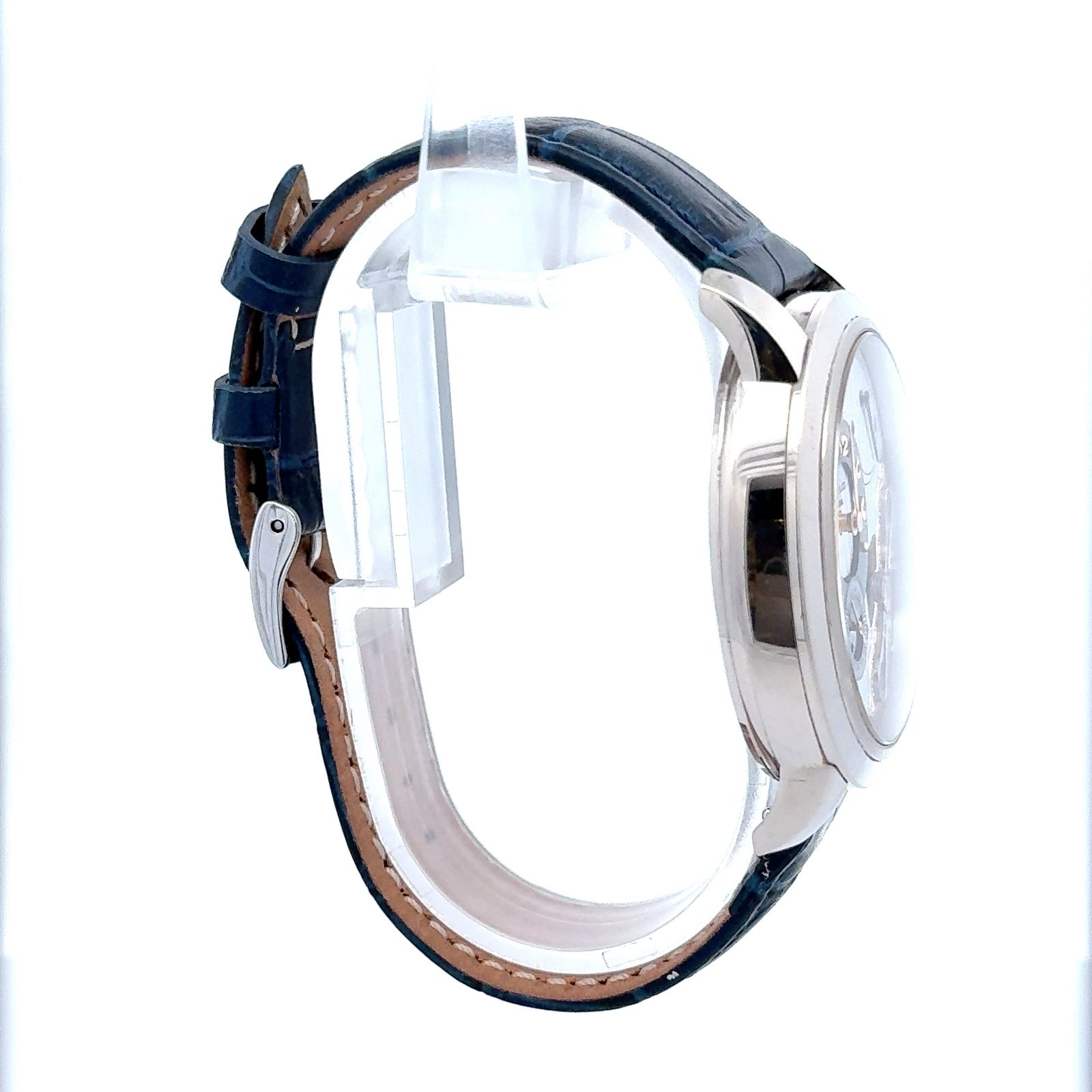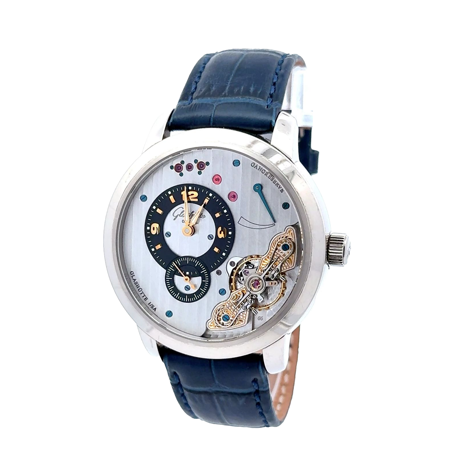 Glashütte Original PanoInverse XL reference 66-01-04-14-05 in white gold is a stunning representation of German horological craftsmanship and innovative design. Housed in a 42 mm 18k white gold case, this timepiece showcases the brand's signature inverted movement architecture, bringing typically hidden mechanical elements to the front dial. The watch is powered by the in-house manual-winding Caliber 66-01, offering a 41-hour power reserve and featuring Glashütte’s iconic duplex swan-neck fine adjustment, which is hand-engraved and elegantly displayed on the dial side, a hallmark of the PanoInverse line. Paired with a deep blue Louisiana alligator leather strap, this white gold PanoInverse XL merges technical brilliance with refined aesthetics.
