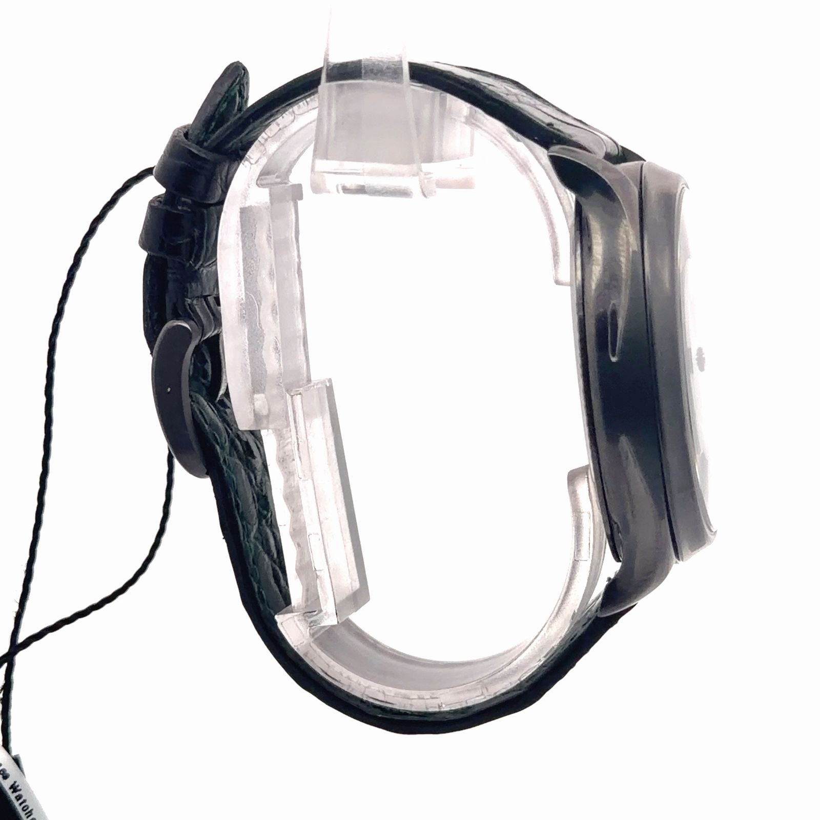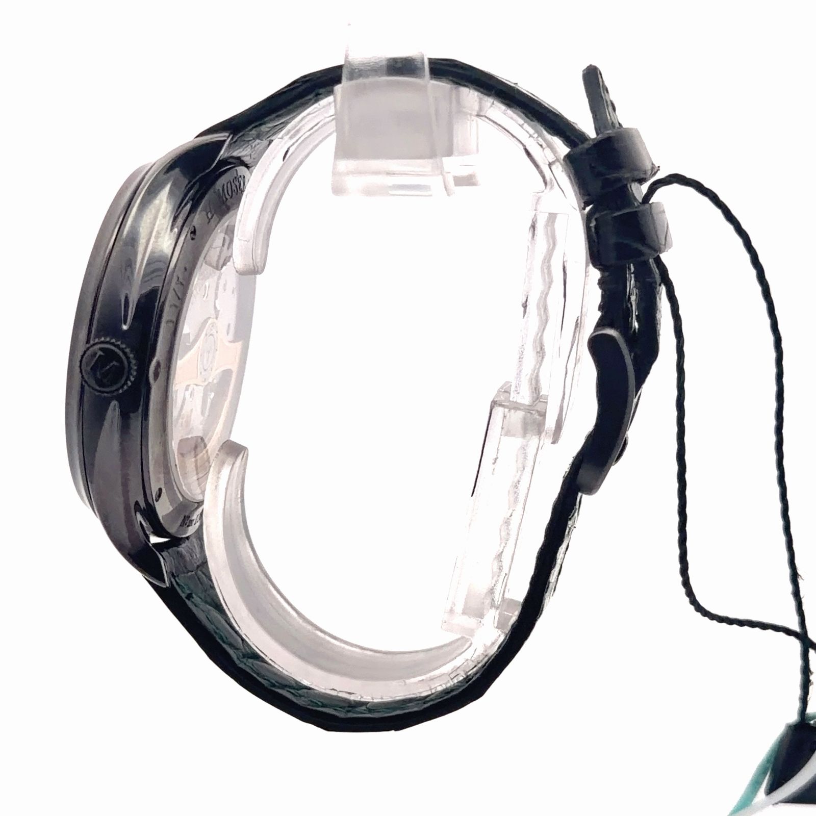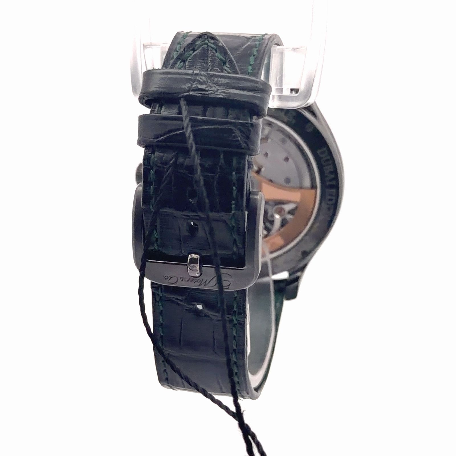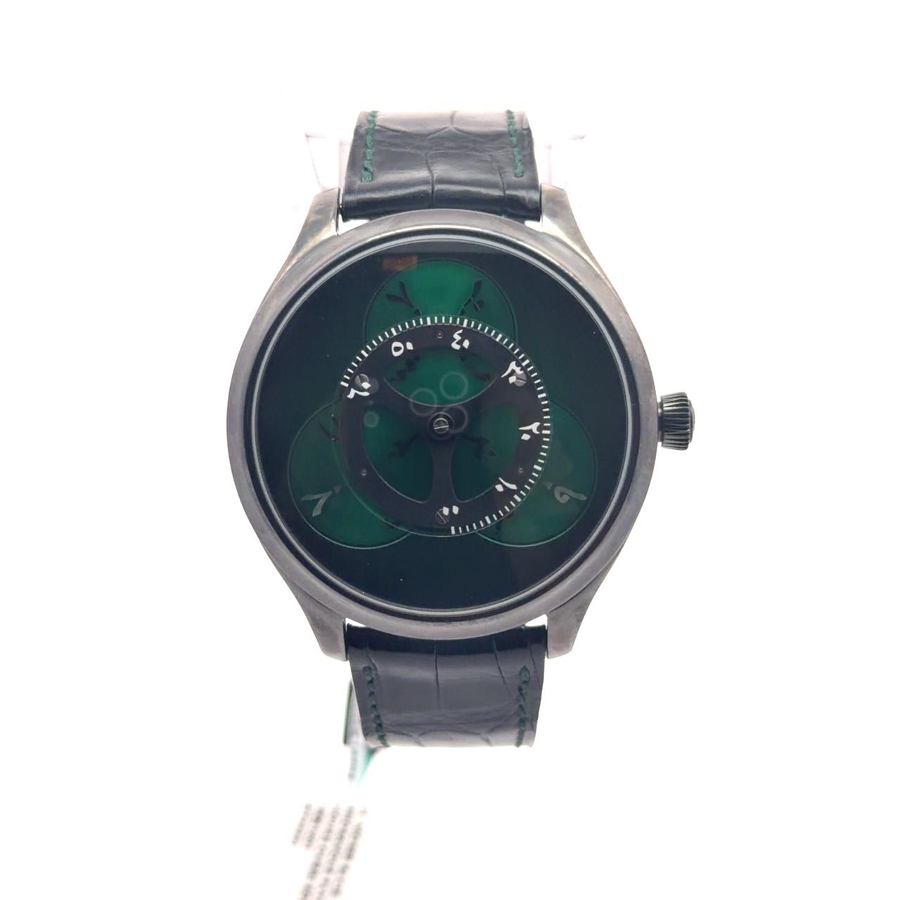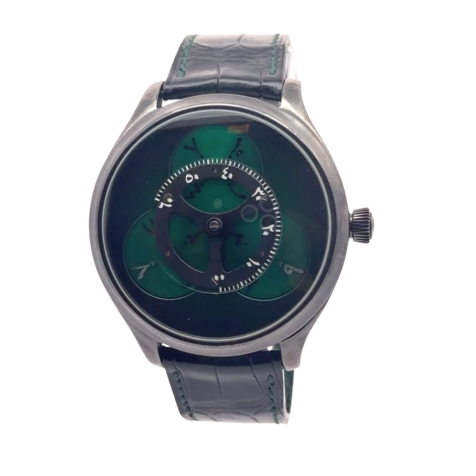H. Moser & Cie. Endeavour Flying Hours Dubai Edition reference 1806-1201 is a rare and highly sought-after limited edition, with only 20 pieces ever produced. This 42mm timepiece features a distinct stainless steel case treated with a black Diamond-Like Carbon (DLC) coating, giving it a sleek, resilient, and modern aesthetic. Its signature "Cosmic Green" fumé dial employs a sophisticated "wandering hours" display, utilizing three jumping hour discs and a central rotating sapphire minute disc marked with Eastern Arabic numerals. At the heart of the watch is the self-winding caliber HMC 806 and with a robust 72-hour power reserve.
