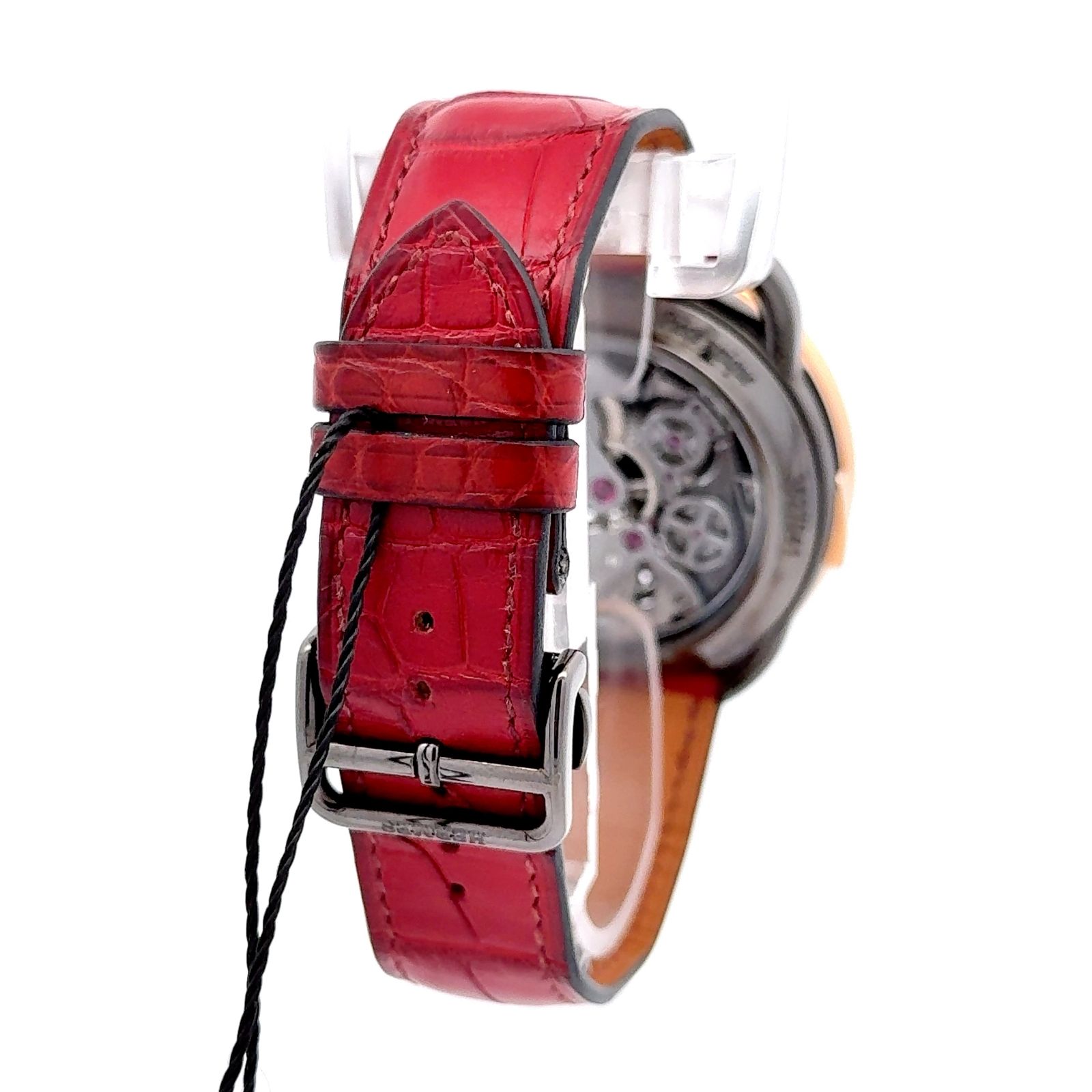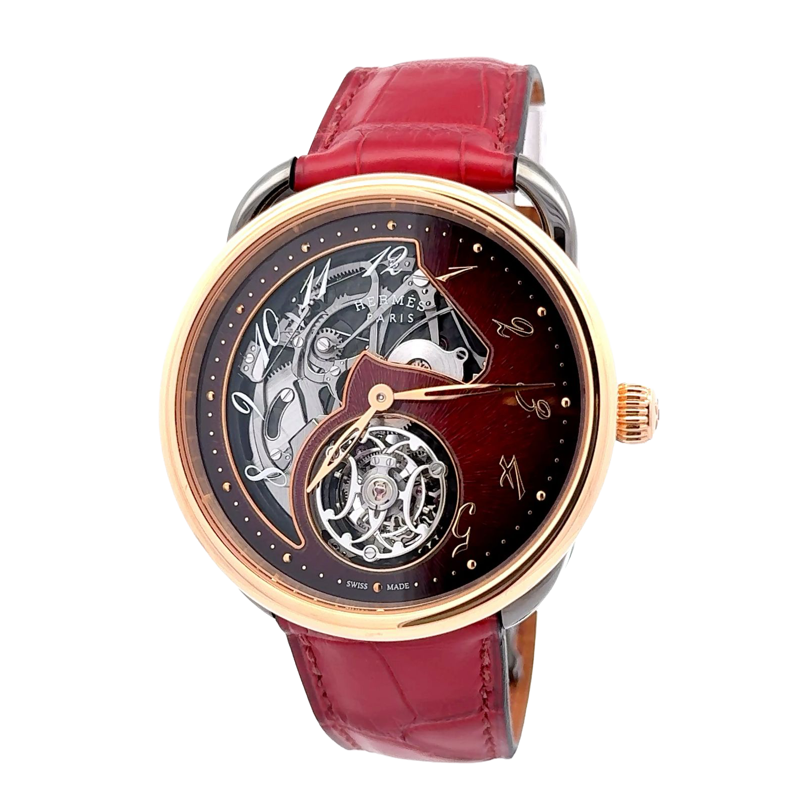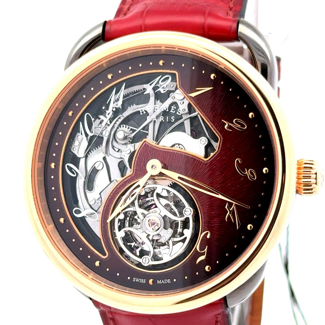 Hermès Arceau Piece Unique is a poetic fusion of haute horlogerie and artistic expression, distinguished by its sculptural elegance and mechanical sophistication. Encased in warm rose gold, this singular creation from Hermès’ Arceau collection showcases a partially skeletonized dial that reveals the intricate choreography of its hand-wound movement. The dial features whimsical, slanted Arabic numerals—an Arceau signature—evoking the rhythm of a galloping horse, while the tourbillon at 6 o’clock anchors the composition with technical gravitas and visual drama. The red leather strap adds a bold, contemporary contrast, enhancing the watch’s expressive character. Beneath the sapphire crystal, the craftsmanship is unmistakable: from the finely finished bridges to the delicate interplay of gears, every detail reflects Hermès’ commitment to artisanal excellence. As a piece unique, this watch transcends conventional luxury, offering collectors a rare embodiment of time, artistry, and individuality.