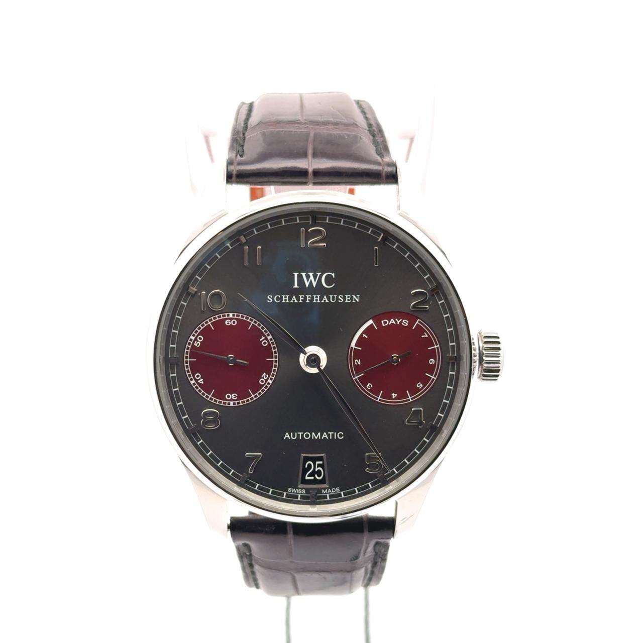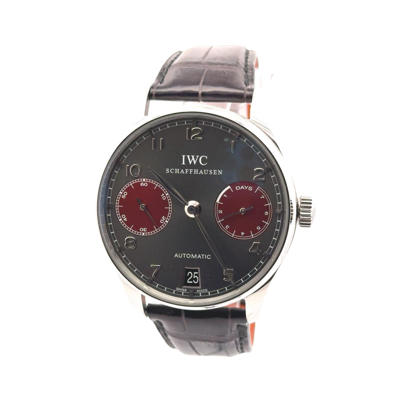 IWC Portugieser Automatic IW500126 Tribeca Film Festival Edition is a sophisticated and culturally meaningful timepiece that blends IWC’s technical mastery with the artistic spirit of New York’s film scene. Limited to just 100 pieces, it features a stainless steel case paired with a striking slate‑grey dial, accented by rich burgundy subdials inspired by the festival’s signature red‑carpet palette. The balanced layout showcases a seven‑day power reserve indicator at 3 o’clock and a small‑seconds register at 9 o’clock, complemented by elegant feuille hands and applied Arabic numerals. A date window at 6 o’clock adds everyday practicality, while the in‑house caliber 51011—visible through the sapphire caseback—delivers exceptional performance with its Pellaton winding system and impressive 168‑hour power reserve.