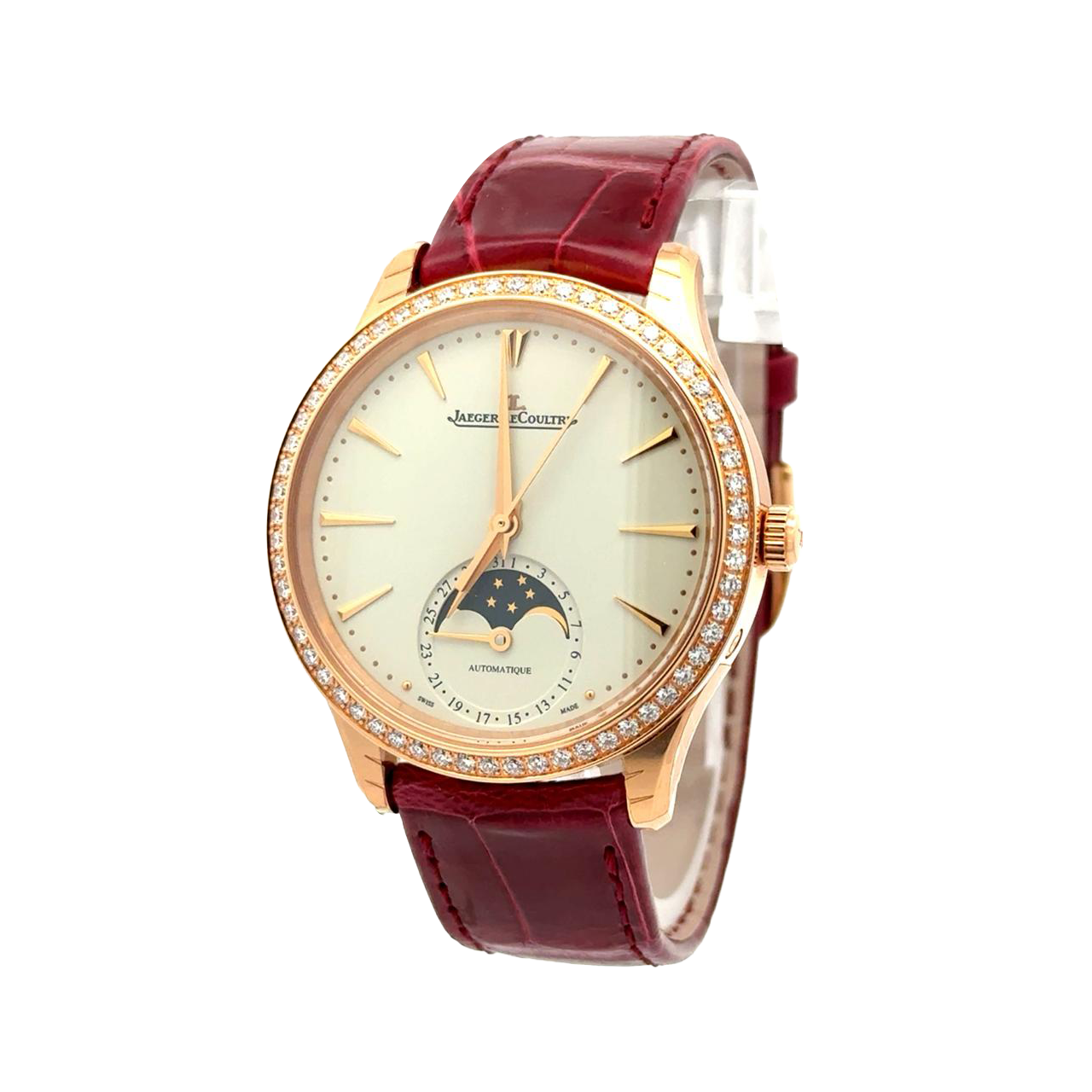 Jaeger-LeCoultre Master Ultra Thin Moon Q1252501 is a poetic blend of elegance and technical mastery, crafted in 18k rose gold and adorned with a diamond-set bezel that elevates its refined silhouette. This 34 mm ladies’ timepiece from Jaeger-LeCoultre’s Master Ultra Thin collection embodies the maison’s dedication to understated luxury and horological finesse. The eggshell sunray dial is delicately finished, featuring polished rose gold hour markers and hands with a two-tone matte and polished treatment for enhanced legibility. At the 6 o’clock position, a moon phase complication is nestled within a date subdial, offering both celestial charm and practical utility. The bezel is set with 60 brilliant-cut diamonds, totaling approximately 0.85 carats, adding a radiant frame to the dial without overwhelming its purity. Inside, the watch is powered by the automatic caliber 925/1, a movement just 4.9 mm thick, composed of 253 parts and 30 jewels, and equipped with a 22-carat gold oscillating rotor. It beats at 28,800 vibrations per hour and delivers a power reserve of approximately 43 hours.