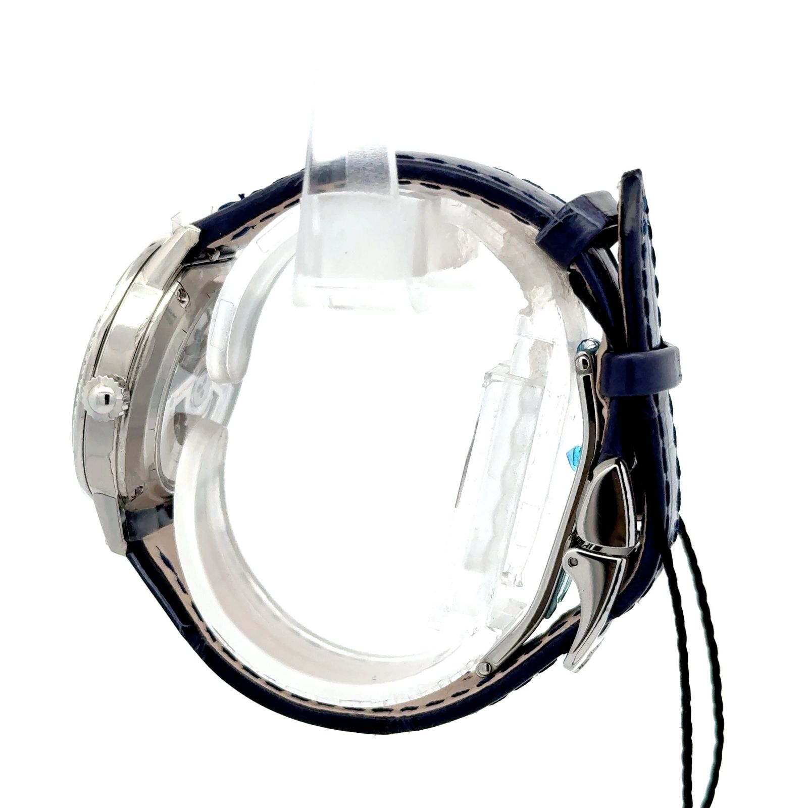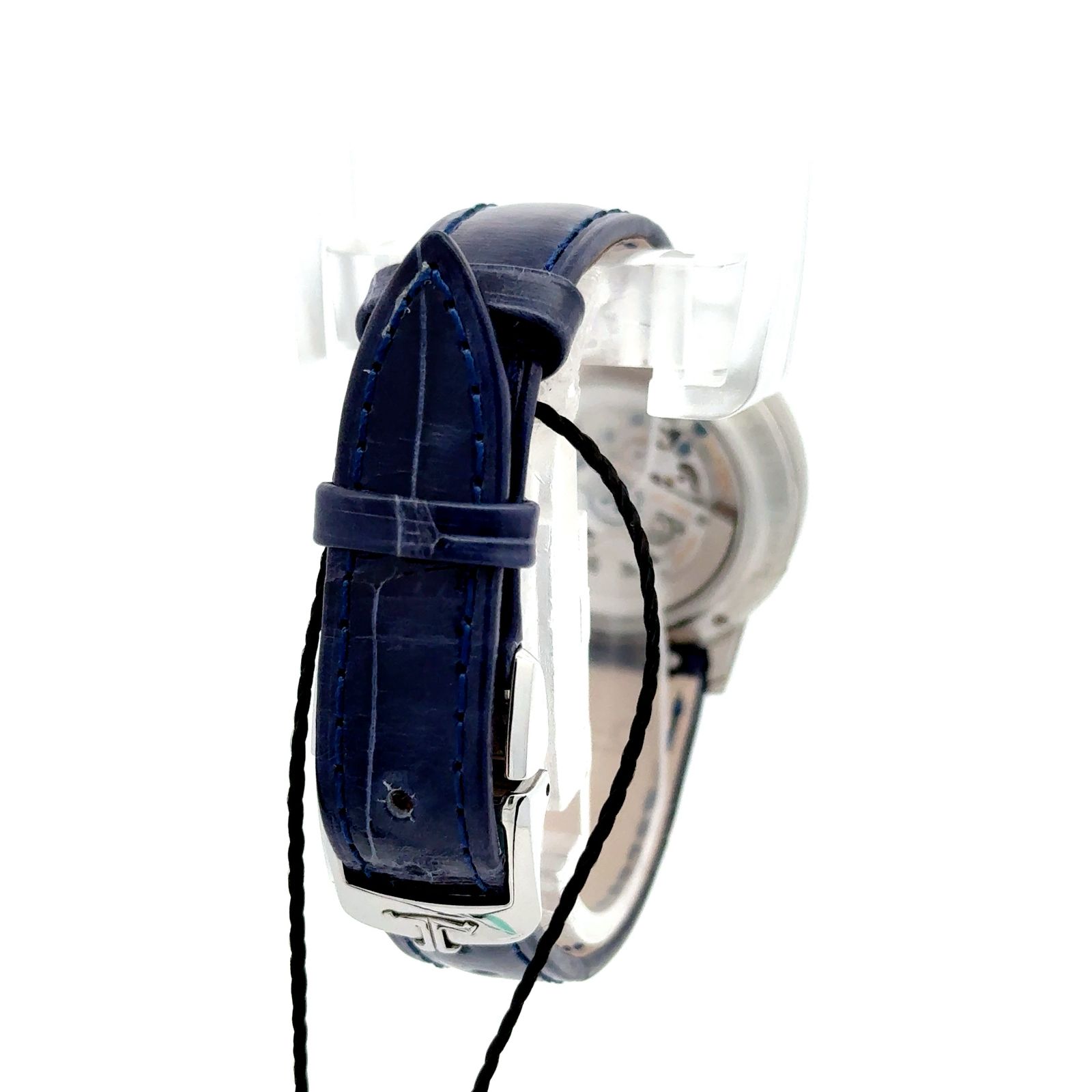 Inside, the watch is powered by the automatic Jaeger-LeCoultre Caliber 967A, visible through the sapphire crystal caseback. This movement is crafted and assembled in the Vallée de Joux and offers hours, minutes, seconds, and the day/night function, with a power reserve of approximately 42 hours. The case is water-resistant to 30 meters and paired with a blue alligator leather strap, secured by a stainless steel deployant buckle.