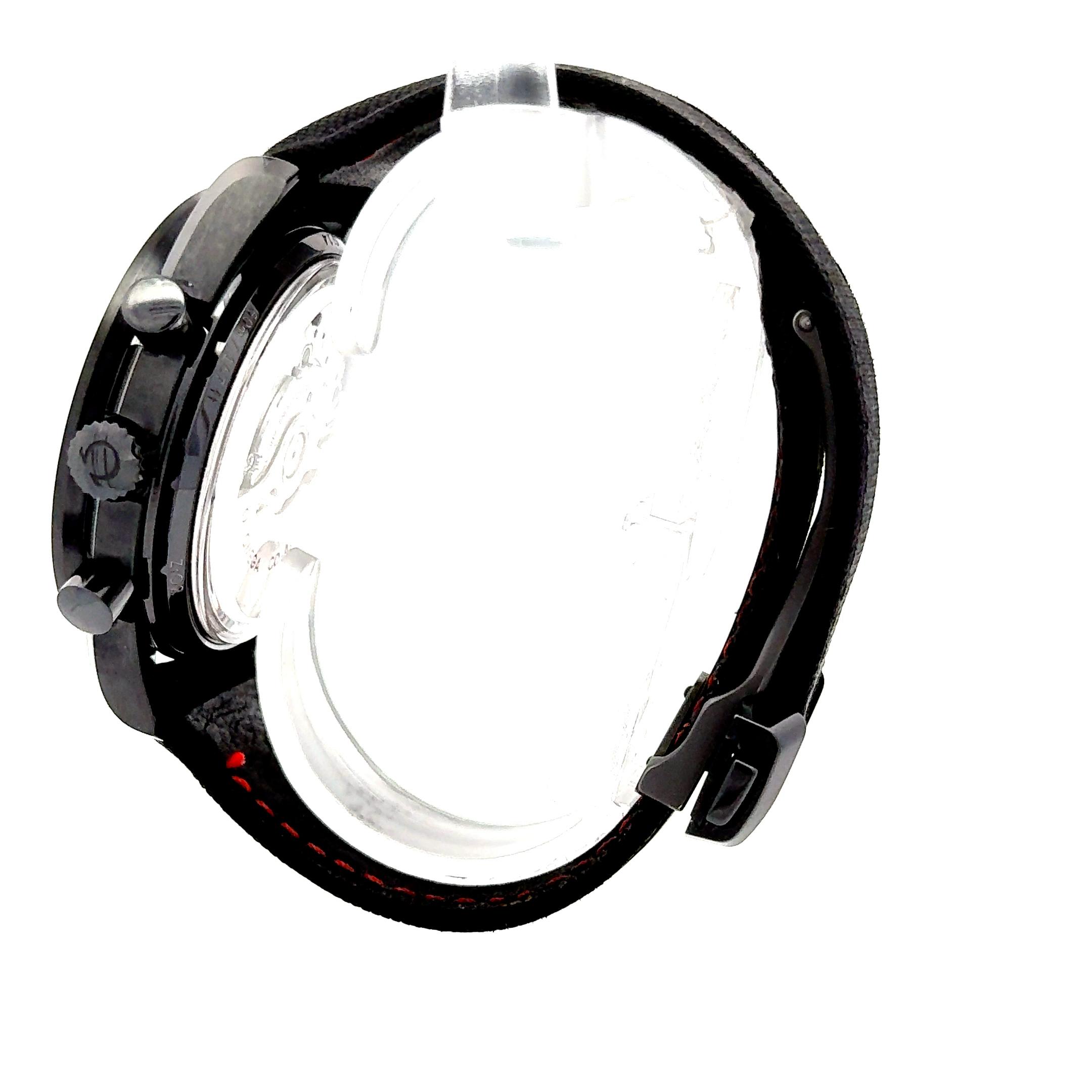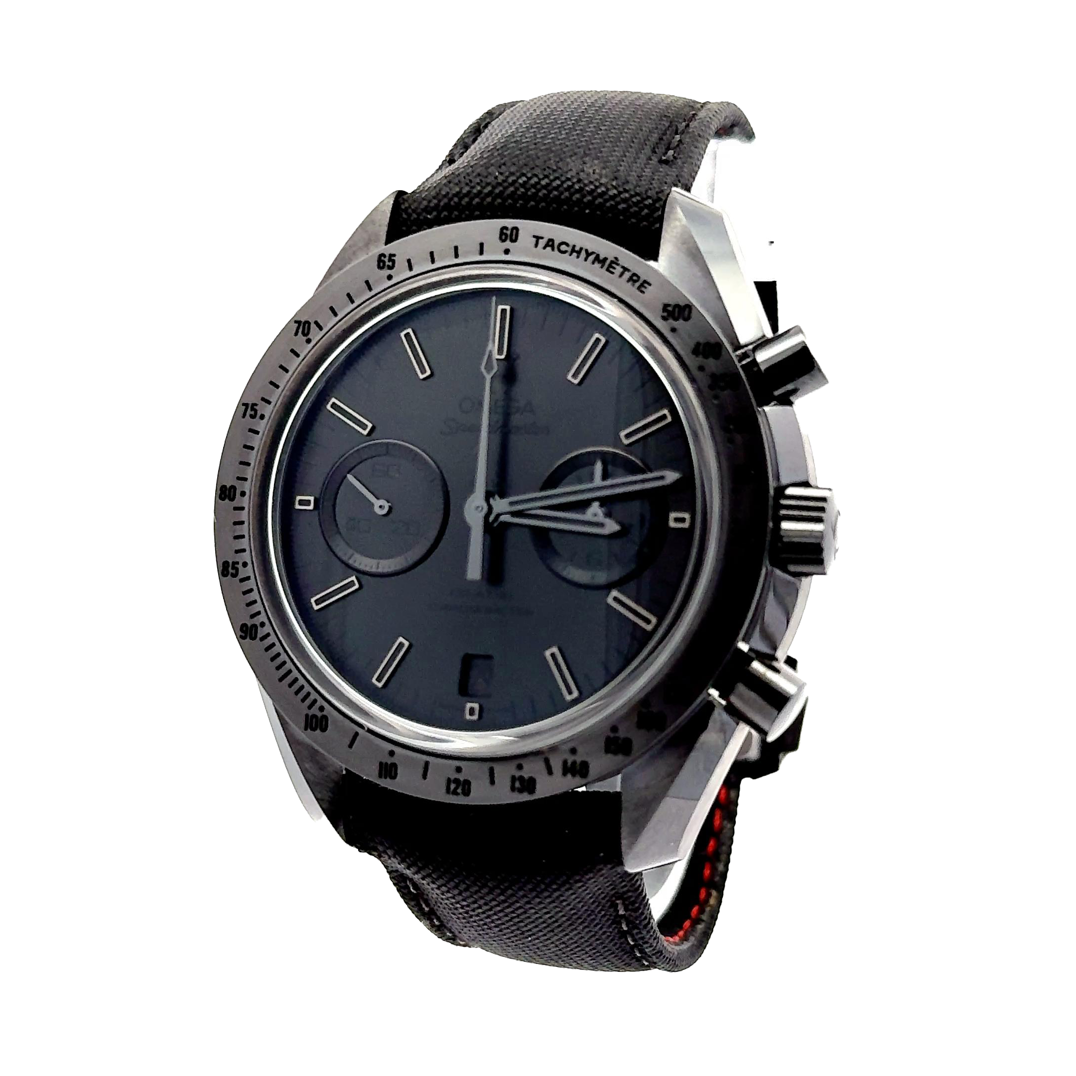 Omega Speedmaster Moonwatch Dark Side of the Moon “Black Black” with reference 311.92.44.51.01.005 is a stealth masterpiece in ceramic chronograph design. Unveiled as part of Omega's Dark Side of the Moon series, it features a 44.25 mm brushed and polished black zirconium oxide (ZrO₂) ceramic case, delivering both durability and a distinct matte sheen. Driving the watch is Omega’s in-house Co-Axial Calibre 9300, a robust automatic chronograph movement featuring a column-wheel, vertical clutch, and Si14 silicon balance spring. Functions include hours, minutes, running seconds, central chronograph seconds, and a combined chronograph hour/minute register in the 3 o'clock sub-dial. A discrete date window is positioned at 6 o'clock. The watch is mounted on a black-coated nylon fabric strap with a black ceramic deployant clasp, blending both sportiness and refinement. It measures about 50 meters water resistant, making it suitable for daily wear though not for serious diving .