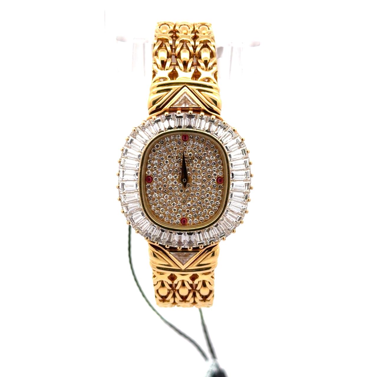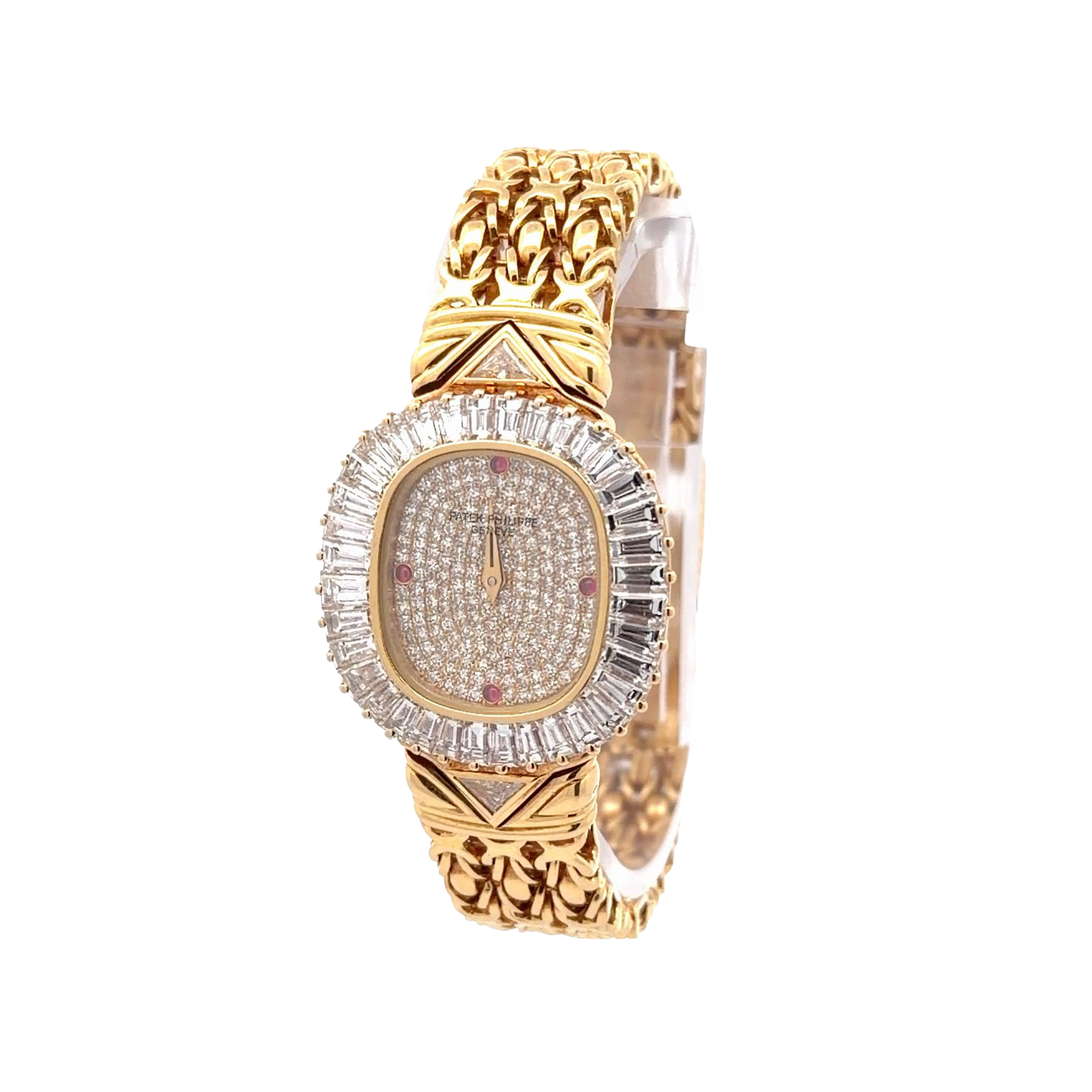 Patek Philippe Ref. 4767/1J is a radiant expression of high-jewelry watchmaking, crafted entirely in 18K yellow gold and lavishly adorned with diamonds. Its dial is fully pavé-set with brilliant-cut stones, punctuated by four ruby hour markers that add a subtle yet striking contrast. Surrounding the dial, the bezel features a halo of baguette-cut diamonds, enhancing the watch’s regal presence. The integrated bracelet continues the opulent theme with a woven gold pattern and decorative flourishes near the case, blending artistry with structural finesse. Elegant gold-tone hands glide across the dial, maintaining legibility amidst the sparkle.