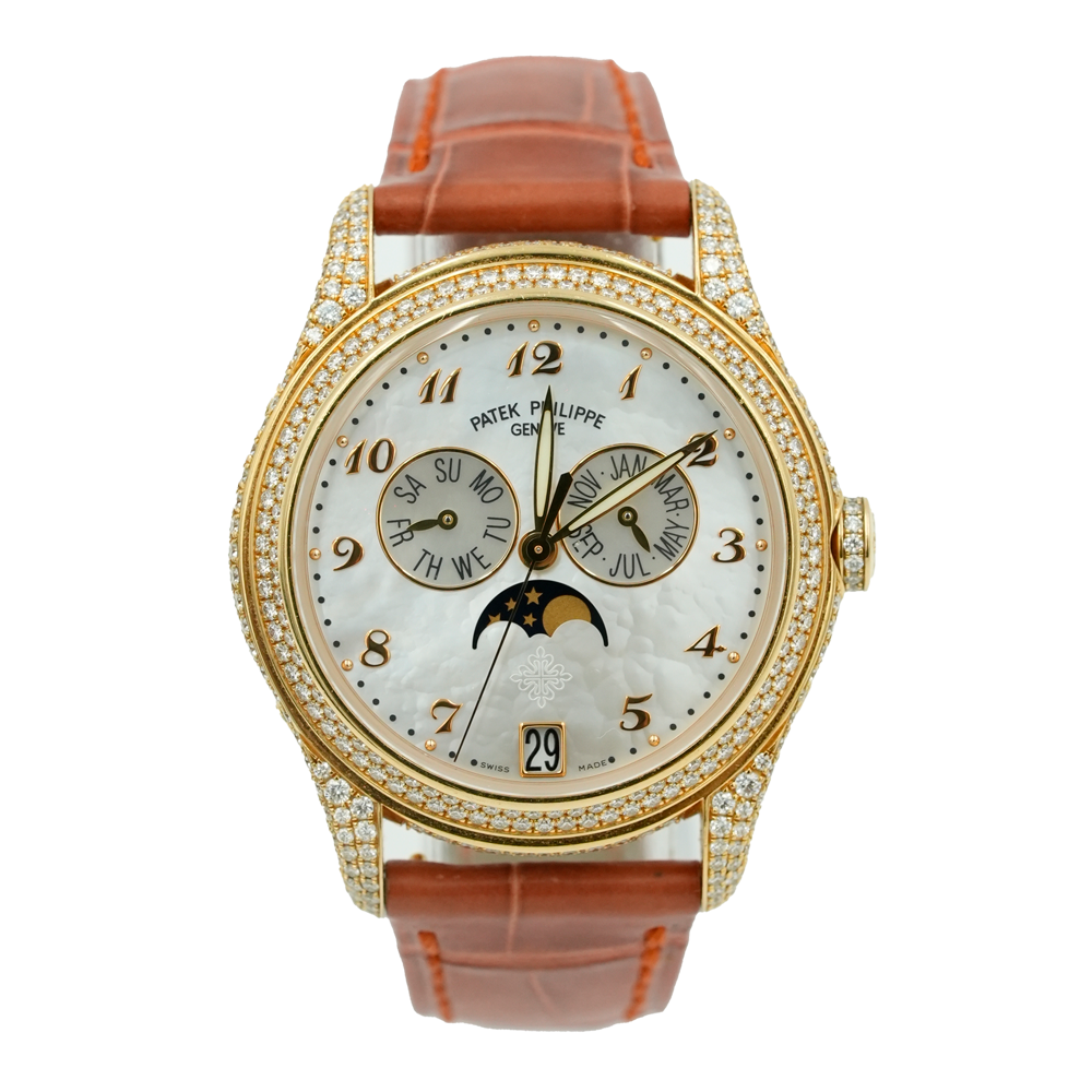 Patek Philippe Annual Calendar complication with reference 4937R-001 designed for their ladies' collection, this elegant timepiece features a 37mm 18k rose gold case with contoured lugs, a factory diamond-set bezel, case, and lugs, and a signed crown with a factory diamond setting on the periphery. Its stunning mother of pearl dial features applied and dot indices, and displays twin subsidiary registers denoting the day and month, as well as moon-phase indicator directly above the date window at 6 o’clock. The reverse of the case features a a sapphire exhibition back providing a window through which you can admire the beautiful automatic-winding Patek movement and its yellow gold winding rotor adorned with the hallmark Patek Philippe seal. It comes fitted to a beautiful alligator strap with a matching 18k rose gold diamond-set pin buckle.