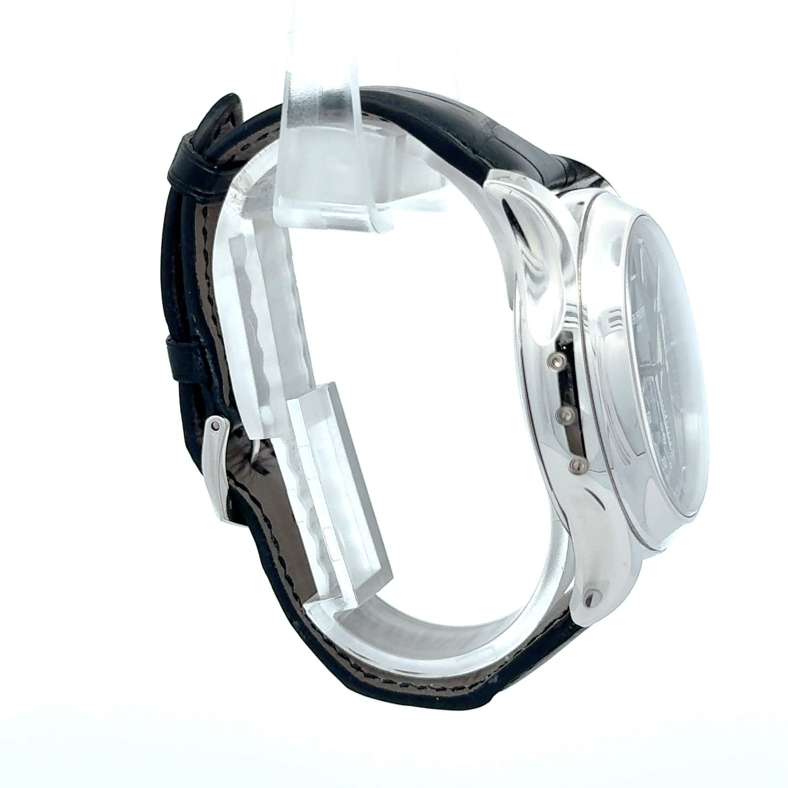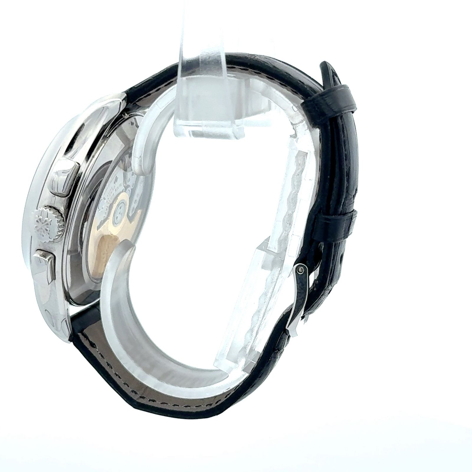 Patek Philippe Complications Annual Calendar Chronograph 5905P-010 is a self-winding automatic watch featuring a 42mm platinum case and a black dial on a black alligator leather strap with a platinum tang buckle. This sophisticated timepiece includes an annual calendar complication, displaying the date, day, and month through windows, alongside a flyback chronograph function. Powered by the automatic Patek Philippe caliber CH28-250 QA 24h movement, it boasts a 55-hour power reserve and features applied white gold hour markers on its glossy black dial.
