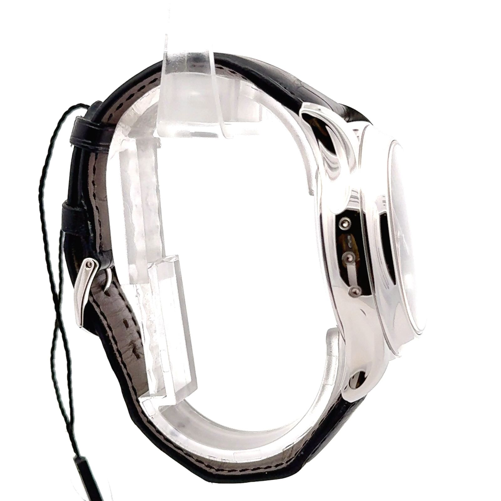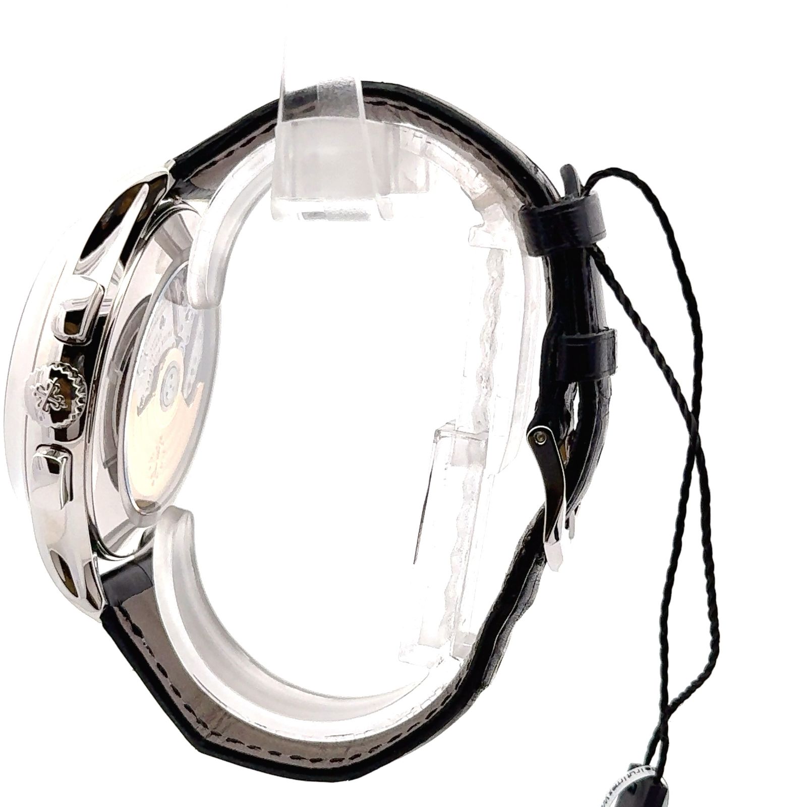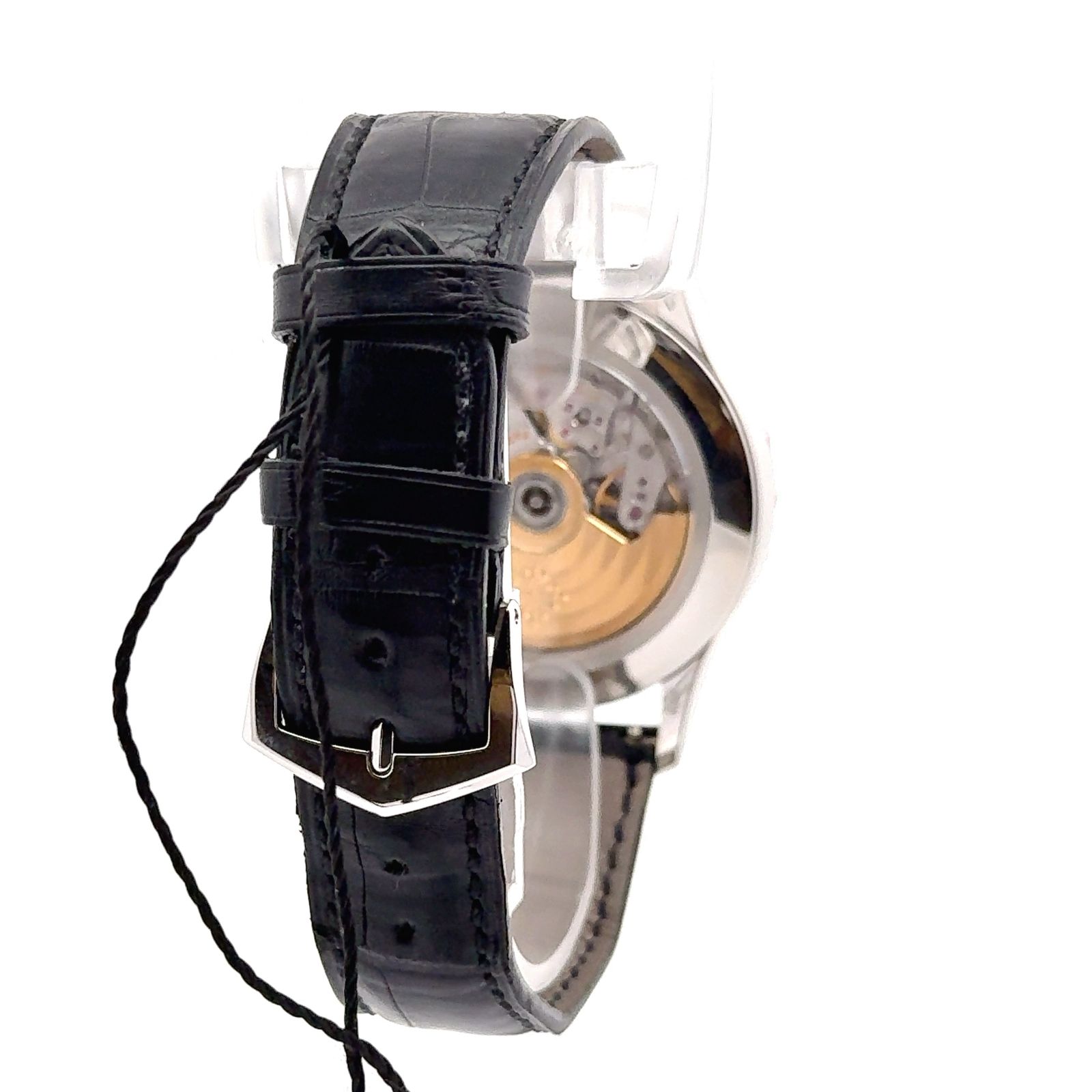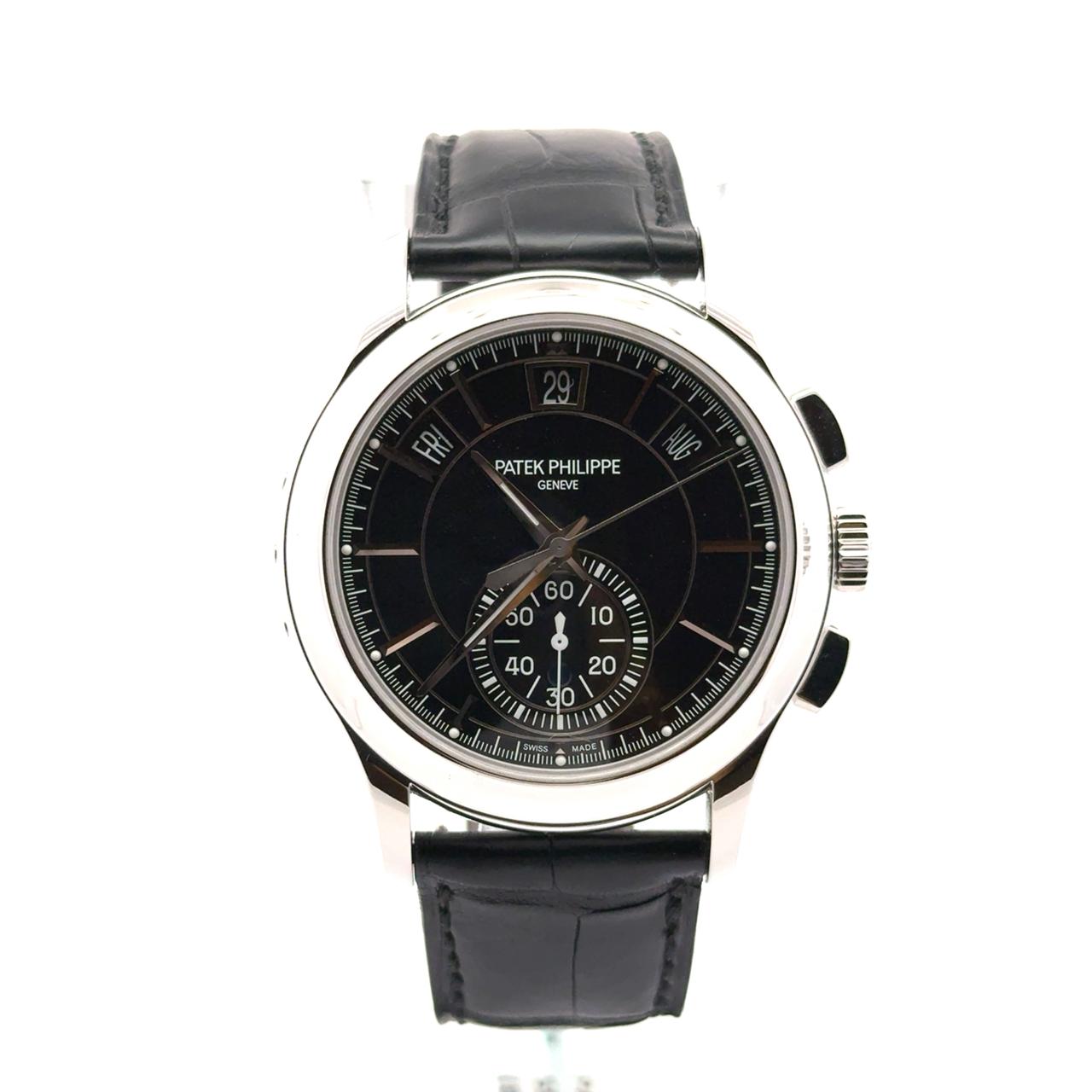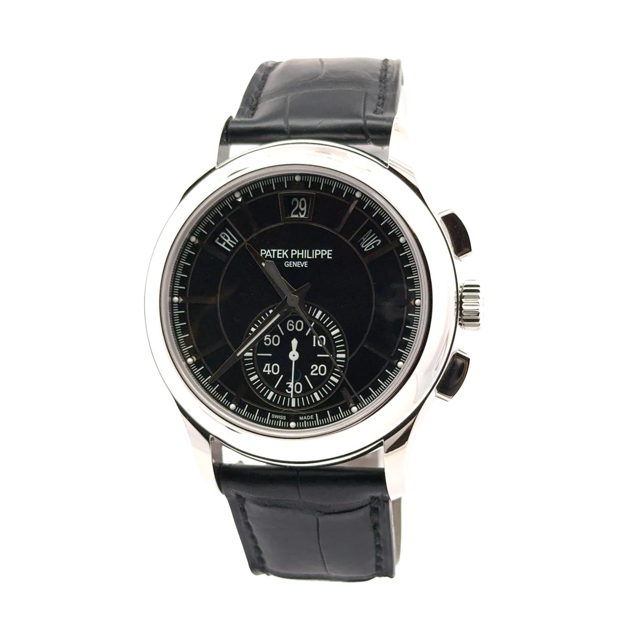 Patek Philippe 5905P-010 is a refined fusion of contemporary elegance and high complication, housed in a commanding 42mm platinum case that exudes understated luxury. This annual calendar chronograph features a sunburst black dial with day, date, and month apertures arranged in an arc across the upper half, offering intuitive readability. The dial’s sleek layout is punctuated by white gold applied hour markers, luminous hands, and a 60-minute chronograph counter at 6 o’clock, which also integrates a small seconds display. Powered by the Caliber CH 28‑520 QA 24H, a self-winding movement with flyback chronograph and annual calendar functions, it automatically accounts for months with 30 or 31 days, requiring adjustment only once a year in February. The movement is visible through a sapphire crystal caseback, showcasing Patek Philippe’s meticulous finishing and the 22K gold rotor. The watch is paired with a hand-stitched black alligator strap and a folding platinum clasp, completing its sophisticated silhouette. With 30 meters of water resistance and a power reserve of 55 hours, the 5905P-010 is a modern classic—ideal for collectors who appreciate technical prowess wrapped in timeless design.