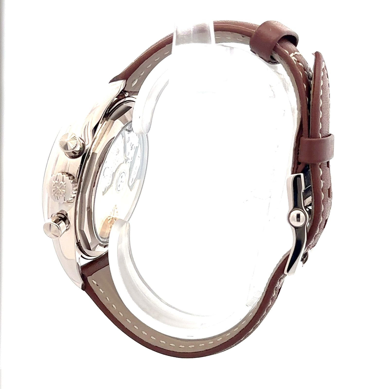 Patek Philippe 5960/01G-001 is a luxurious white‑gold annual‑calendar chronograph that epitomizes the brand’s mastery in melding complex mechanics with sporty elegance. Measuring 40.5 mm in diameter, it houses the in‑house Caliber CH 28‑520 IRM QA 24H, a self‑winding movement that innovatively integrates a flyback chronograph with annual‑calendar complication and a practical 55‑hour power reserve indicator. The dial features a striking sunburst‑blue aesthetic with bold red chronograph hands, three discreet apertures for day, date, and month under 12 o’clock, and a concentric mono‑counter that combines minute and hour readings seamlessly . The case is artfully detailed with vintage‑style "Tasti Tondi" round pushers and a slim, beveled bezel, design cues that echo Patek’s mid‑century chronograph heritage. With its exhibition caseback, elegant yet robust brown leather strap, the 5960G‑001 is celebrated as a consummate everyday luxury watch, offering both aesthetic refinement and engineering excellence