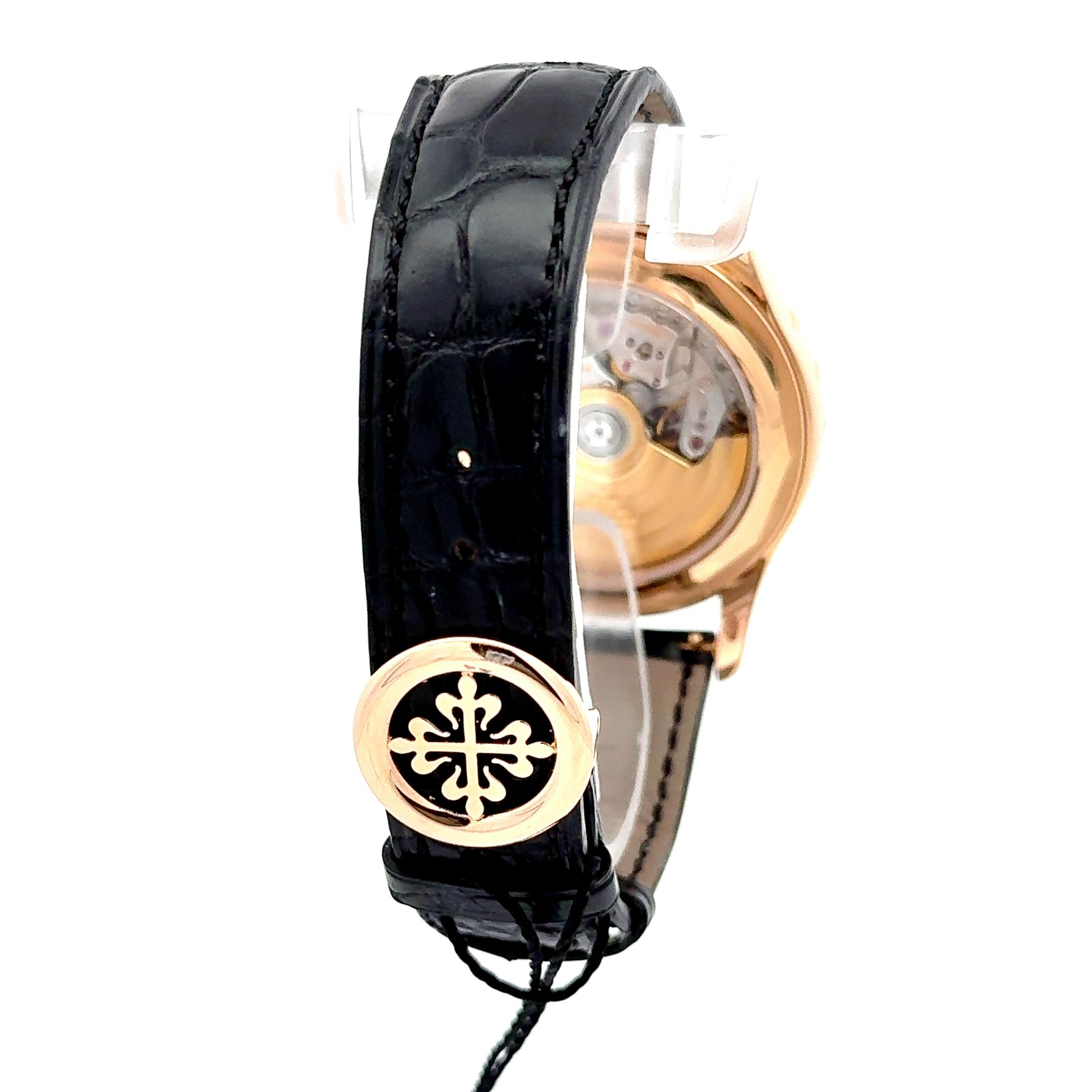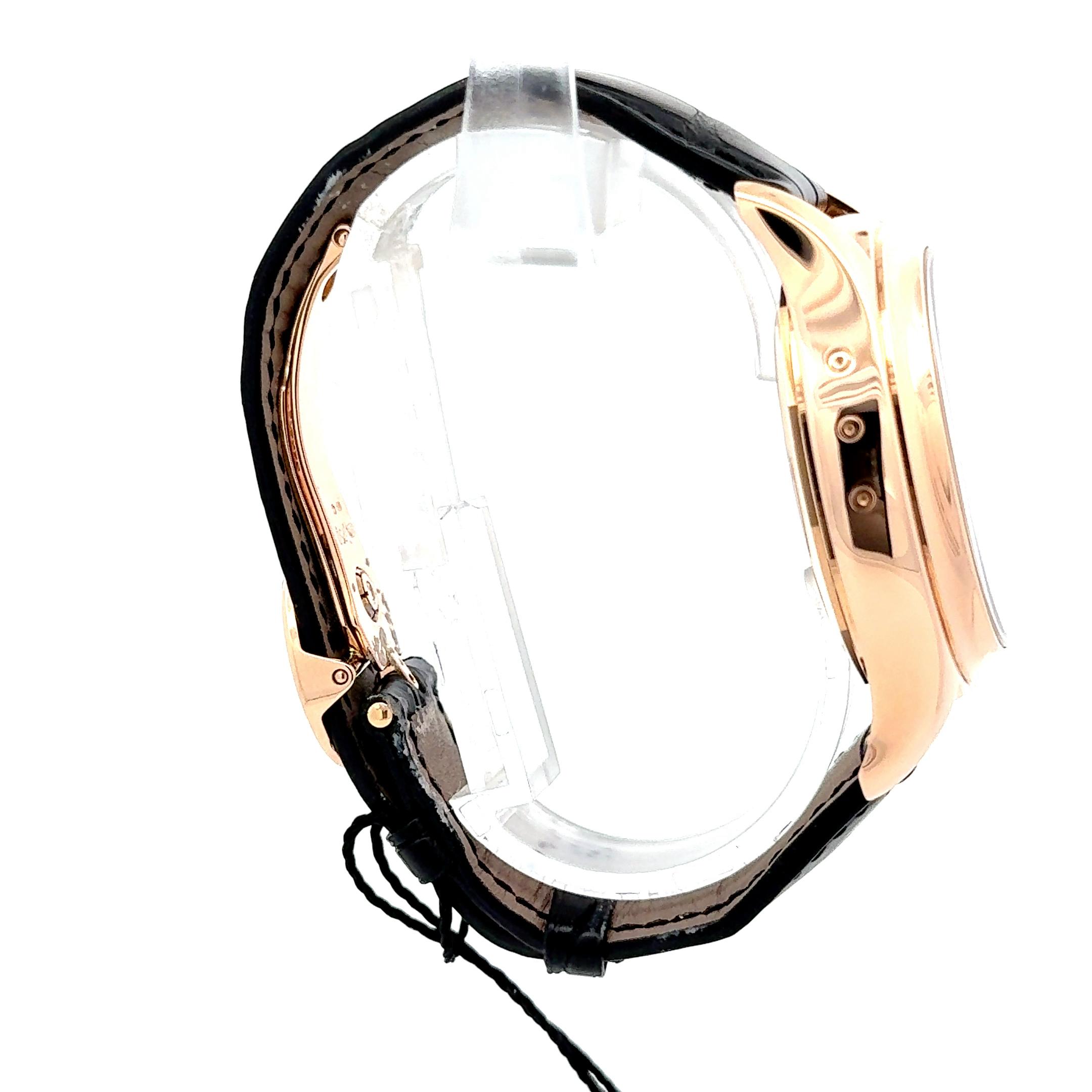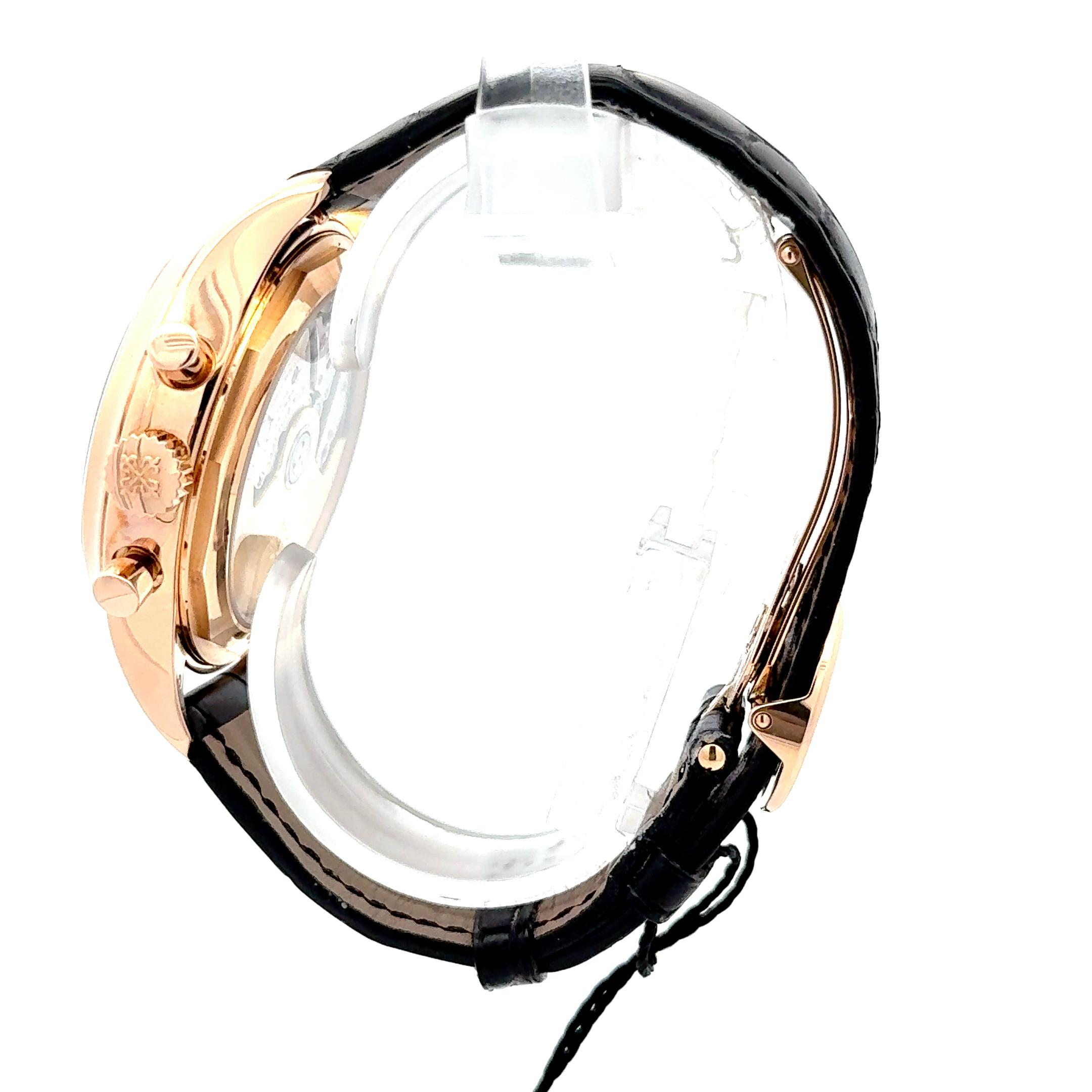 Patek Philippe 5960R-001 housed in a polished 18K rose gold case measuring 40.5 mm, this watch is both elegant and functional, embodying the Geneva manufacture’s hallmark craftsmanship. The striking sunburst grey dial features contrasting white subdials and applied rose gold hour markers, offering excellent legibility and a sporty-luxury aesthetic. The dial layout includes three apertures along the top, day, date, and month as part of the annual calendar function, which requires adjustment only once per year. Below, a monocounter at 6 o’clock combines the chronograph’s 60-minute and 12-hour registers in a clean, easy-to-read format. There is also a day/night indicator integrated near the top. Inside, the watch is powered by the self-winding Caliber CH 28‑520 IRM QA 24H.
