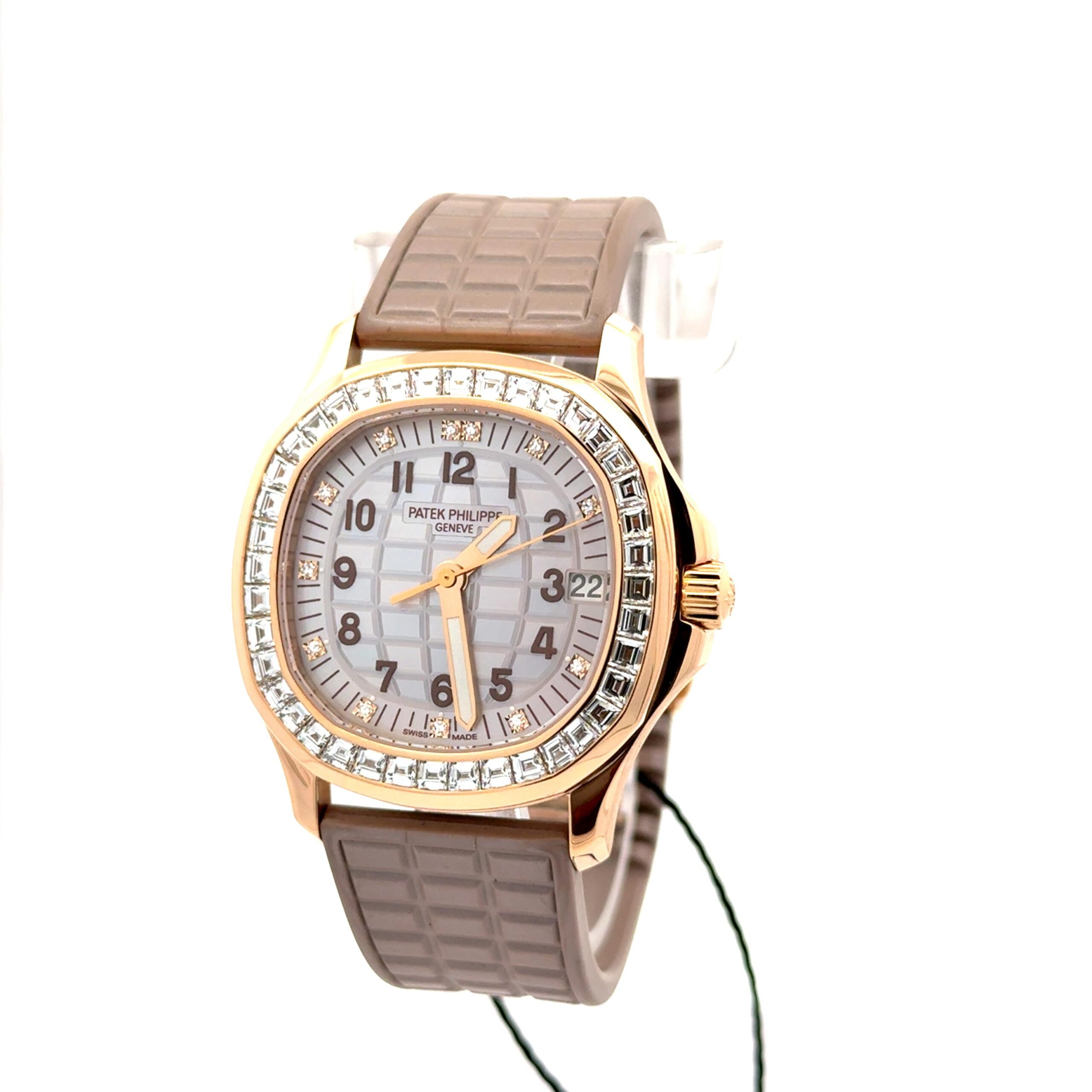 Patek Philippe Aquanaut Luce Haute Joaillerie 5072R-001 is a luxurious women’s timepiece that blends sporty elegance with high-jewelry craftsmanship. It features a 35.6mm 18K rose gold cushion-shaped case with contrasting polished and satin-brushed finishes, complemented by a bezel set with 40 baguette-cut diamonds totaling approximately 2.76 carats. The dial is a beige mother-of-pearl checkerboard pattern with rose gold Arabic numerals and baton-style hands coated with white luminescent material, ensuring legibility. The watch comes with a pearly beige composite strap that includes a fold-over clasp and offers water resistance up to 120 meters (12 ATM). The transparent sapphire crystal case back allows a view of the movement, while the tropical composite strap is resistant to wear, UV, and saltwater, making it as durable as it is exquisite. With a total diamond weight of approximately 3.1 carats and meticulous gem-setting techniques, the 5072R-001 perfectly balances functionality, luxury, and craftsmanship, making it a standout piece for collectors and enthusiasts alike.