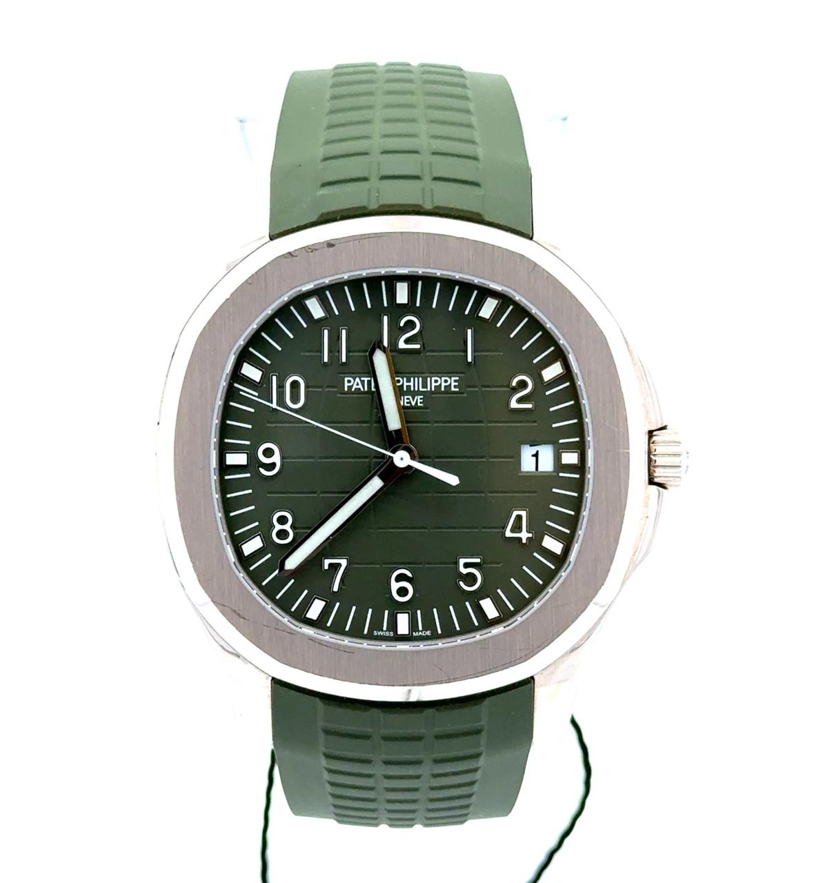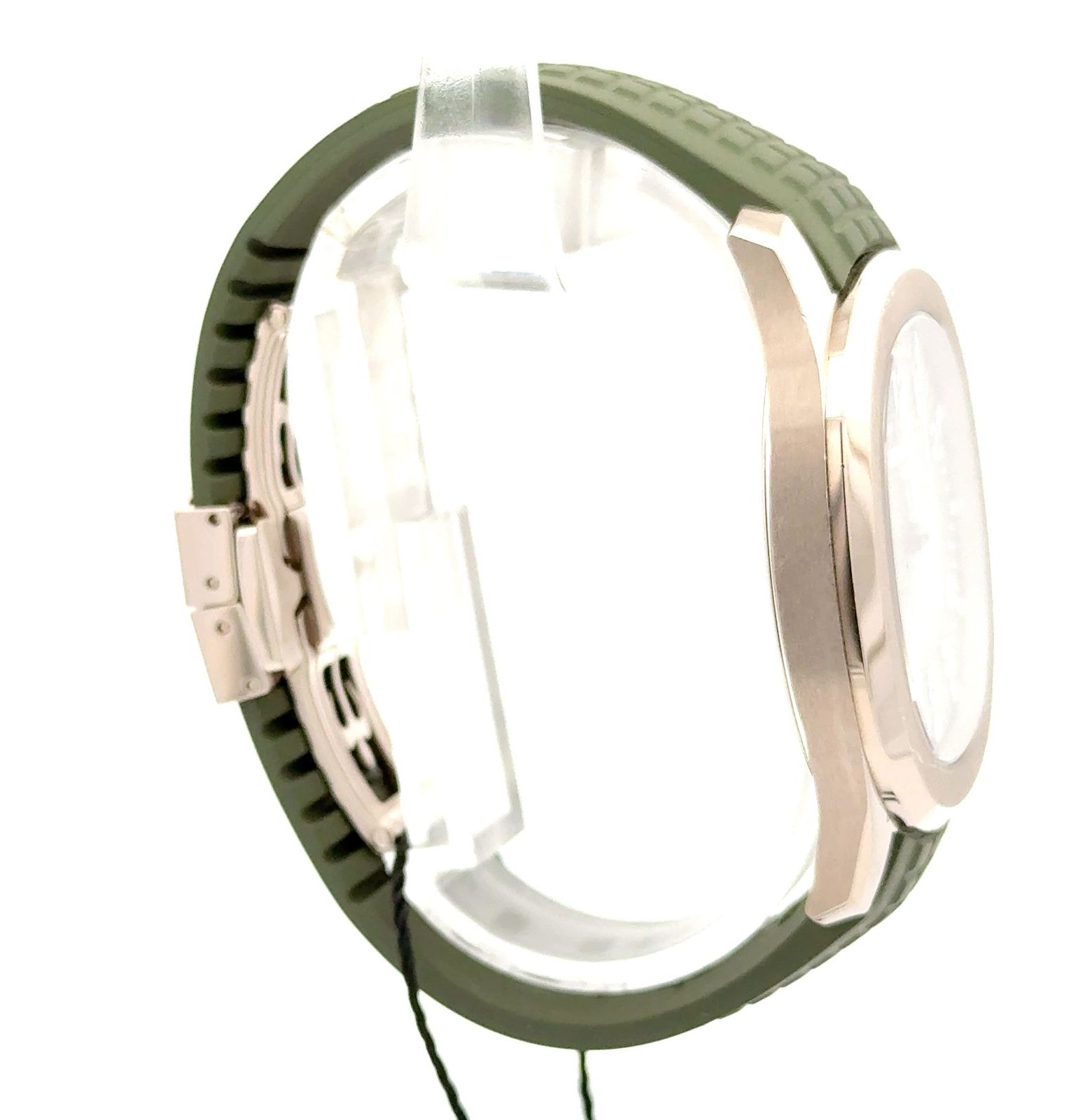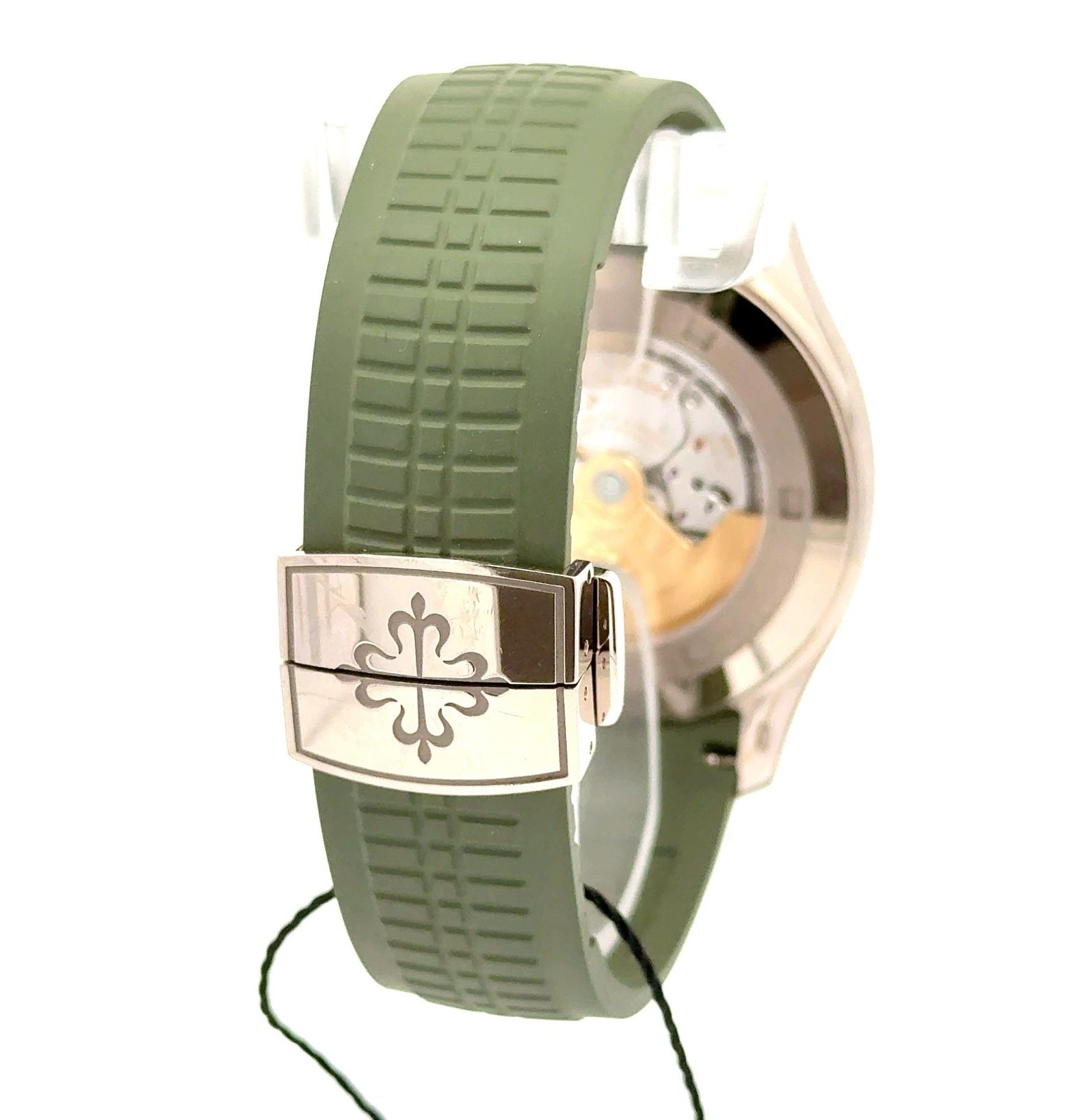 Patek Philippe 5168G-010 features a 42.2mm white gold case that is polished to a high sheen, giving it a refined and premium appearance. The stunning green dial with a subtle gradient pattern, adds depth and uniqueness to the watch. Its iconic “tropical” rubber strap in a matching green tone is both durable and comfortable, providing an ideal fit for an active lifestyle while offering a stylish contrast to the white gold case. This model is powered by the self-winding Caliber 324 S C movement, delivering precise timekeeping and reliability. The watch is water-resistant up to 120 meters, making it perfect for aquatic activities without sacrificing elegance. The date complication at 3 o'clock and the distinctive embossed dial pattern further enhance its functional and visual appeal.