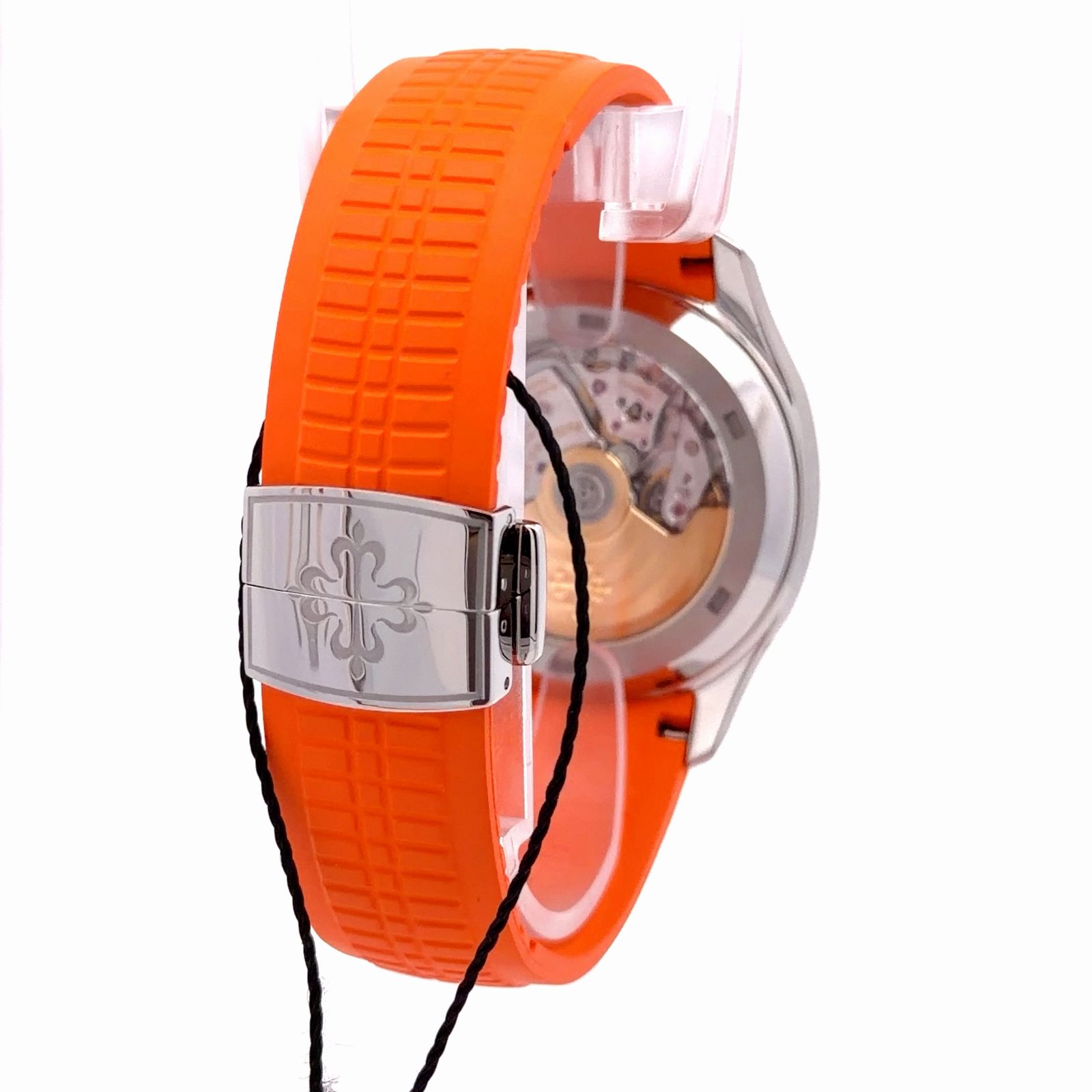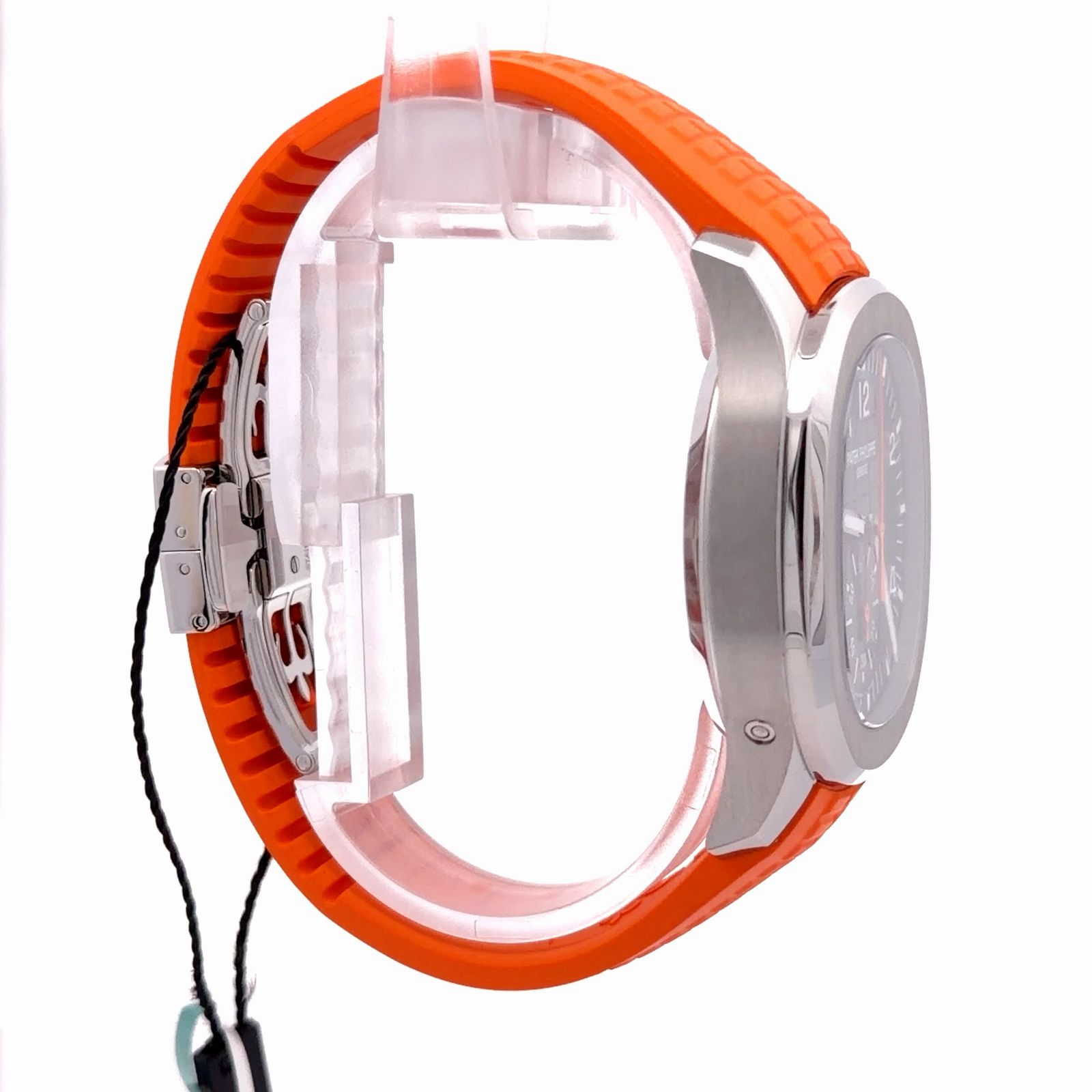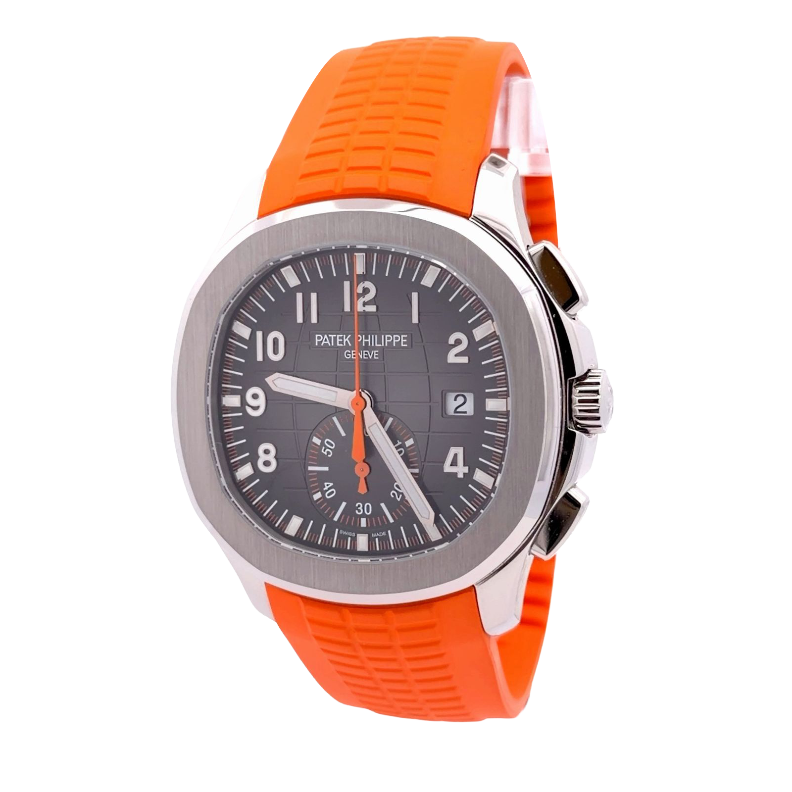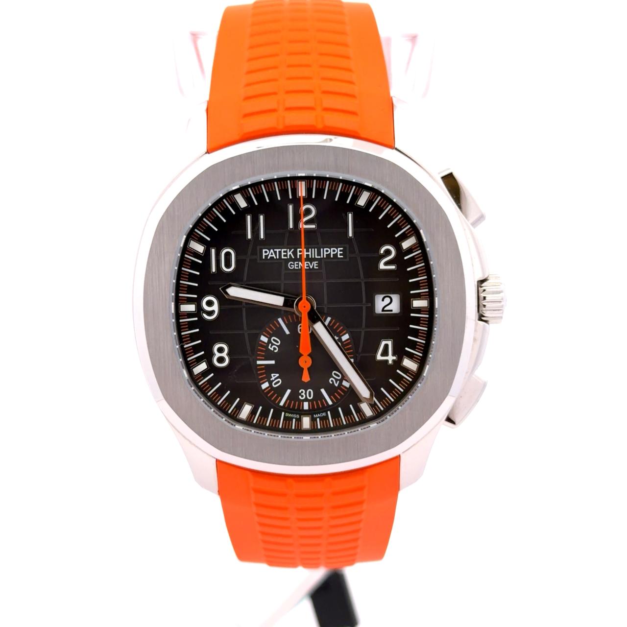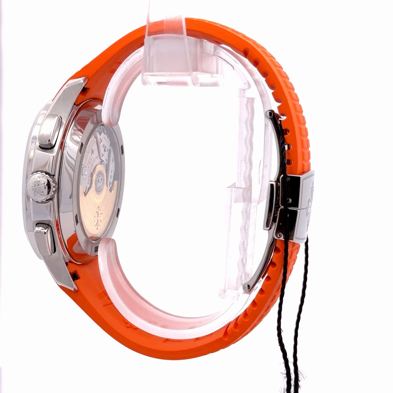 Patek Philippe Aquanaut 5968A‑001 is a modern luxury sports chronograph crafted in stainless steel, featuring a black embossed dial with vibrant orange accents, luminescent white‑gold numerals, and a bold orange “tropical” strap for a striking, contemporary look. Powered by the self-winding flyback CH 28‑520 C movement, it offers precise timekeeping with a central chronograph seconds hand, a 60-minute counter at 6 o’clock, and a practical date window at 3 o’clock. The watch showcases Patek Philippe’s signature finishing through a sapphire case back, boasts 120 m water resistance, and combines sporty durability with refined elegance, making it perfect for active lifestyles while retaining the timeless craftsmanship and sophistication the brand is renowned for.