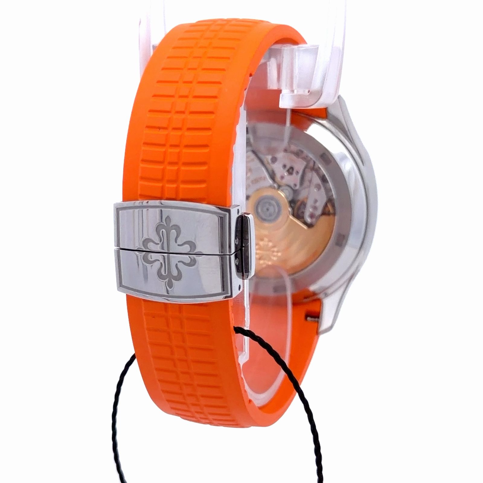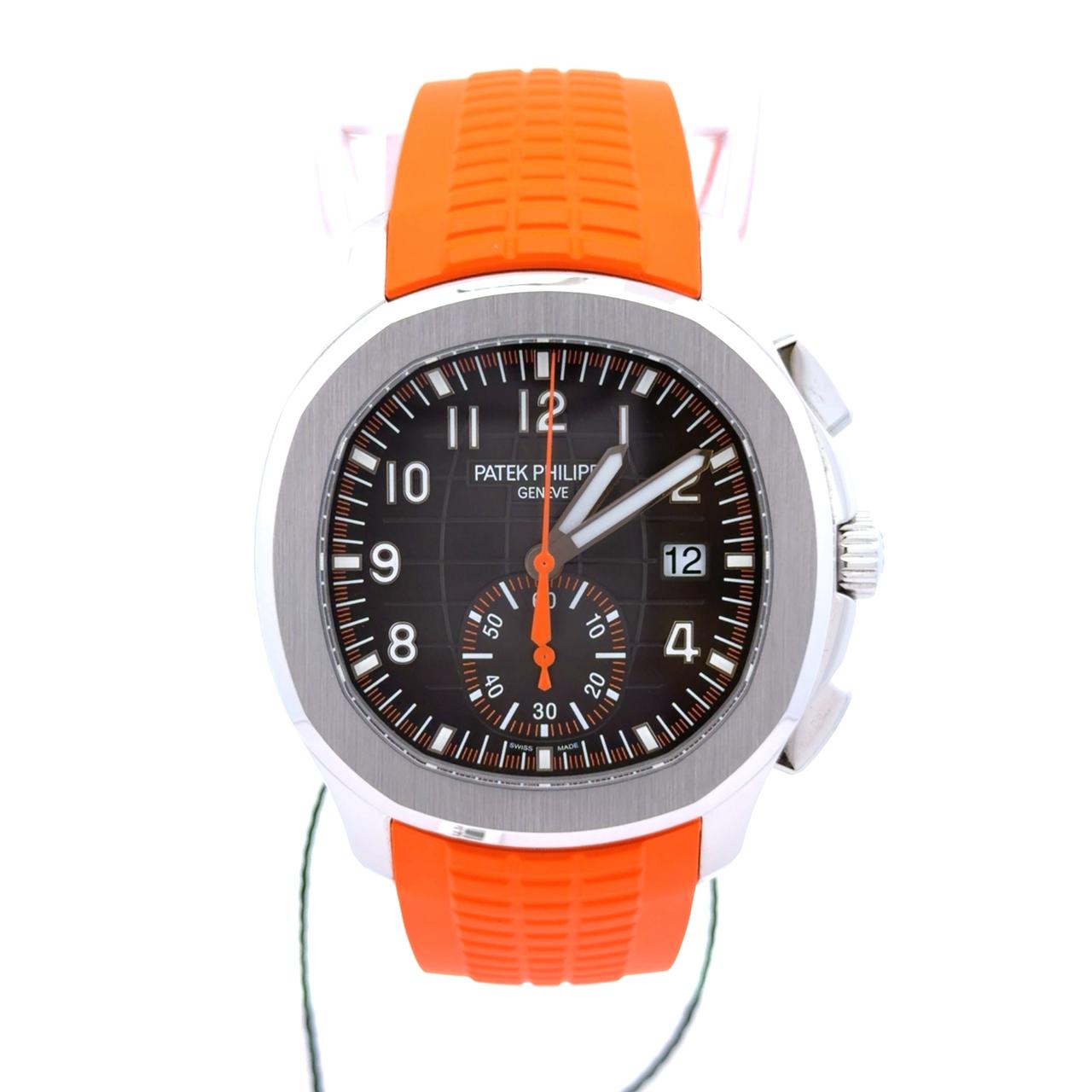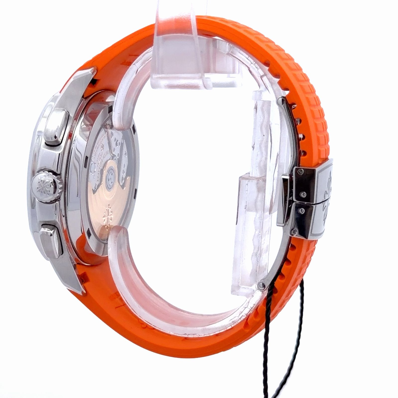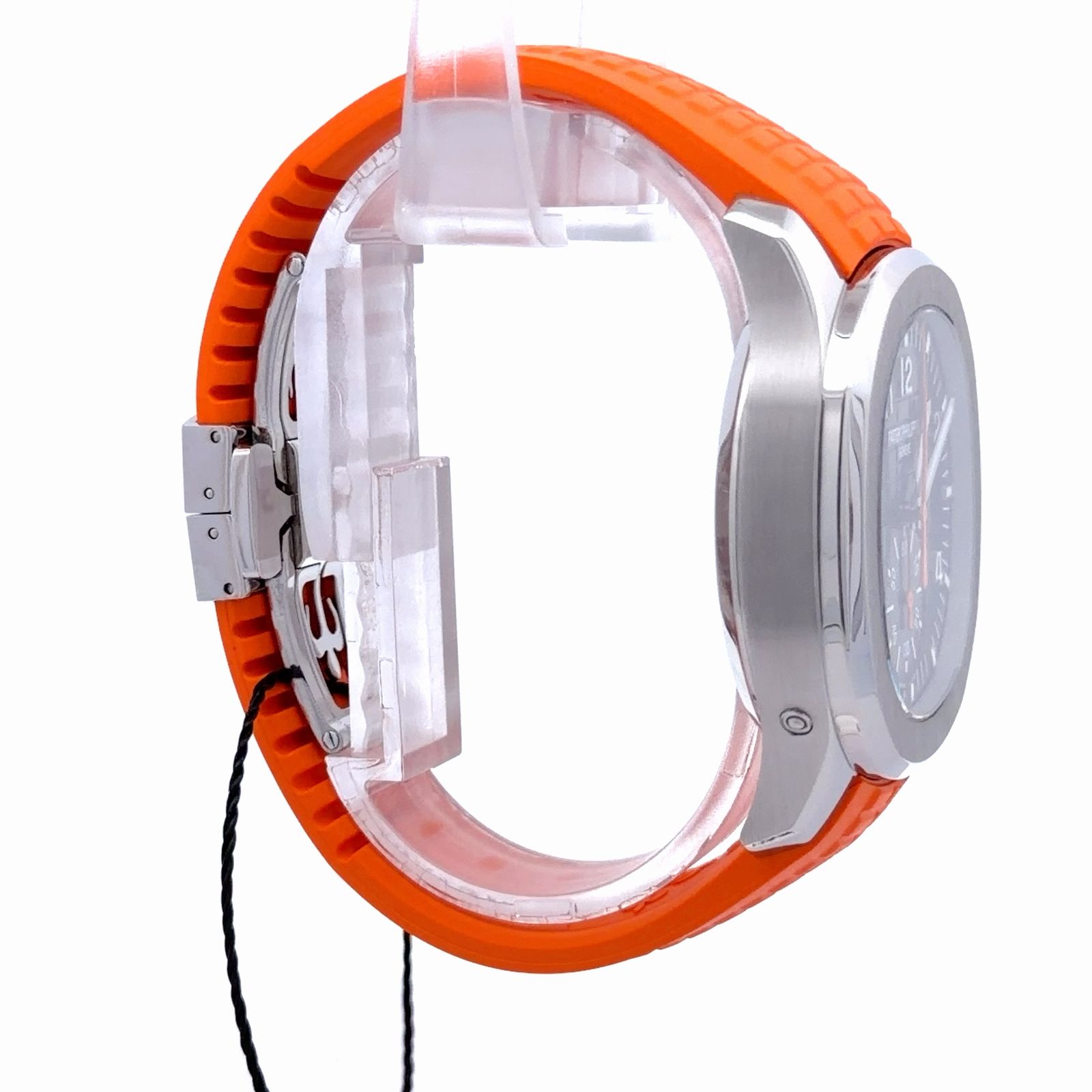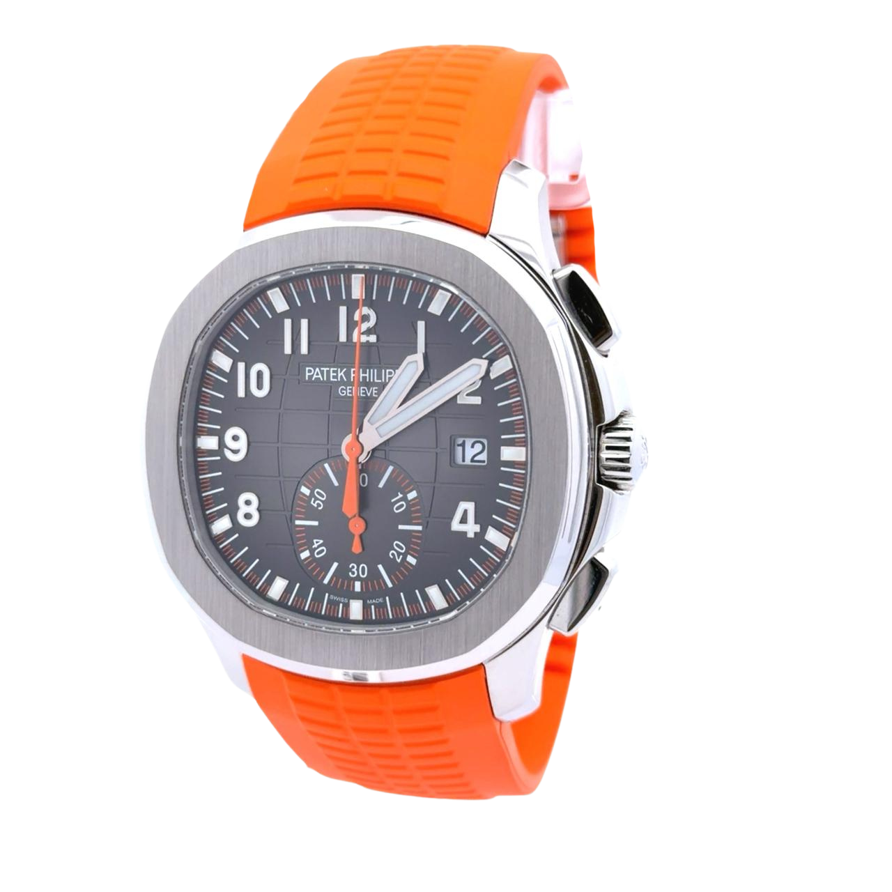 Patek Philippe Aquanaut Ref. 5968A-001 is a dynamic and sporty luxury watch notable for being the first chronograph in the Aquanaut collection. It features a robust 42.2mm stainless steel case with a rounded octagonal bezel that has contrasting polished and satin finishes. The black embossed dial, which has a distinct checkerboard pattern, stands out with vibrant orange accents on the chronograph hands and the peripheral minute track. The applied white gold Arabic numerals and broad baton hands are coated with a luminescent material for excellent legibility in low light. The timepiece is powered by Patek Philippe's in-house self-winding Caliber CH 28-520 C, a flyback chronograph movement that integrates a traditional column wheel with a modern, virtually friction-free vertical disk clutch, allowing the central chronograph hand to double as a running seconds hand.