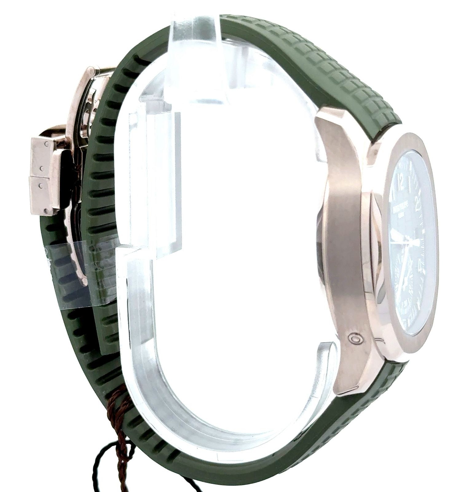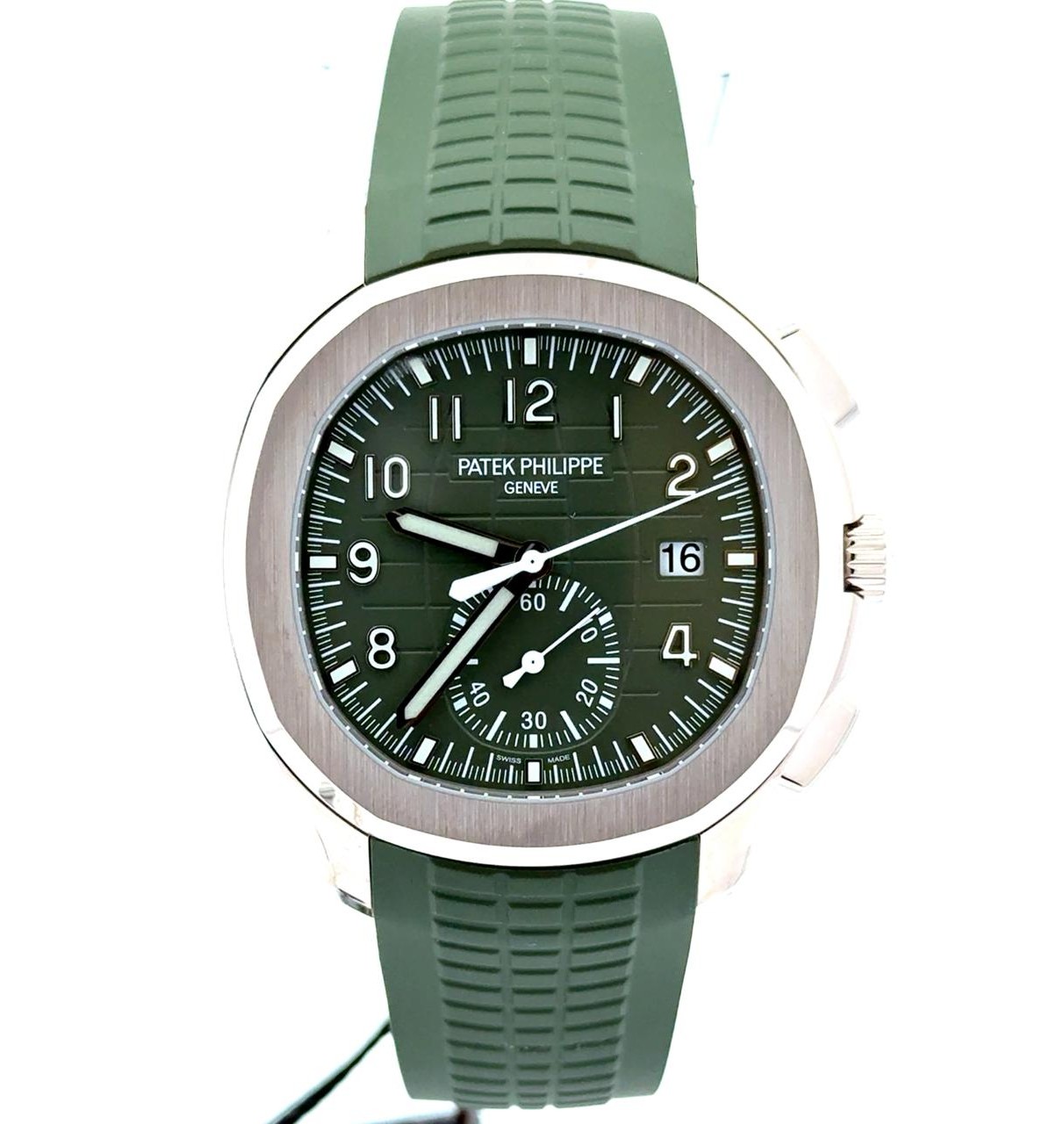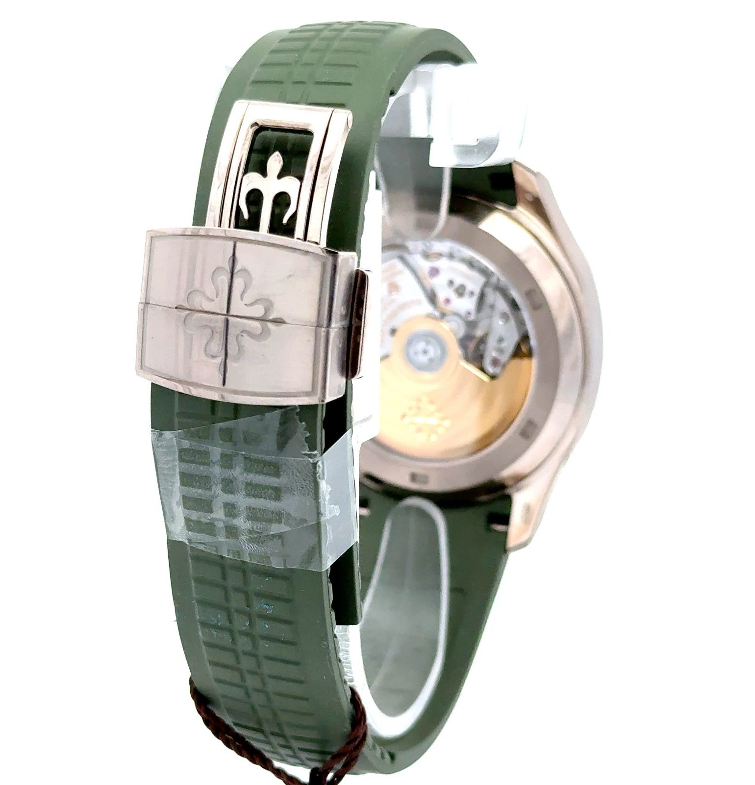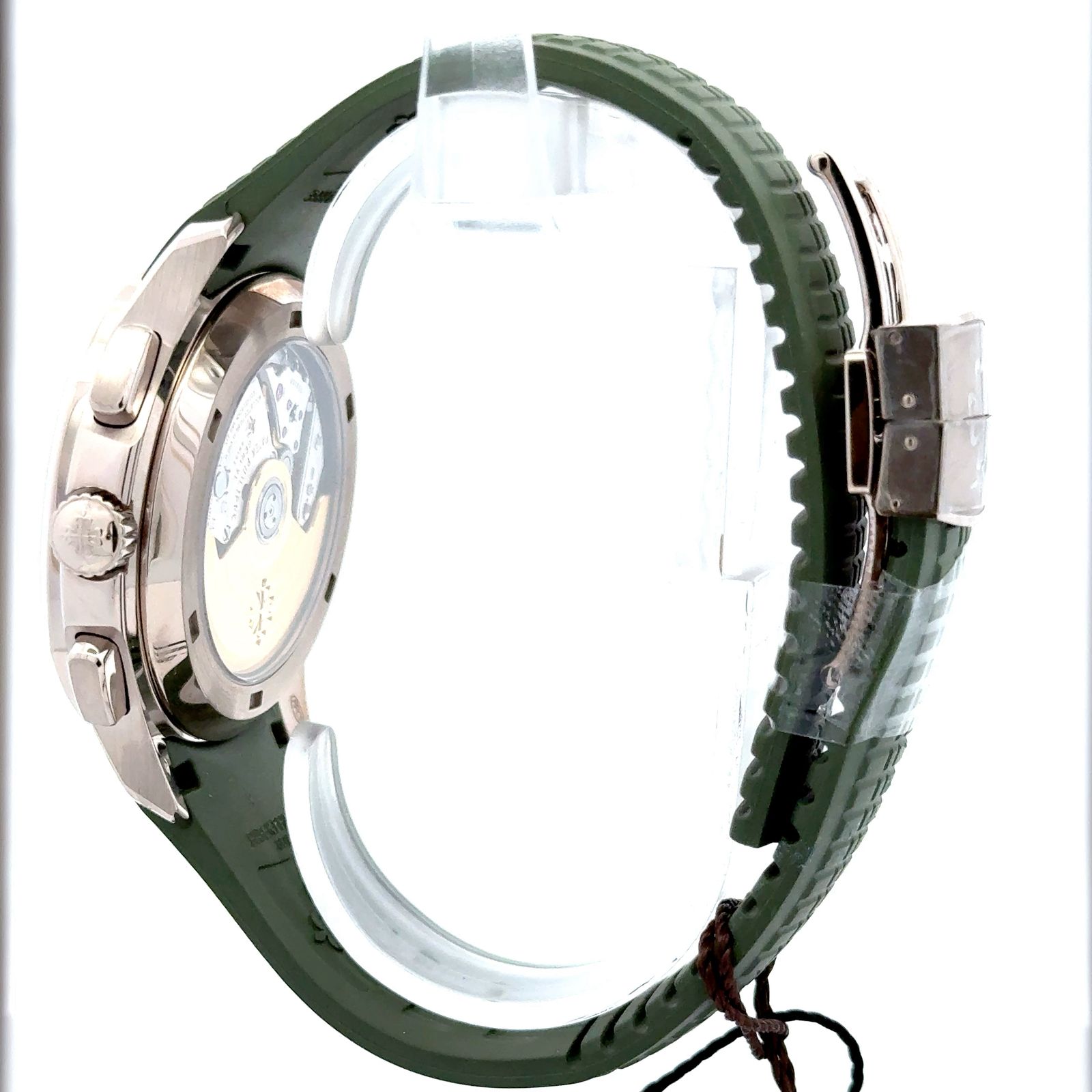 Patek Philippe Aquanaut 5968G-010 is the ideal combination of sportiness and elegance, giving it a luxury yet modern appearance. In stark contrast to the shining white gold casing, the 42mm case has a green dial. This watch offers comfort and flair with its distinctive rounded octagonal bezel and integrated rubber band, which are hallmarks of the Aquanaut brand. With its superb craftsmanship and innovative functionality, the 5968G-010 is a unique addition to any collection, powered by Patek Philippe's precision mechanical movement. For individuals seeking a stunning watch that combines luxury and performance, the Aquanaut 5968G-010 is the ideal companion due to its dynamic design and unmatched craftsmanship.