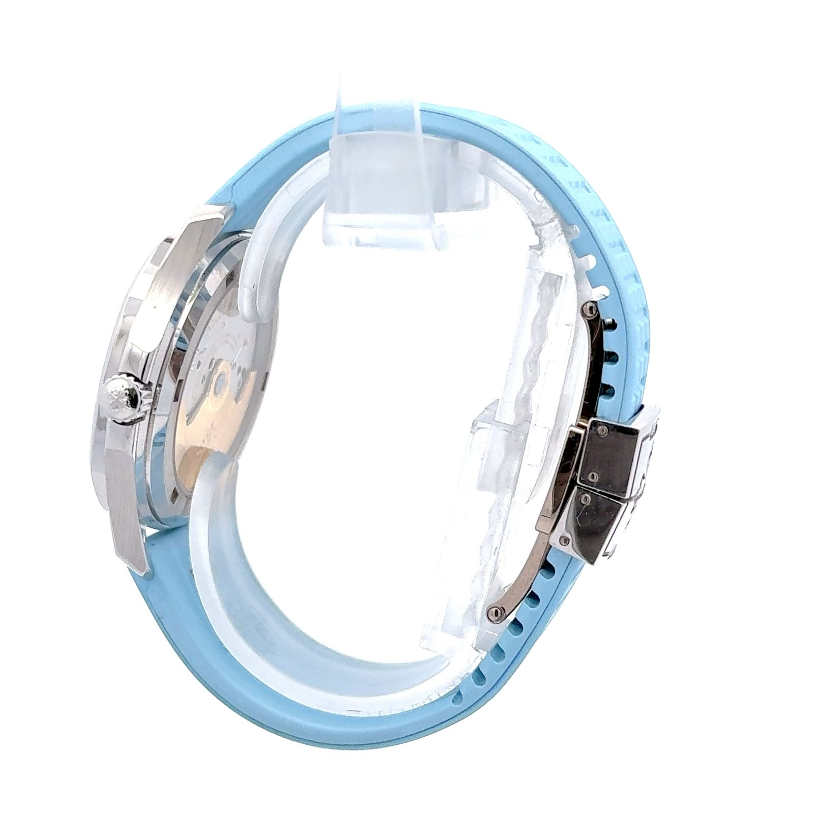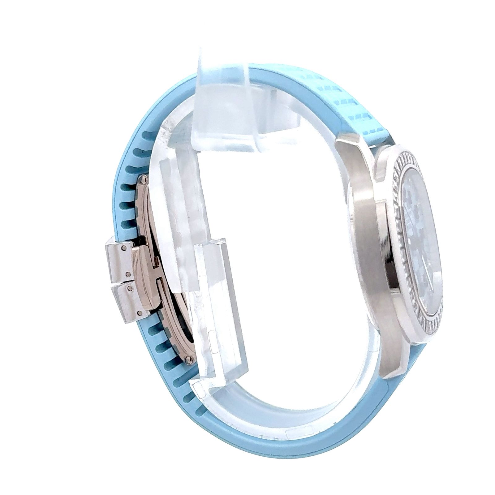 Patek Philippe Aquanaut Ref. 5072G-001 is a stunning fusion of sporty elegance and luxurious craftsmanship, designed for those who appreciate both technical excellence and refined aesthetics. Housed in a 36 mm white gold case, this exquisite timepiece features a gem-set bezel adorned with high-quality diamonds, elevating its sophisticated appeal. Powered by the self-winding Caliber 324 S C movement, it offers a 35-hour power reserve and showcases Patek Philippe’s hallmark precision and reliability. The blue dial features a captivating pattern that complements the matching blue strap, creating a bold yet elegant statement on the wrist. With a water resistance of 10 ATM, the watch is as functional as it is luxurious, suitable for both daily wear and special occasions. The strap is secured with a steel buckle clasp, ensuring both comfort and durability. The Aquanaut 5072G-001 is a perfect representation of Patek Philippe’s ability to blend sportiness with high jewelry, making it a standout piece in any collection.