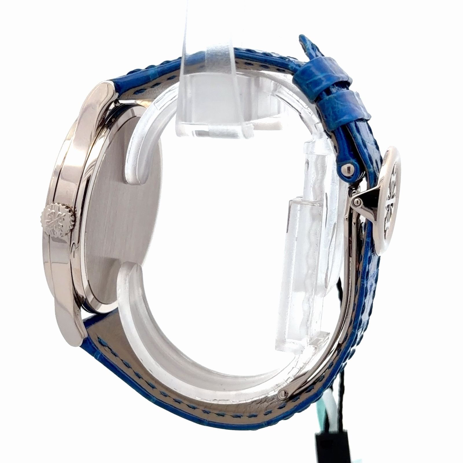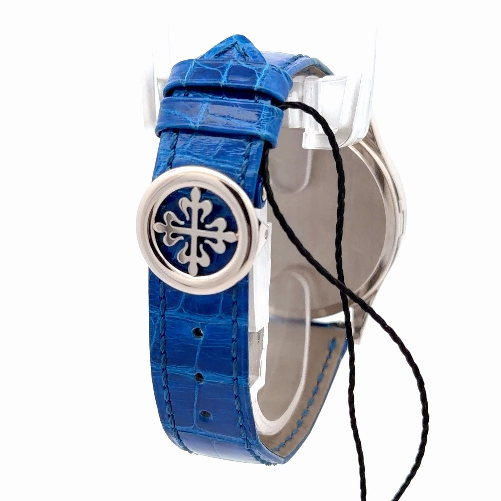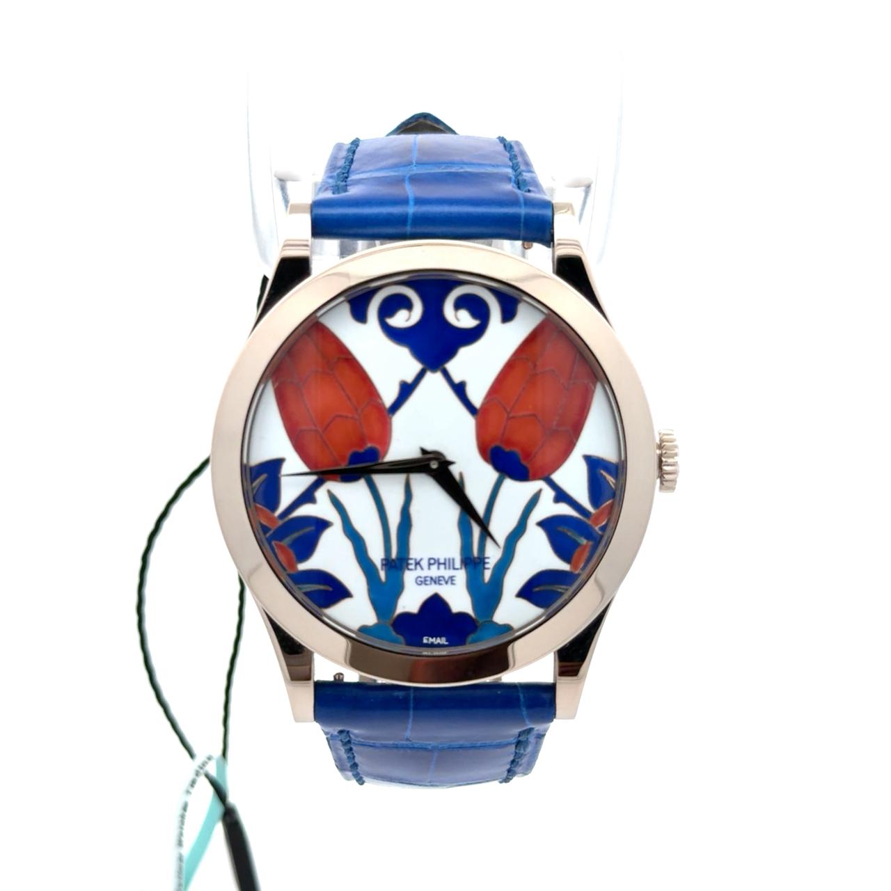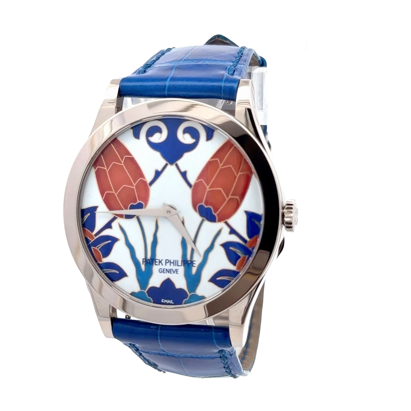 Patek Philippe Calatrava 5089G-024 is an exceptional timepiece from the Rare Handcrafts collection, designed to showcase the brand's mastery of artisanal techniques. Housed in a 38.6mm white gold case, this limited edition model is particularly noted for its exquisite dial, which features two Ottoman-inspired tulips on a white background, crafted using the meticulous Cloisonné enamel technique with traditional blue and turquoise touches. This artistic composition pays tribute to the, decorative motifs found in Istanbul’s famous mosques, resulting in a unique work of art. Powering this timepiece is the caliber 240, an ultra-thin automatic movement that provides essential hour and minute functions. As part of the prestigious Calatrava line, the 5089G-024 merges unparalleled artistic craftsmanship with technical precision, making it a highly coveted, rare, and sophisticated piece for collectors.