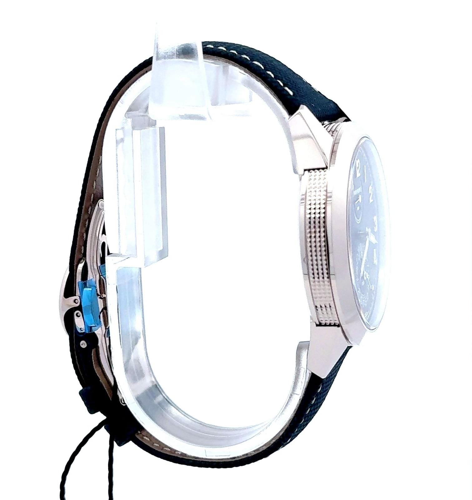 Patek Philippe Ref. 5328G-001 is a masterful reinterpretation of the Calatrava, blending classical elegance with modern mechanical sophistication. Encased in white gold, its 41mm case is distinguished by a full hobnail guilloché pattern around the midcase—a signature flourish that elevates its tactile and visual appeal. The dial is a textured blue with a black-gradient rim, featuring luminous white gold Arabic numerals and syringe-style hands that offer both legibility and refinement. At its heart lies the manually wound caliber 31-505 PS IRM CI J, boasting an impressive eight-day power reserve, displayed via an indicator at 12 o’clock. The watch also features instantaneous jumping day and date displays, with a small seconds subdial above 6 o’clock that integrates seamlessly into the dial’s symmetry. Delivered on a navy blue calfskin strap with a fabric-like texture and a patented triple-blade fold-over clasp, the 5328G-001 is a poetic fusion of heritage and innovation—ideal for collectors who appreciate understated complexity and enduring style.