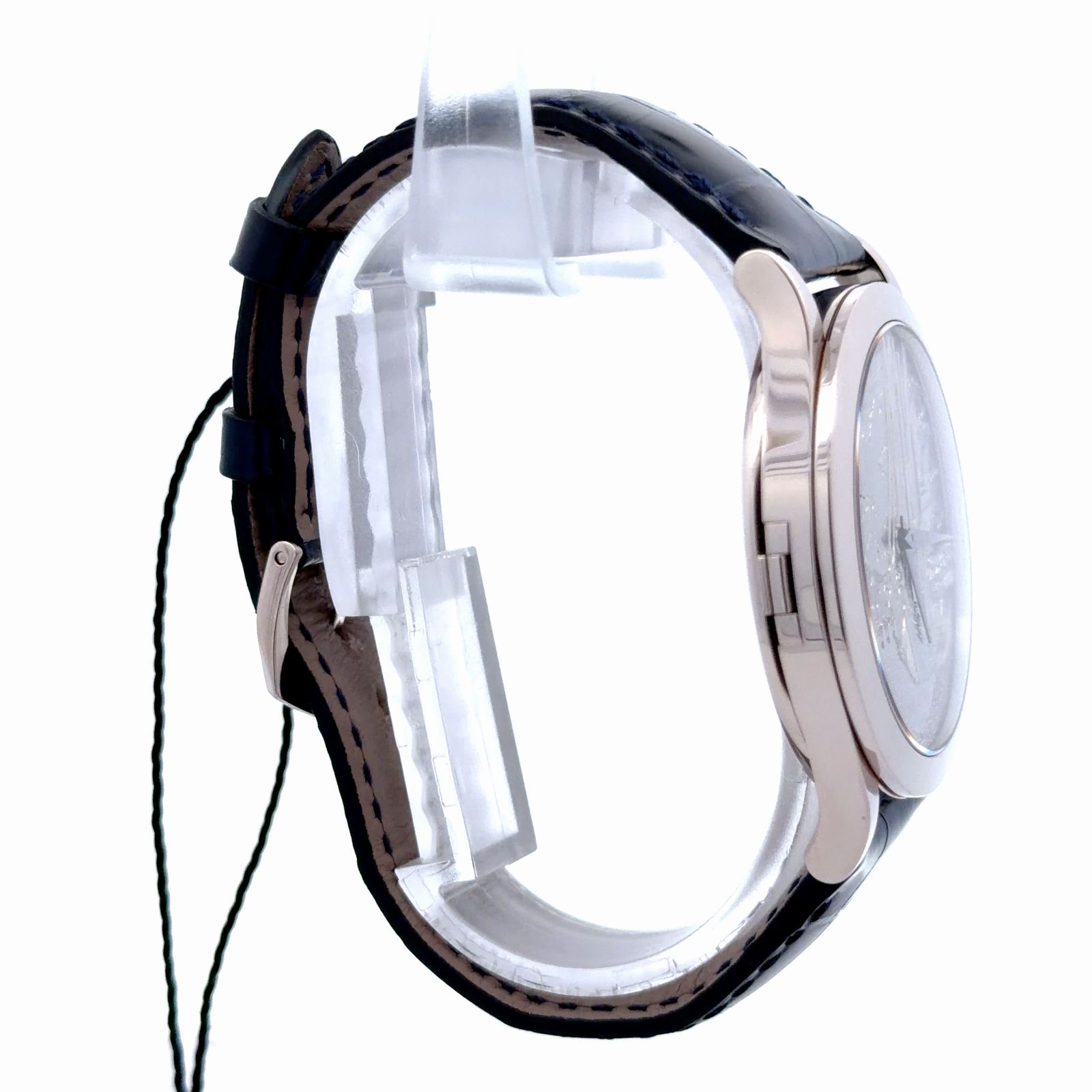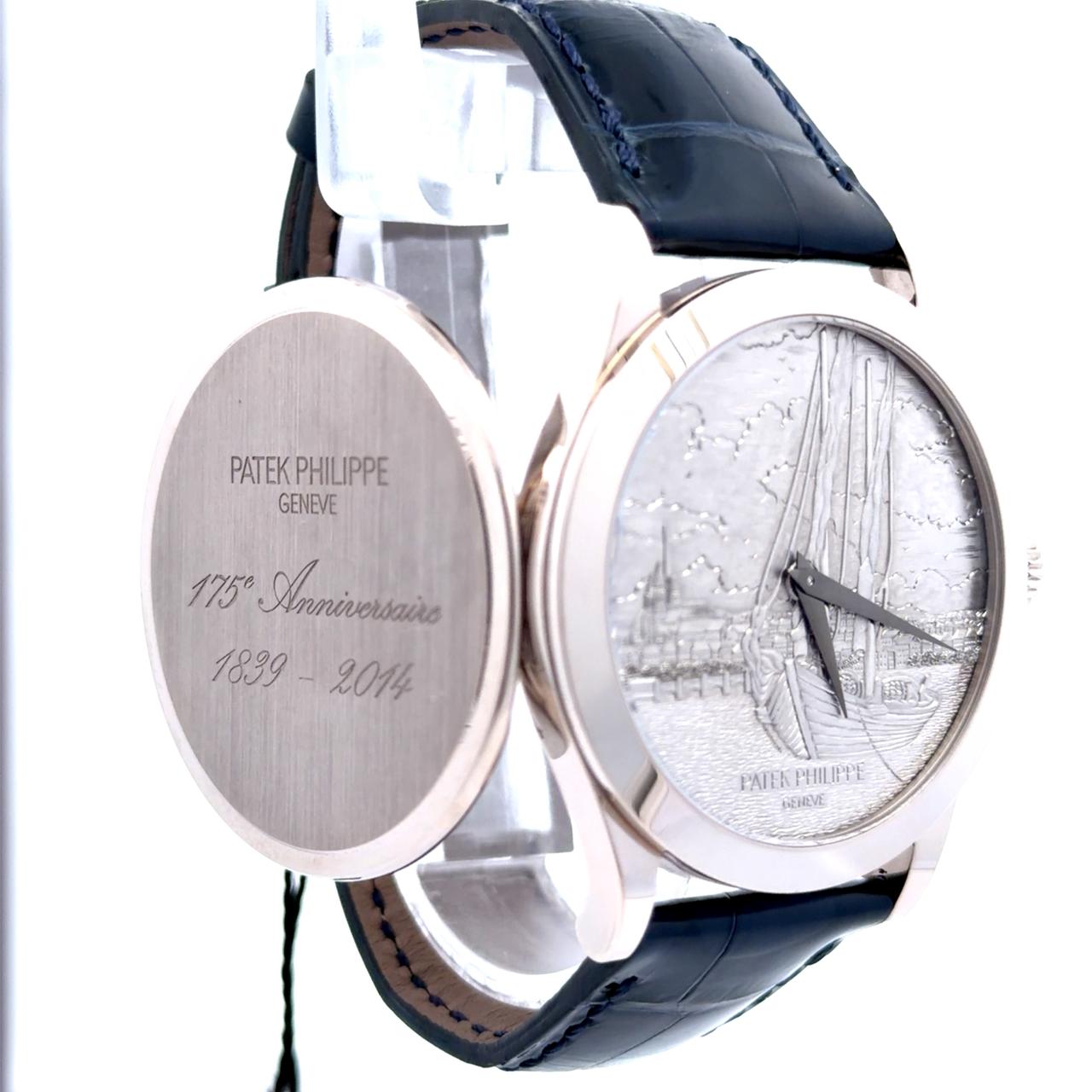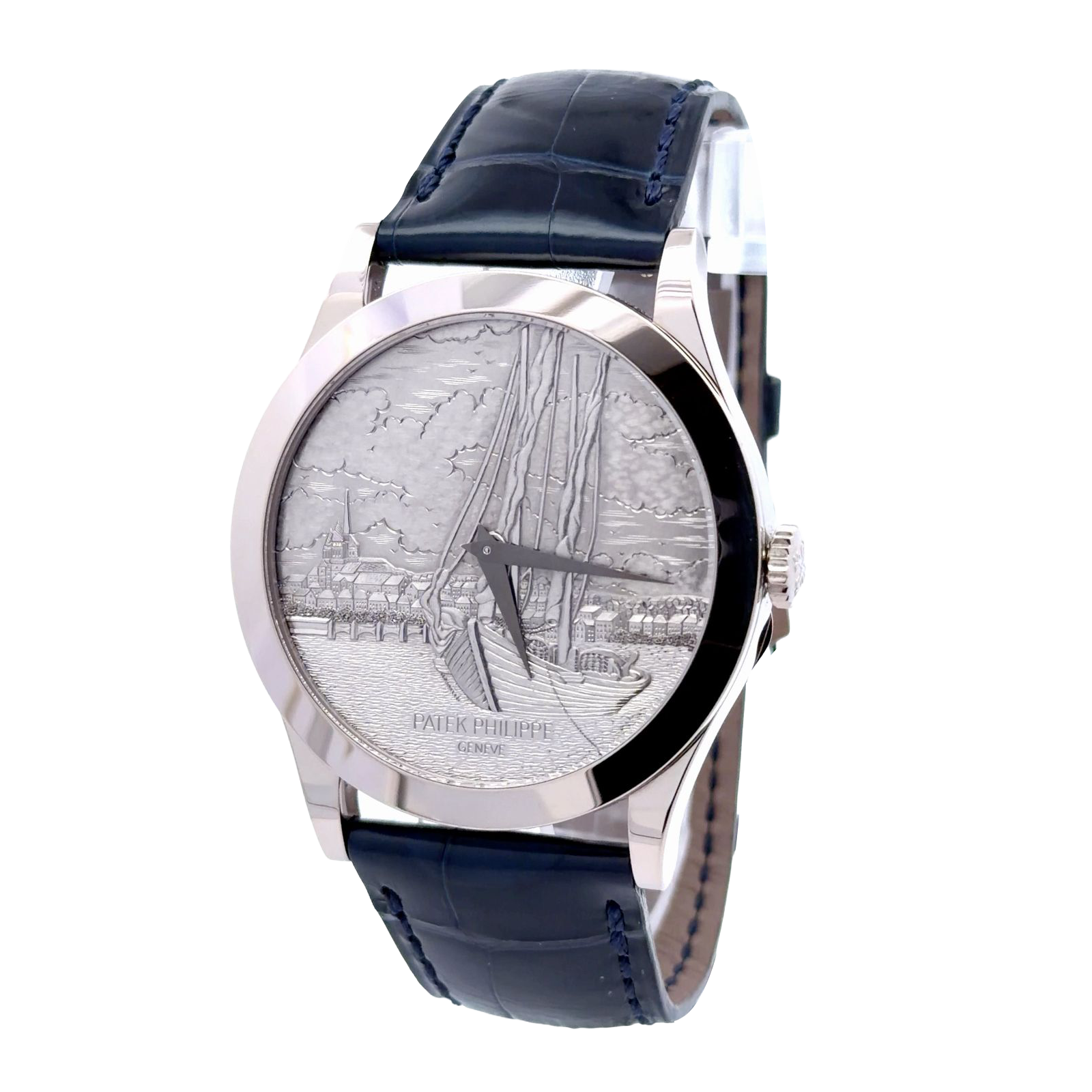 Patek Philippe Ref. 5089G-014 “Geneva Lake” is a rare artistic masterpiece created to commemorate the brand’s 175th anniversary. Crafted in 18k white gold, the 38.6mm Calatrava-style case frames an exquisite hand-engraved and hand-guilloché gold dial depicting a serene scene on Lake Geneva, complete with a sailboat in the foreground and the historic cityscape in the distance. The monochrome relief engraving showcases extraordinary depth and texture, demonstrating the maison’s mastery of decorative arts. Powered by a self-winding mechanical movement and paired with a dark blue alligator leather strap, this limited-production timepiece blends traditional Swiss watchmaking with miniature artistry, making it both a collector’s treasure and a tribute to Geneva, the birthplace of the manufacture.