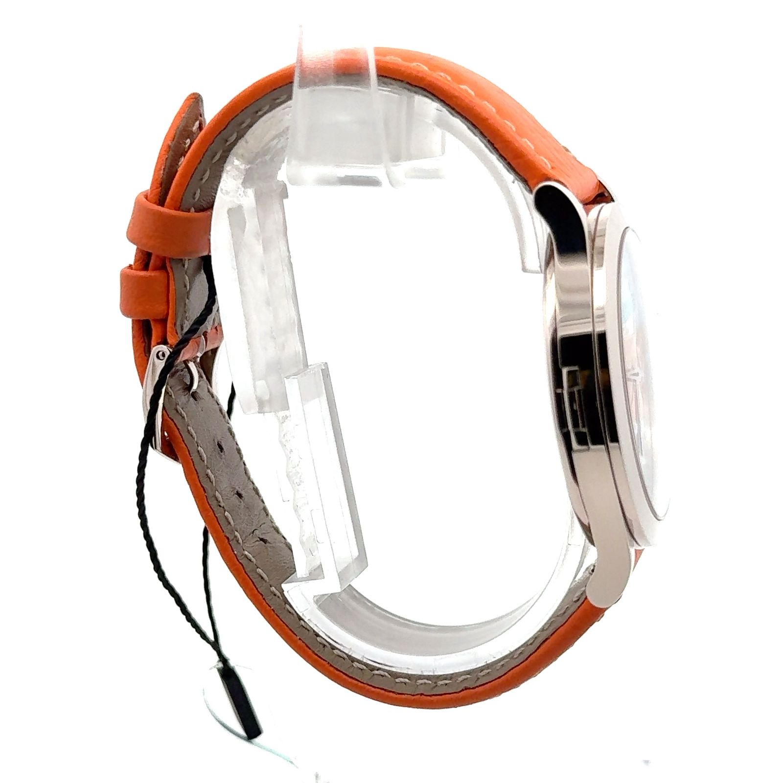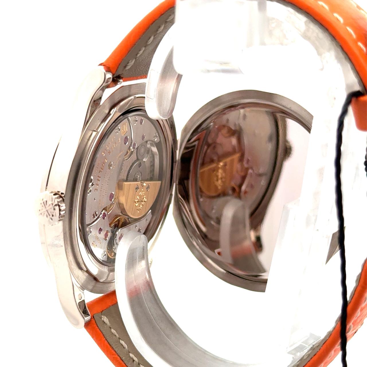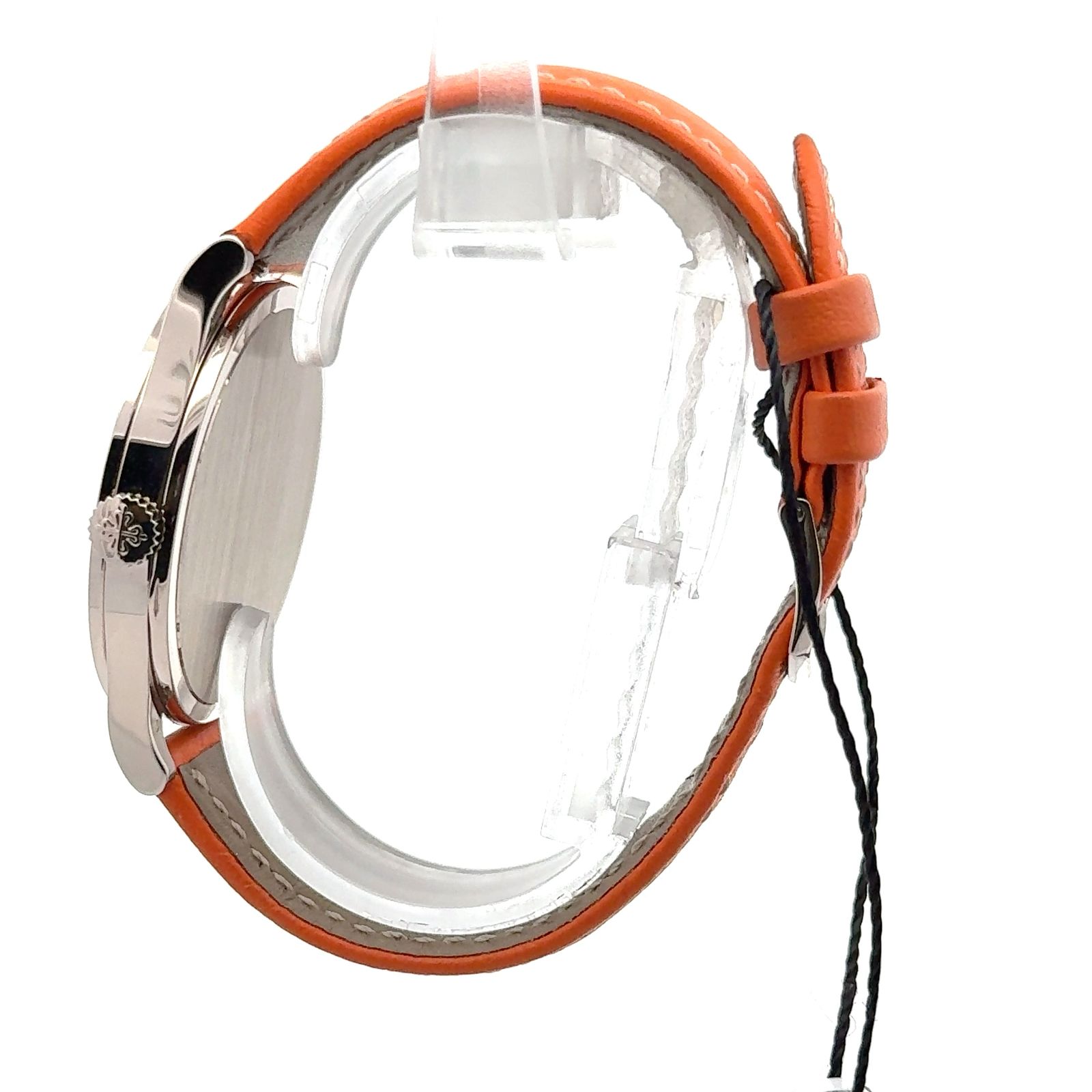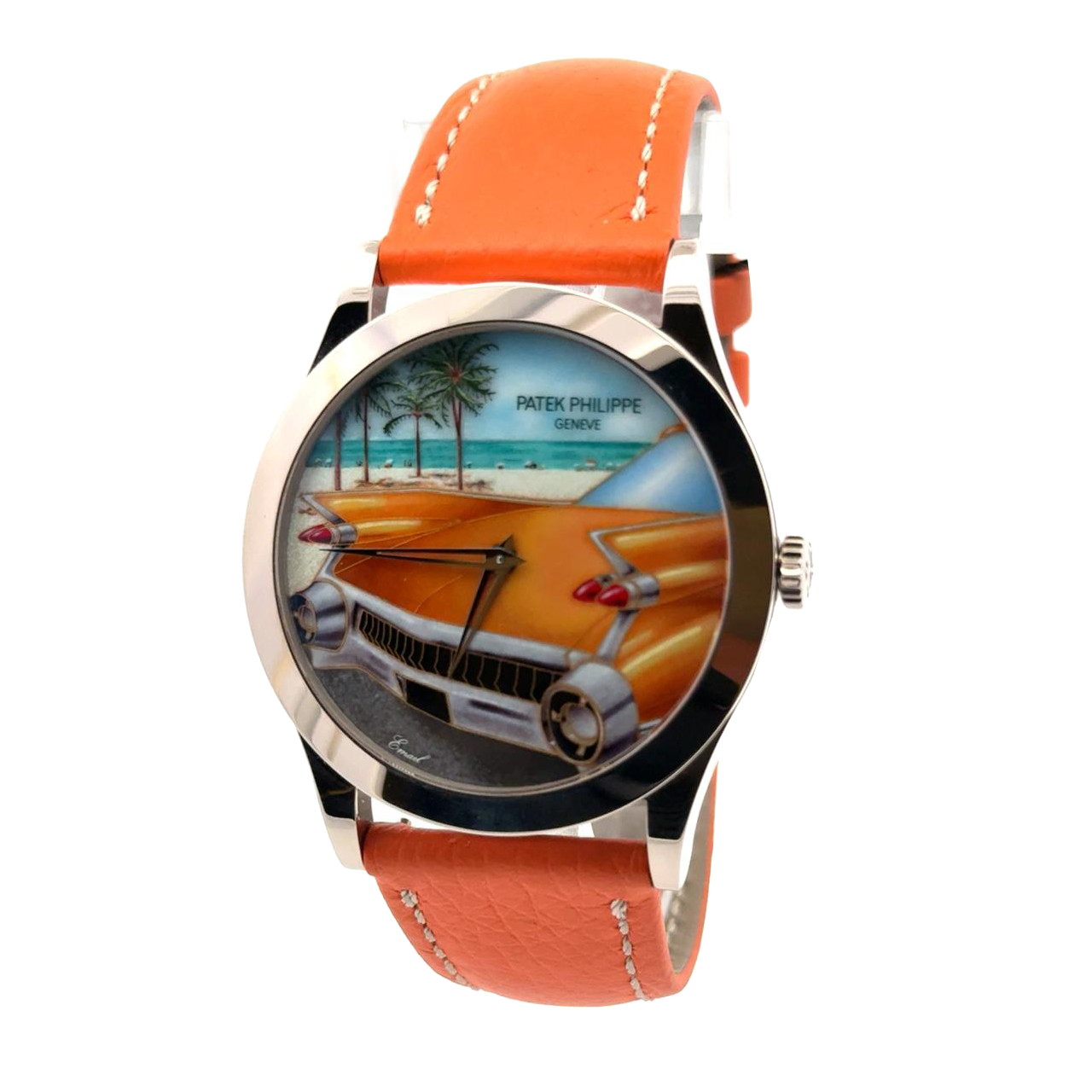 Patek Philippe 5089G-149 “American Beauties” is a dazzling tribute to American nostalgia, blending horological mastery with miniature enamel artistry in one of the brand’s most exclusive Rare Handcrafts creations. This reference belongs to the Calatrava collection and features a 27.5mm case in 18k white gold, designed with understated elegance to let the dial take center stage. The dial showcases a cloisonné enamel painting of a classic orange American convertible parked by a beachside boulevard, complete with palm trees, ocean waves, and a sunlit horizon a vivid homage to California’s golden age of cruising culture. The enamel work is executed entirely by hand, using fine gold wires and multiple firings to achieve its rich color and depth, making each piece subtly unique. Inside, the watch is powered by the ultra-thin self-winding caliber 240, visible through a sapphire crystal caseback, and offering hours and minutes with quiet precision. The watch is paired with a hand-stitched orange alligator leather strap and secured by an 18k white gold pin buckle, echoing the dial’s vibrant palette. With 30 meters of water resistance and a slim 8mm profile, the 5089G-149 is as wearable as it is collectible.