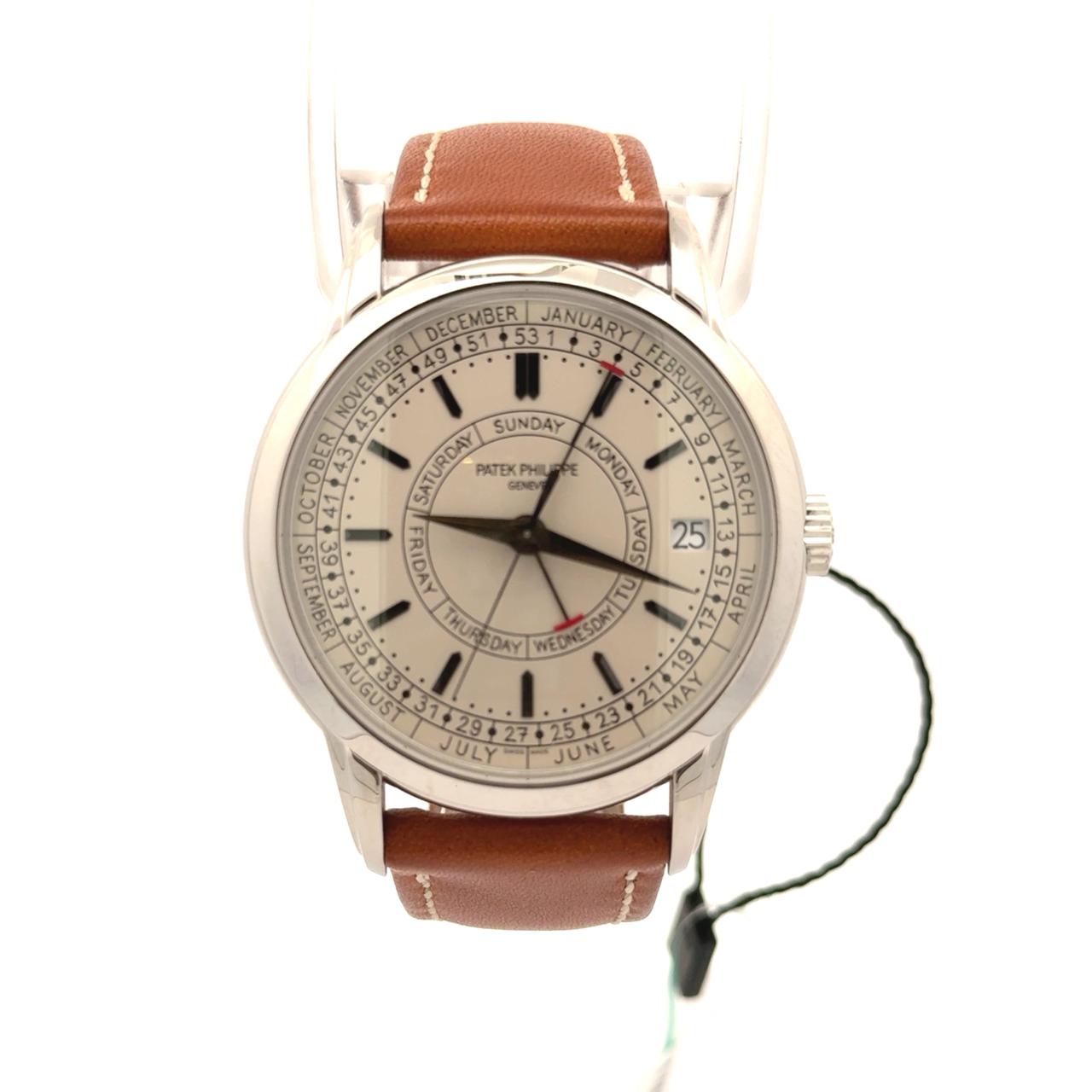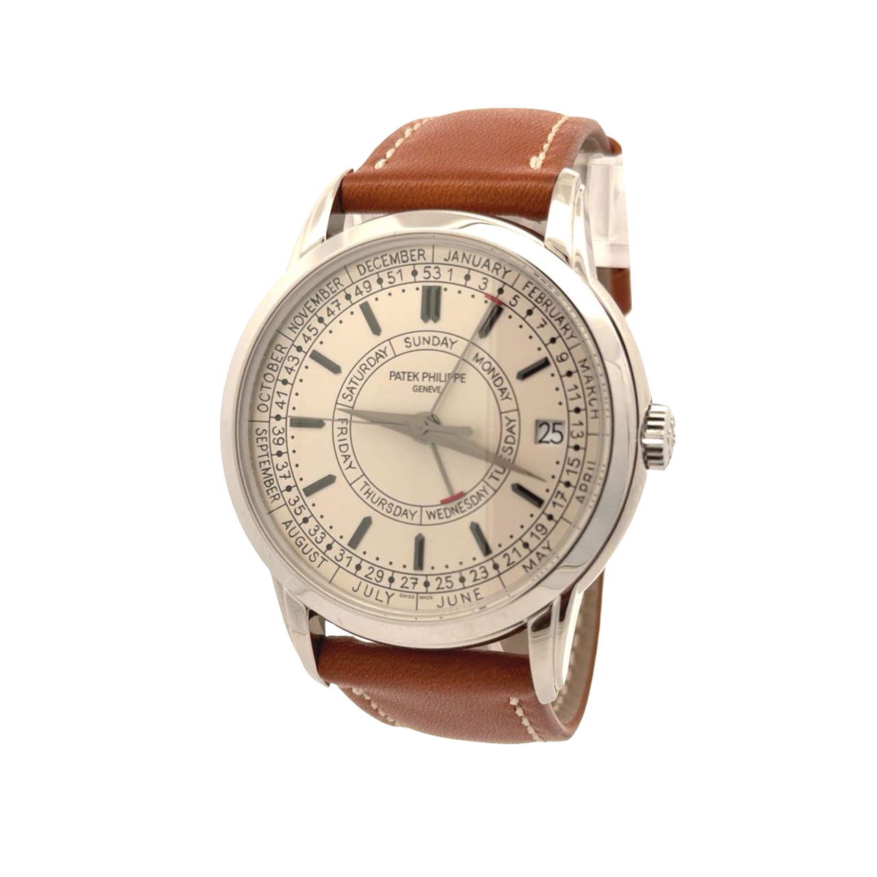 Patek Philippe 5212A-001 Calatrava Weekly Calendar is a rare blend of technical ingenuity and poetic design, housed in a stainless steel case—a notable departure for a complication from the brand. This 40 mm timepiece introduces a new calendar complication that displays not only the day and date, but also the week number and corresponding month, making it especially practical for professionals who plan by week. The silvery opaline dial is distinguished by its handwritten-style typography, a charming nod to personal diaries and analog elegance. Five centrally mounted hands—each delicately faceted—track the hours, minutes, seconds, day, and week, while blackened white gold “obus”-style hour markers and dauphine-style hands enhance legibility and sophistication. Inside beats the Caliber 26‑330 S C J SE, a self-winding movement with optimized performance and a power reserve of 45 hours. The case features a two-tier construction with gently curved lugs, and the watch is paired with a light brown hand-stitched calfskin strap secured by a steel prong buckle. With a sapphire crystal caseback and 30-meter water resistance, the 5212A-001 is as refined as it is functional—a modern complication wrapped in timeless charm.
