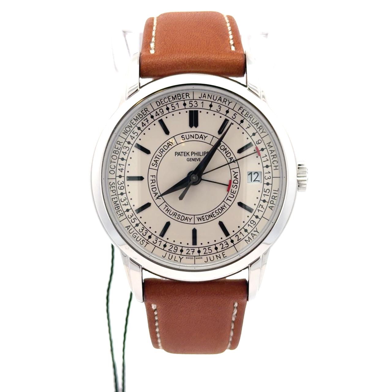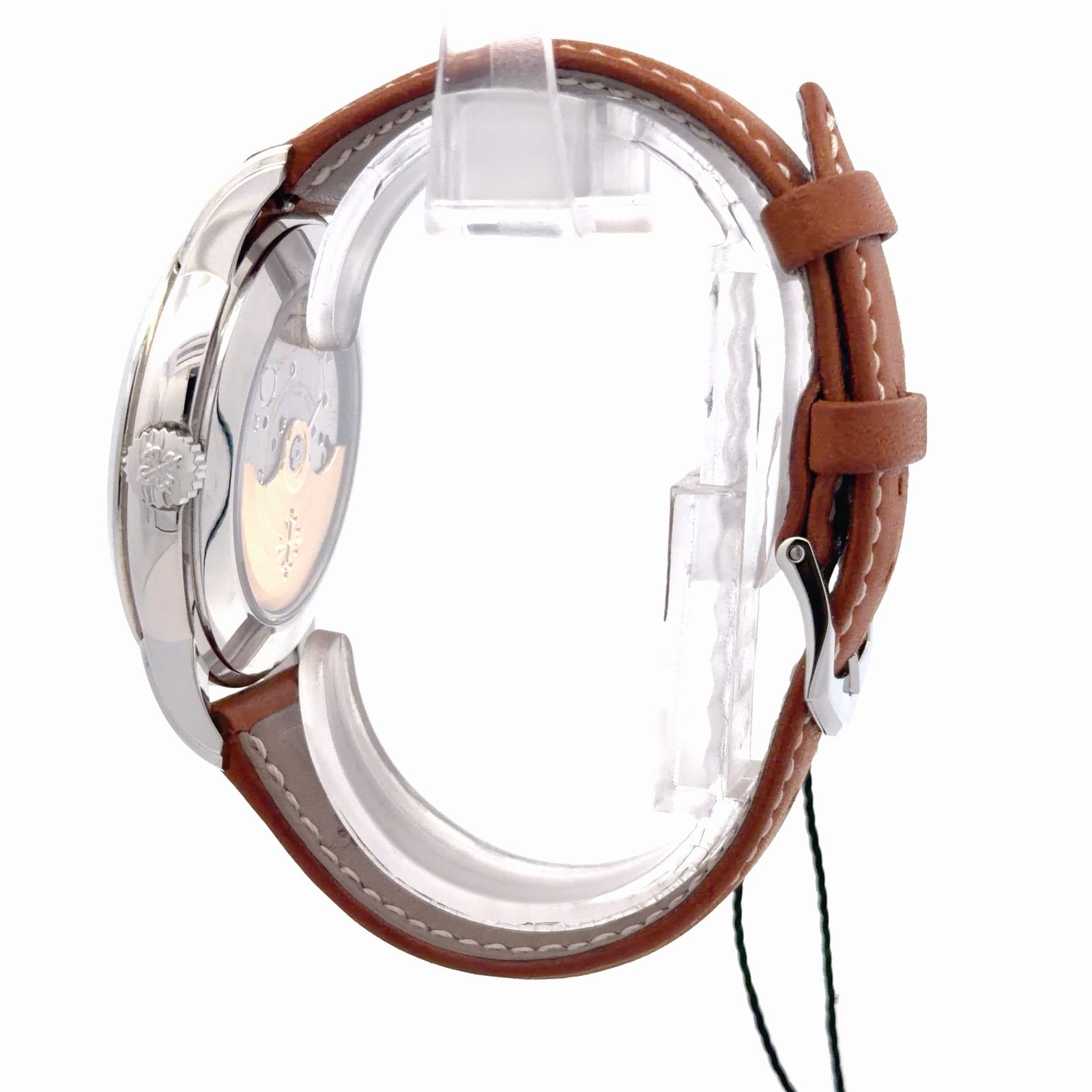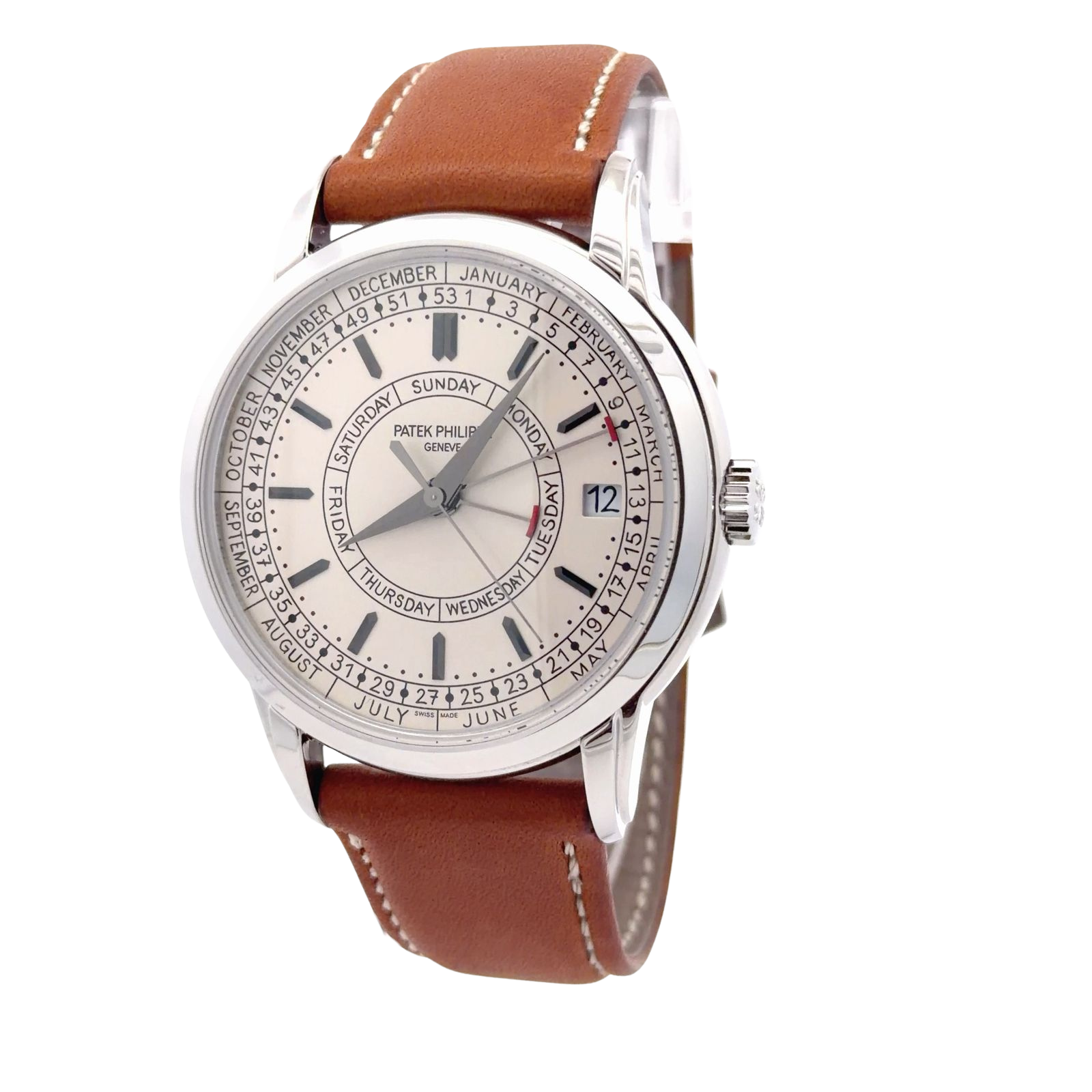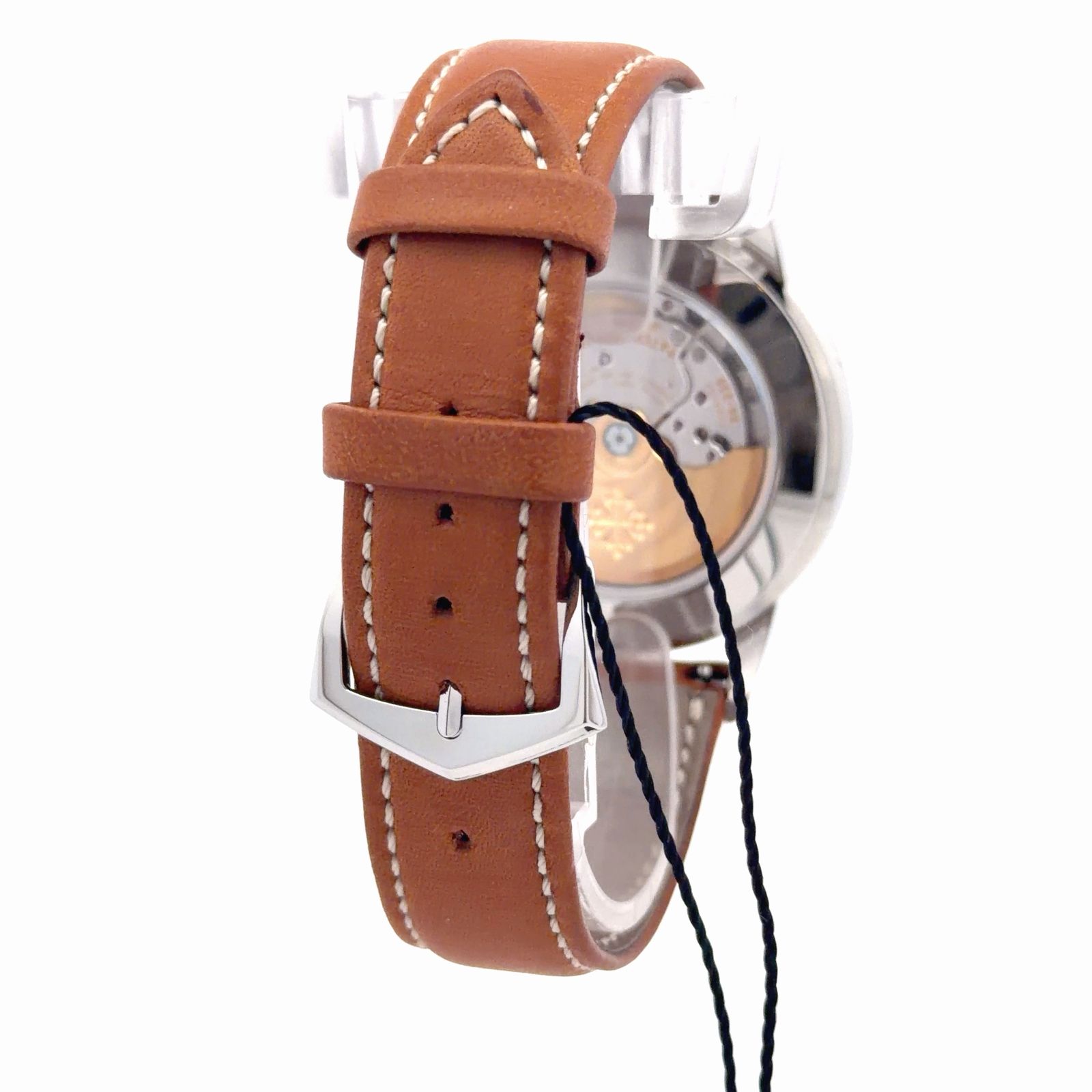 Patek Philippe Calatrava Weekly Calendar reference 5212A-001 is a unique "casual-elegant" complication housed in a 40mm stainless steel case, a rare material choice for a non-sporting Patek Philippe. This timepiece features a distinctive silvery opaline dial notable for its exclusive handwritten-style typography, which gives the calendar indications a personal, artisanal feel. The complex layout utilizes five centrally mounted hands: three for hours, minutes, and seconds, and two hammer-tipped hands with red lacquer to indicate the day of the week on an inner scale and the week number and month on outer concentric tracks. Powering the watch is the automatic Caliber 26-330 S C J SE, an optimized movement visible through a sapphire crystal caseback that includes a 21k gold central rotor and a 45-hour power reserve. Paired with a light brown, hand-stitched calfskin strap, this 30-meter water-resistant watch offers a practical, modern utility rooted in vintage mid-century design.