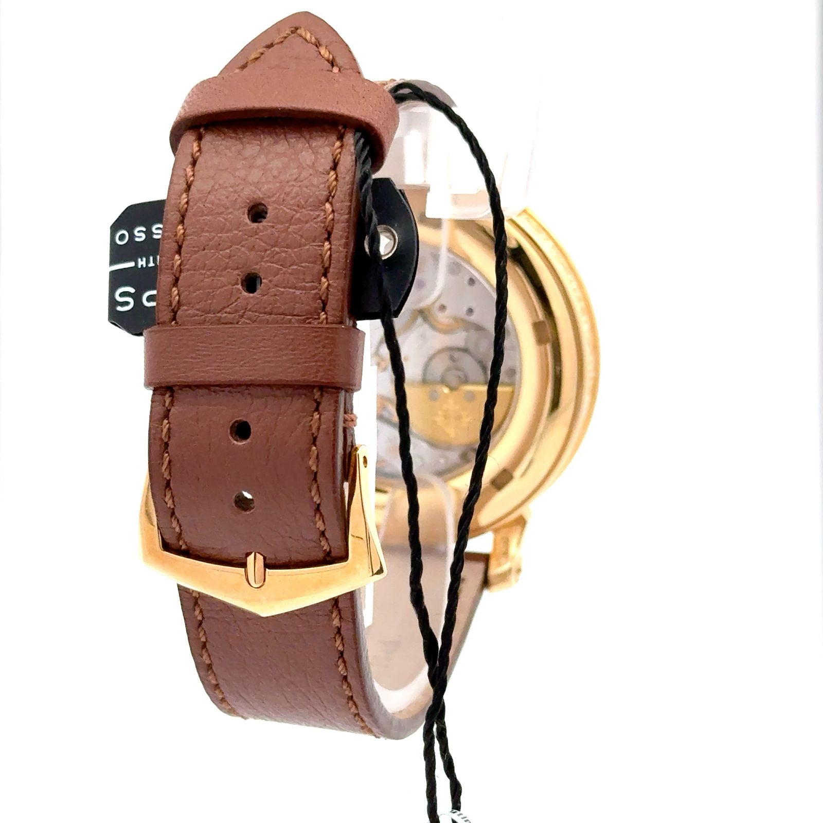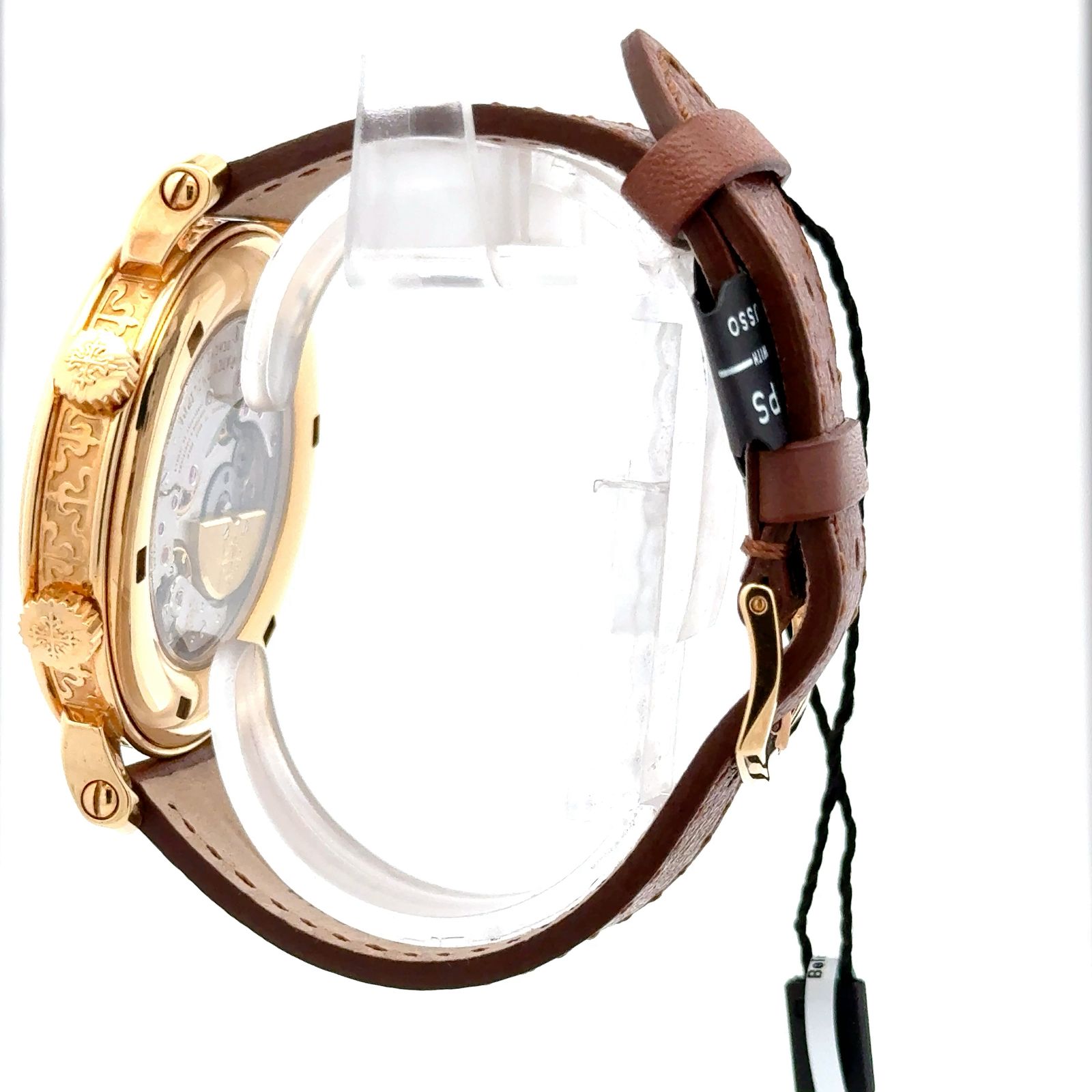 Patek Philippe 5102 “Celestial” is a horological ode to the cosmos, blending astronomical precision with poetic design in one of the brand’s most mesmerizing Grand Complications. Crafted from yellow gold 43mm case, paired with a rich blue sapphire-crystal dial that displays a rotating sky chart of the Northern Hemisphere. This celestial map includes the angular motion of stars, the orbit and phases of the moon, and the time of meridian passage of Sirius and the moon, all powered by the self-winding caliber 240 LU CL. The movement orchestrates three rotating sapphire disks, each moving at different speeds to simulate the night sky’s motion with remarkable fidelity. Roman numerals encircle the dial’s perimeter, while cardinal directions (N, S, E, W) and skeletonized feuille hands enhance the astronomical theme.