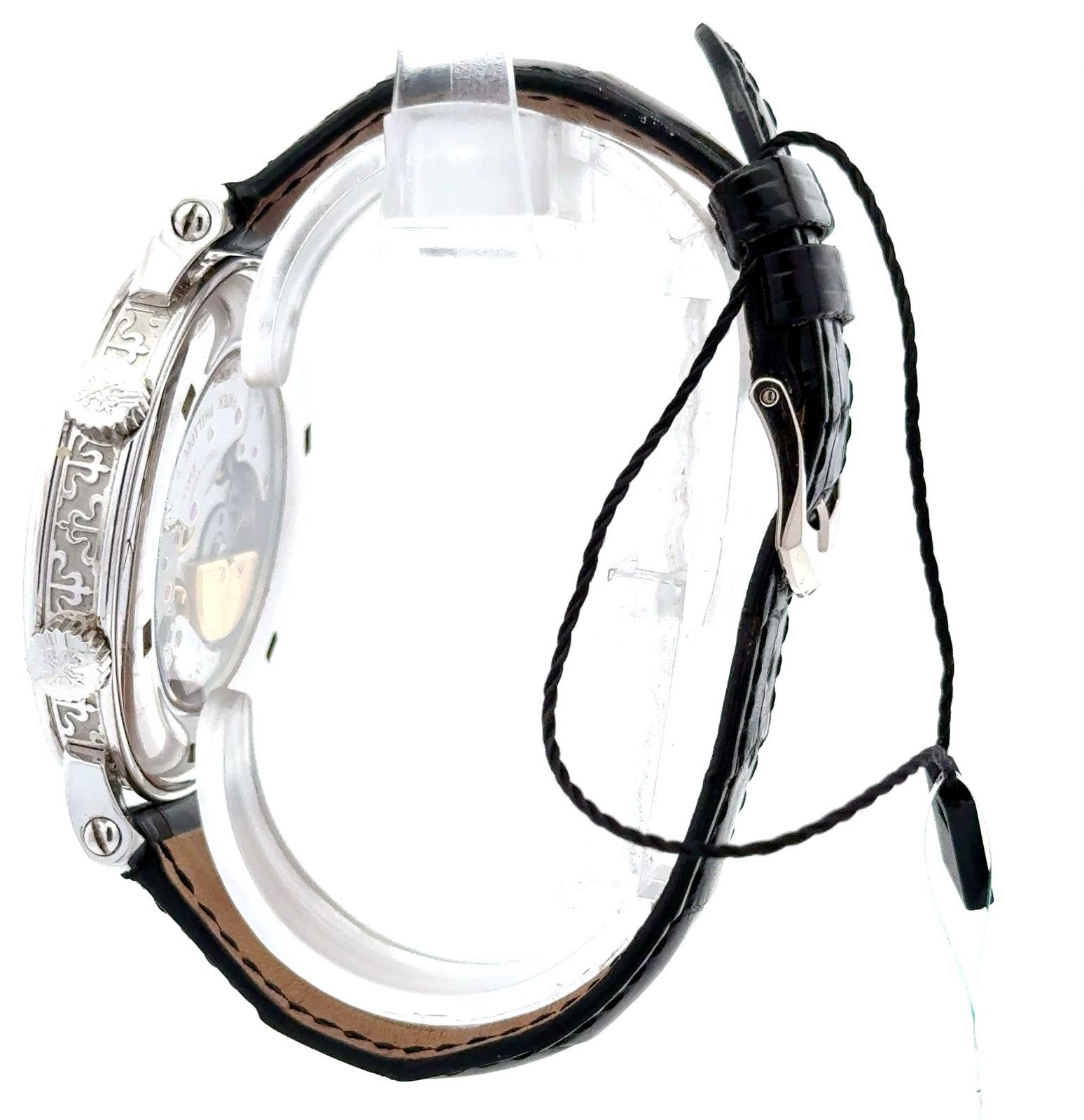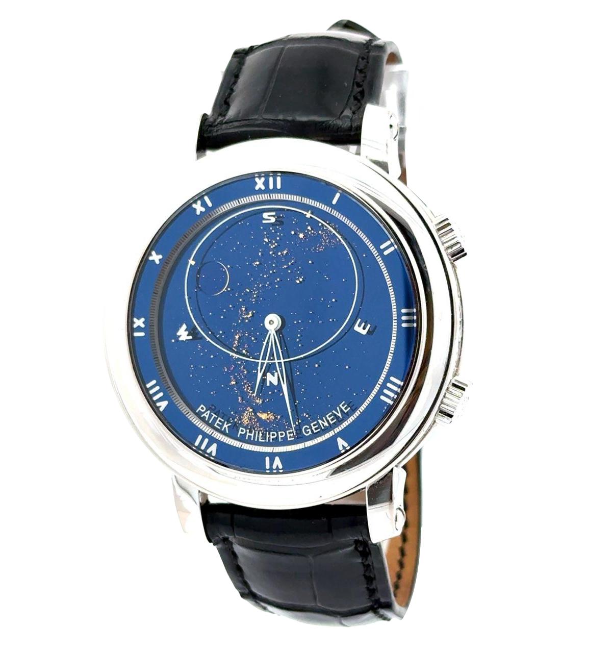 Patek Philippe 5102G-001 “Celestial” is a poetic masterpiece in horology, blending astronomical precision with artistic elegance. Crafted in 18K white gold and measuring 43mm in diameter, the 5102G-001 belongs to Patek Philippe’s revered Grand Complications collection. Its deep blue dial, rendered in sapphire crystal, presents a mesmerizing sky chart of the Northern Hemisphere, complete with moon phase and orbit indications. The elliptical window is marked with cardinal directions and framed by Roman numerals, evoking the grandeur of celestial navigation. Beneath the surface, the watch is powered by the automatic caliber 240 LU CL, a movement engineered to rotate layered sapphire disks at varying speeds, mimicking the motion of stars and lunar cycles with remarkable fidelity.