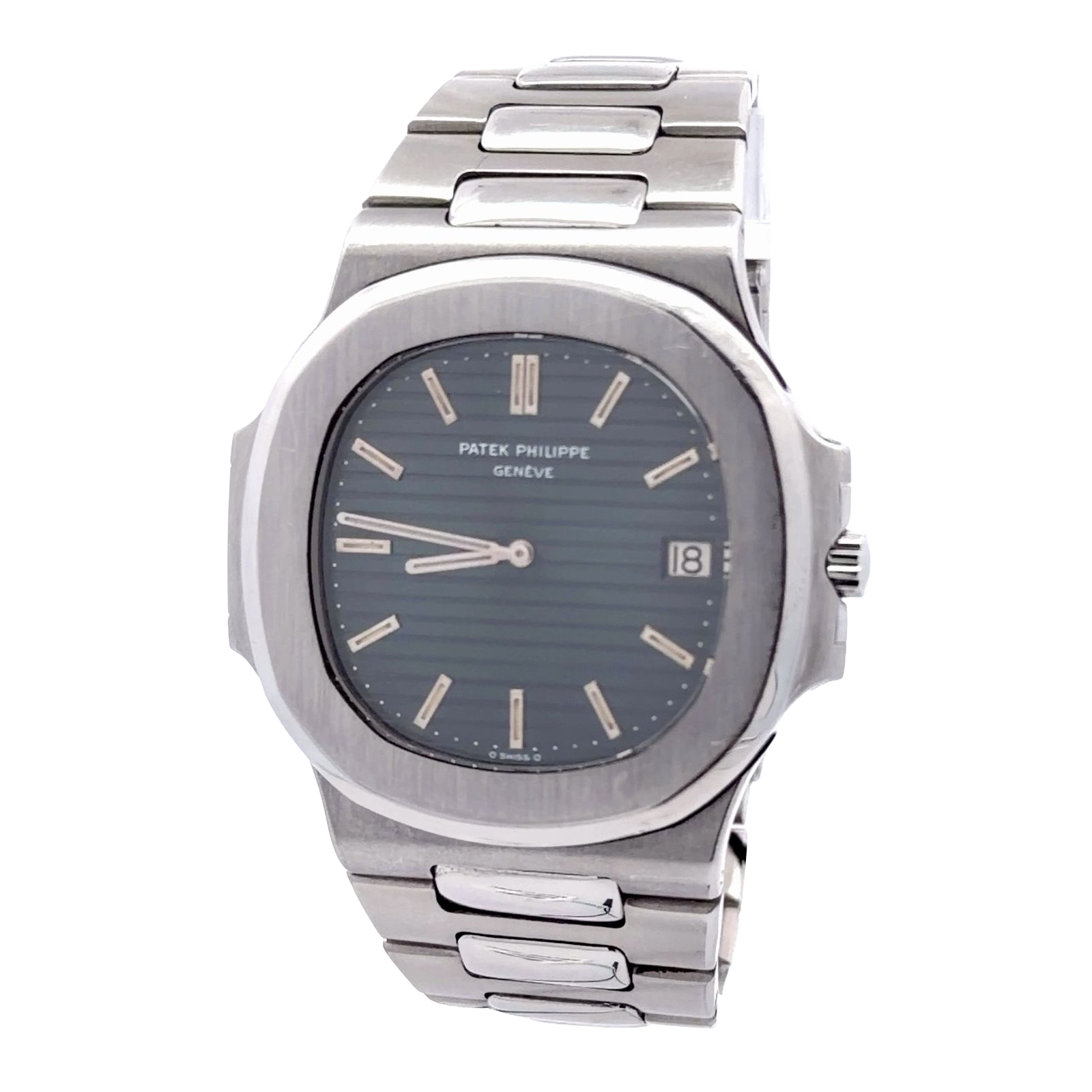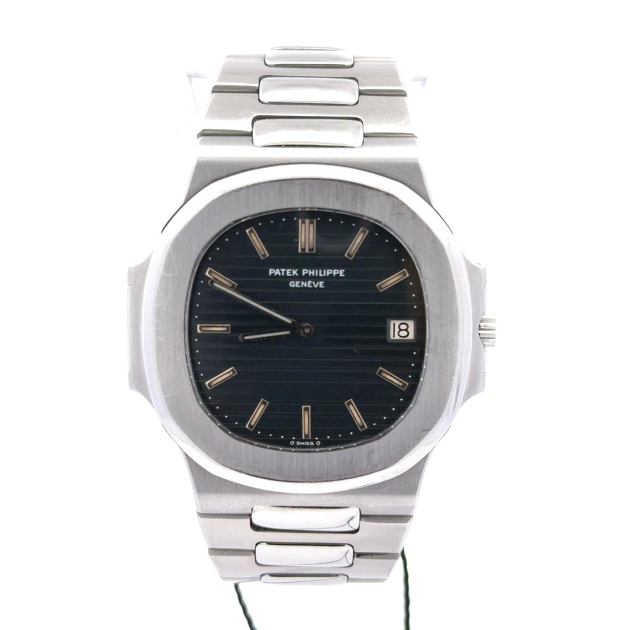 Patek Philippe Nautilus 3700/001 features a 42mm stainless steel case with a distinctive porthole-inspired design, characterized by its octagonal bezel.The dial is finished in a signature deep blue-grey with horizontal embossing, protected by a sapphire crystal and featuring a discreet date window at 3 o'clock. Completing the design is an integrated stainless steel bracelet with a seamless taper, which, combined with the monobloc case construction.