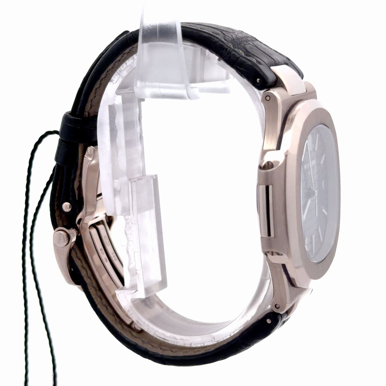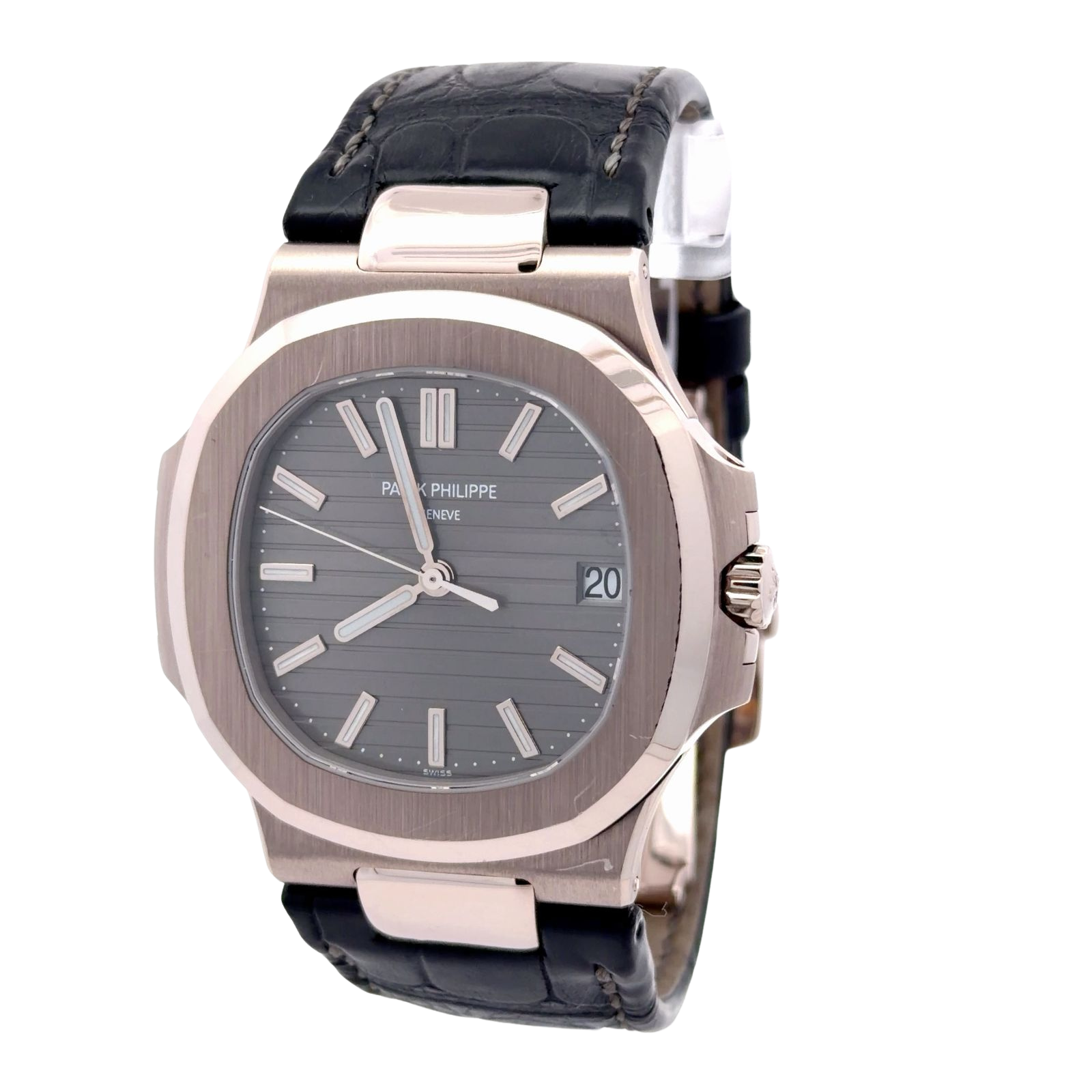 Patek Philippe Nautilus 5711G-001 is a luxurious interpretation of the iconic Gérald Genta-designed sports watch, distinguished by its 18k white gold construction. This model features a 40mm cushion-shaped case with the signature rounded octagonal bezel and "porthole" design. Its centerpiece is a slate grey dial decorated with horizontally embossed lines, applied white gold hour markers, and hands coated with luminescent material for visibility. Functionally, it offers hours, minutes, a sweep seconds hand, and a date window at the 3 o’clock position. The timepiece is paired with a black leather strap and an 18k white gold "Nautilus" engraved folding clasp. Powering the watch is the self-winding Caliber 324 S C visible through a sapphire crystal case back and boasting a power reserve of approximately 45 hours.