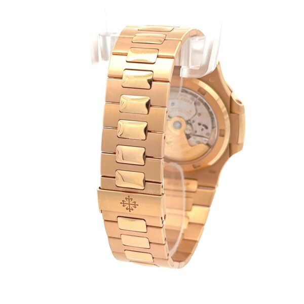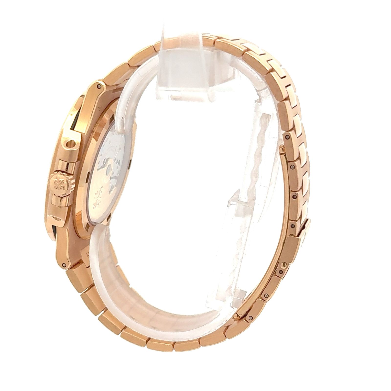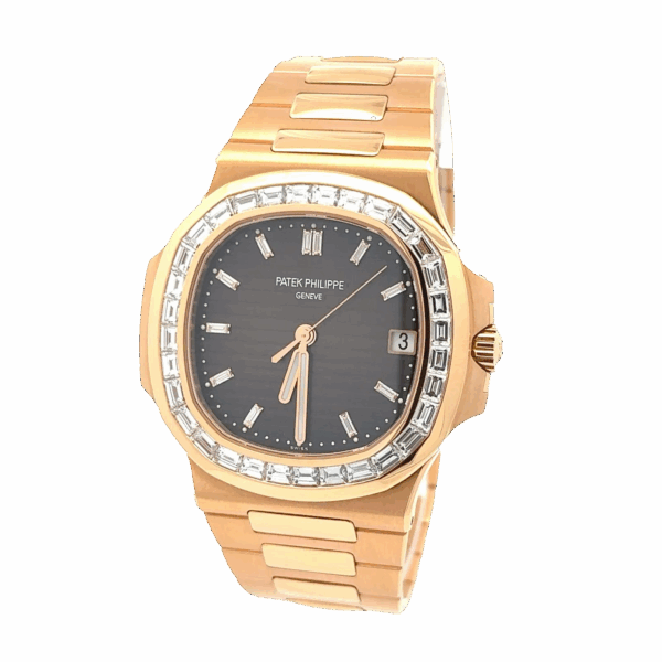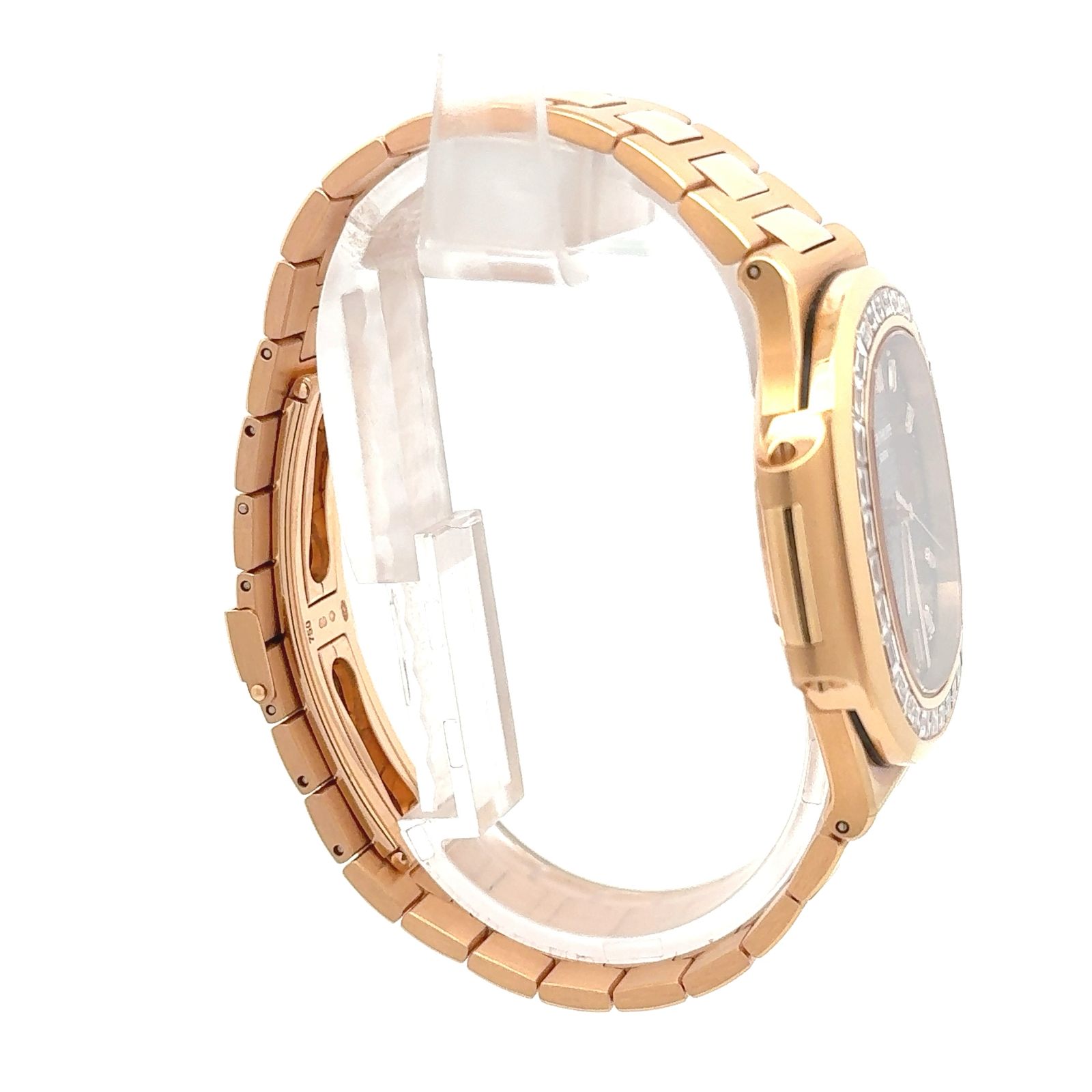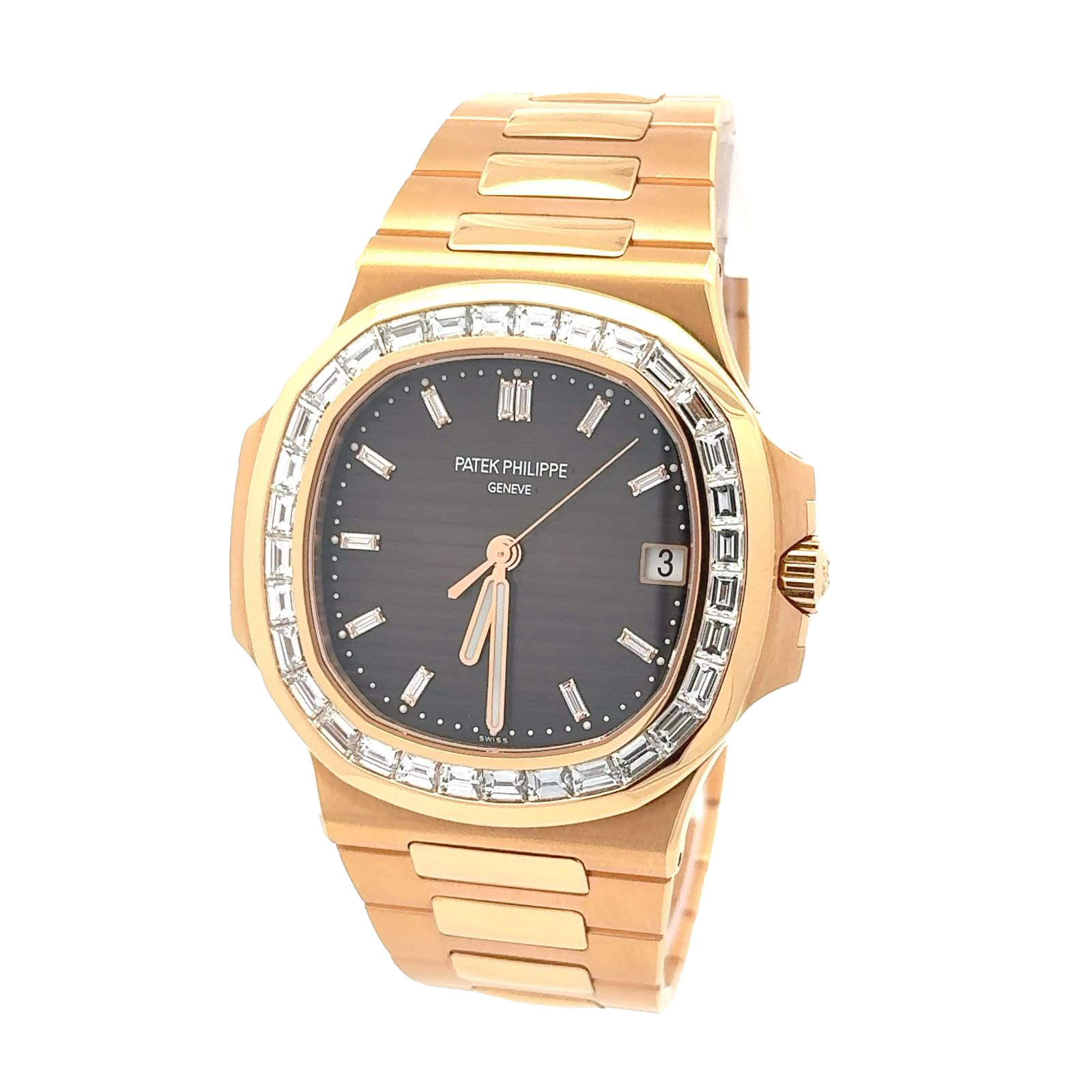 Patek Philippe Nautilus Ref. 5723/1R-010 is a luxurious and elegant timepiece crafted entirely from rose gold, featuring a 40 mm case and matching rose gold bracelet that exude warmth and sophistication. The watch is distinguished by its gem-set bezel, adding a touch of refined sparkle to the iconic Nautilus design. Powered by a precise automatic movement, this model boasts a clean brown dial free of numerals, enhancing its sleek and modern aesthetic. Protected by a durable sapphire crystal, the dial includes a practical date function for everyday convenience. The bracelet is secured with a rose gold fold clasp, ensuring a comfortable and secure fit. This exquisite Nautilus combines Patek Philippe’s signature craftsmanship with high jewelry elements, making it a stunning choice for collectors who appreciate timeless style and understated luxury.