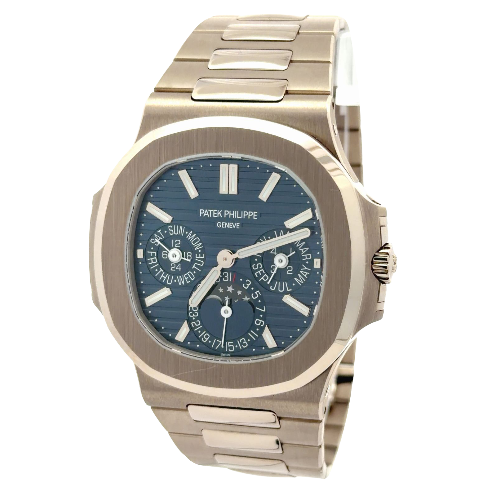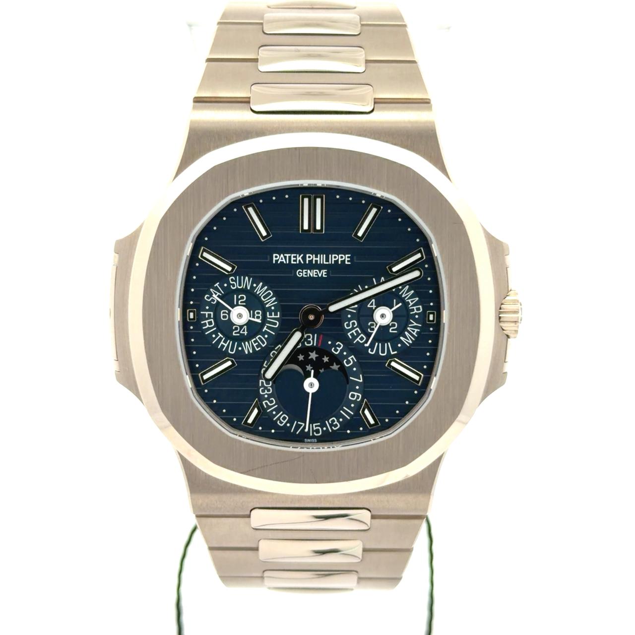 Patek Philippe Nautilus reference 5740/1G-001, which is the brand's first Grand Complication in the iconic Nautilus line. This highly sought-after timepiece is crafted in 18k white gold, featuring a 40mm wide, ultra-thin case with the signature rounded octagonal bezel and a blue dial with horizontal embossed stripes. It is powered by the ultra-thin self-winding perpetual calendar caliber 240 Q movement, which is visible through the sapphire case back. The perpetual calendar mechanism automatically keeps track of the date, day, month, and leap years, requiring no manual adjustments. The watch is completed by an integrated white gold bracelet with polished central links and a fold-over clasp.