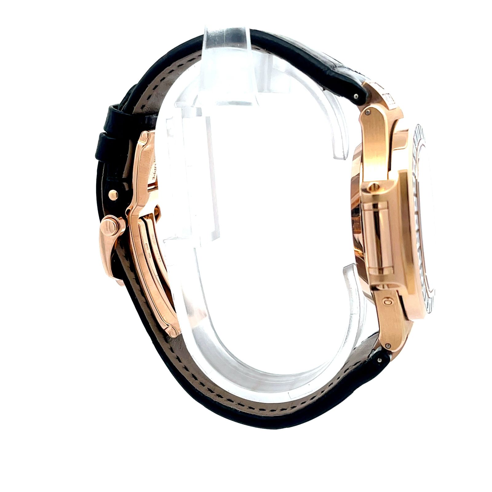 Patek Philippe Nautilus 5980/10R-010 is a stunning embodiment of luxury sports watchmaking, blending the iconic Nautilus design with exquisite gem-setting and haute horlogerie precision. Crafted in luxurious 18-carat rose gold, the watch features a 40.5mm case with an octagonal bezel beautifully set with high-quality baguette cut diamonds, enhancing its elegance and brilliance. The chronograph pushers are seamlessly integrated into the case, maintaining the Nautilus’s distinctive, rounded porthole silhouette.