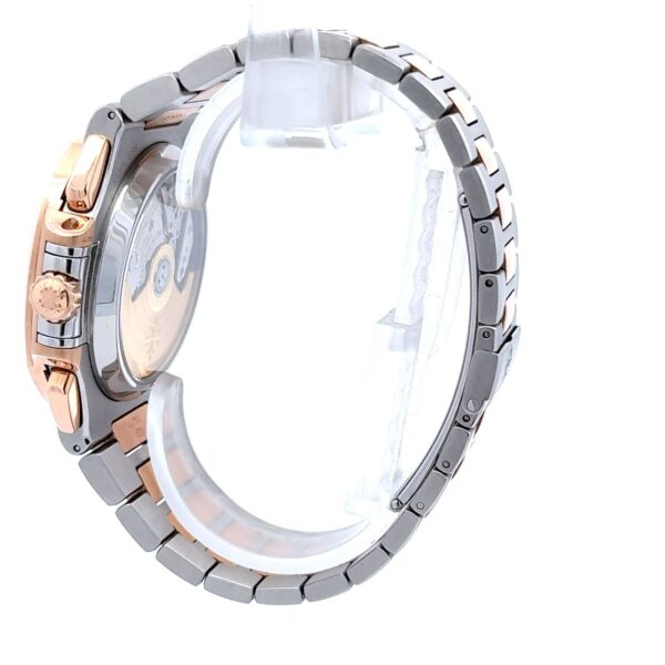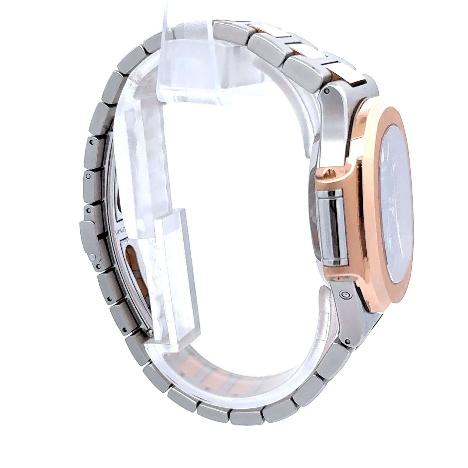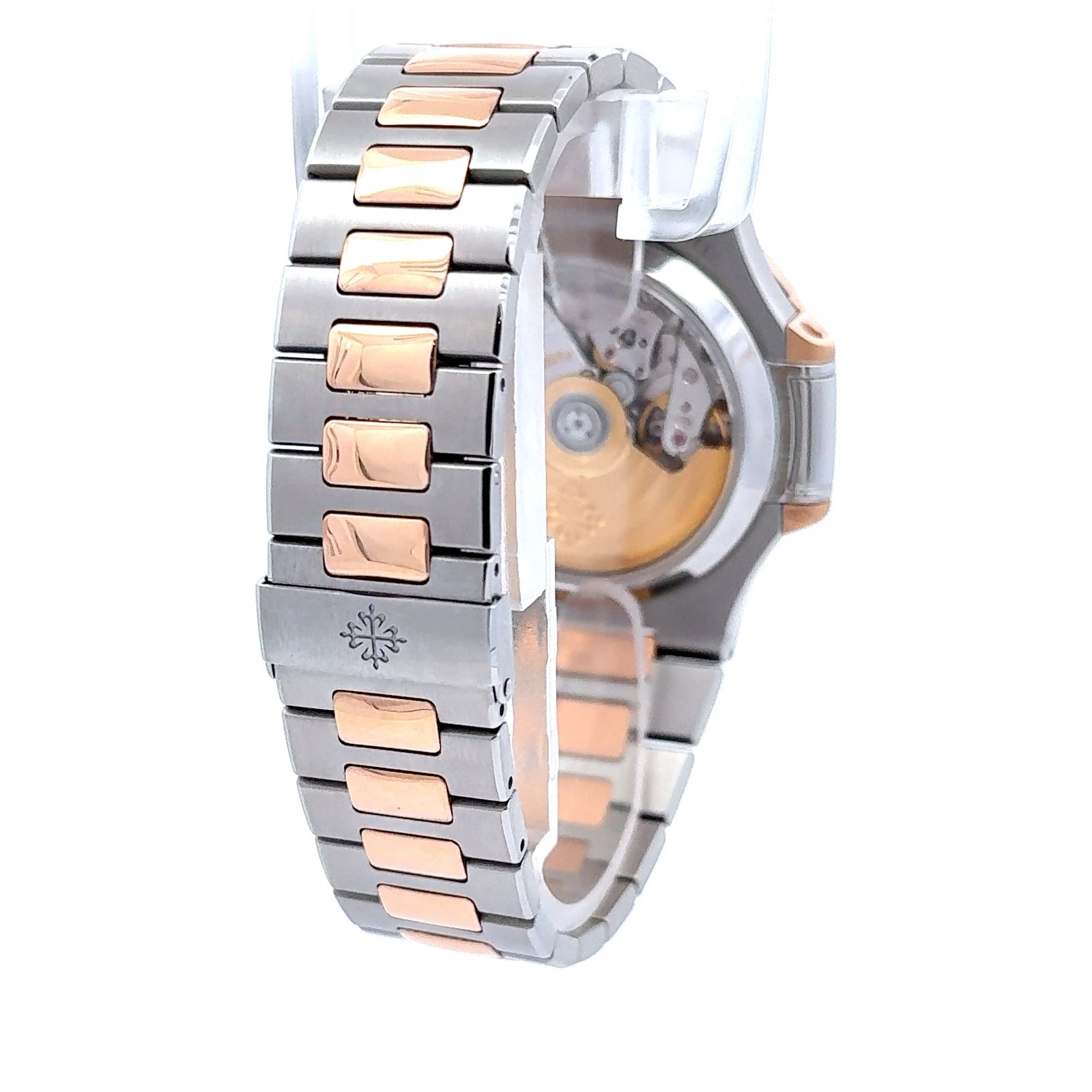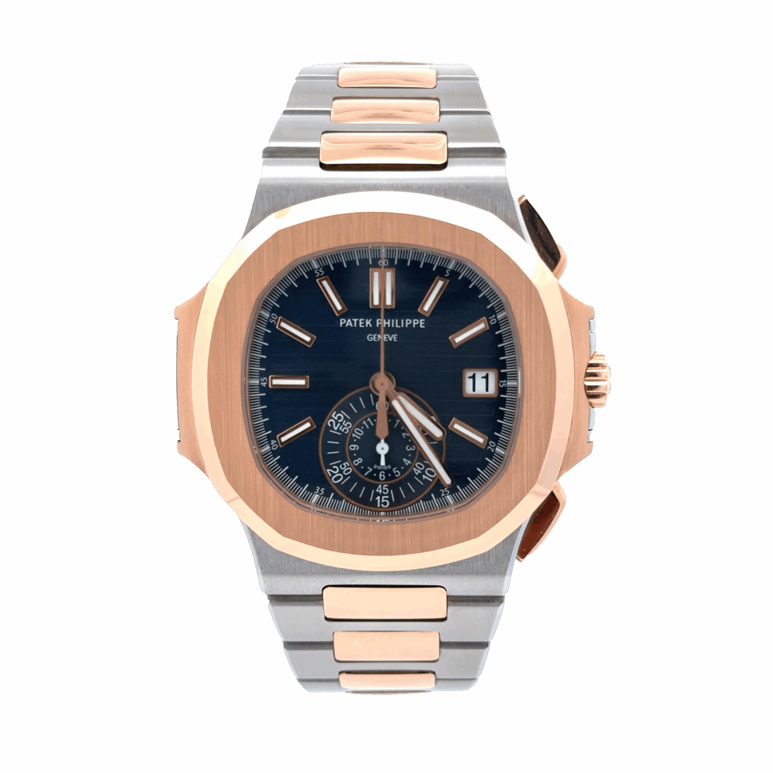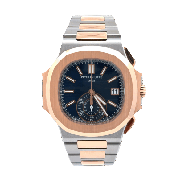 Patek Philippe Nautilus Reference 59801AR-001 is a sophisticated and luxurious timepiece that combines elegance with advanced horological technology, featuring a 40.5mm case made from a blend of stainless steel and 18K rose gold, a stunning blue gradient dial inspired by the original Nautilus ref. 3700 with rose gold applied markers and luminescent white accents for excellent readability, the Patek Philippe Caliber CH 28-520 C automatic movement with a power reserve of approximately 55 hours, complications including a flyback chronograph, 18K rose gold-framed date aperture at 3 o'clock, a distinctive octagonal case shape with gently rounded corners inspired by the original Nautilus design, water resistance to 120 meters, and a stainless steel and rose gold bracelet with a folding clasp.