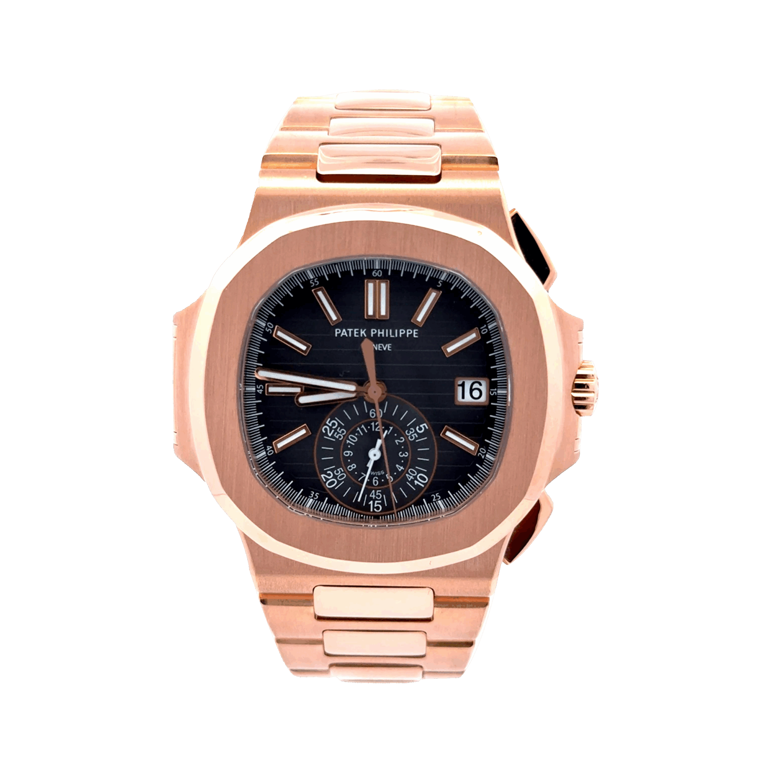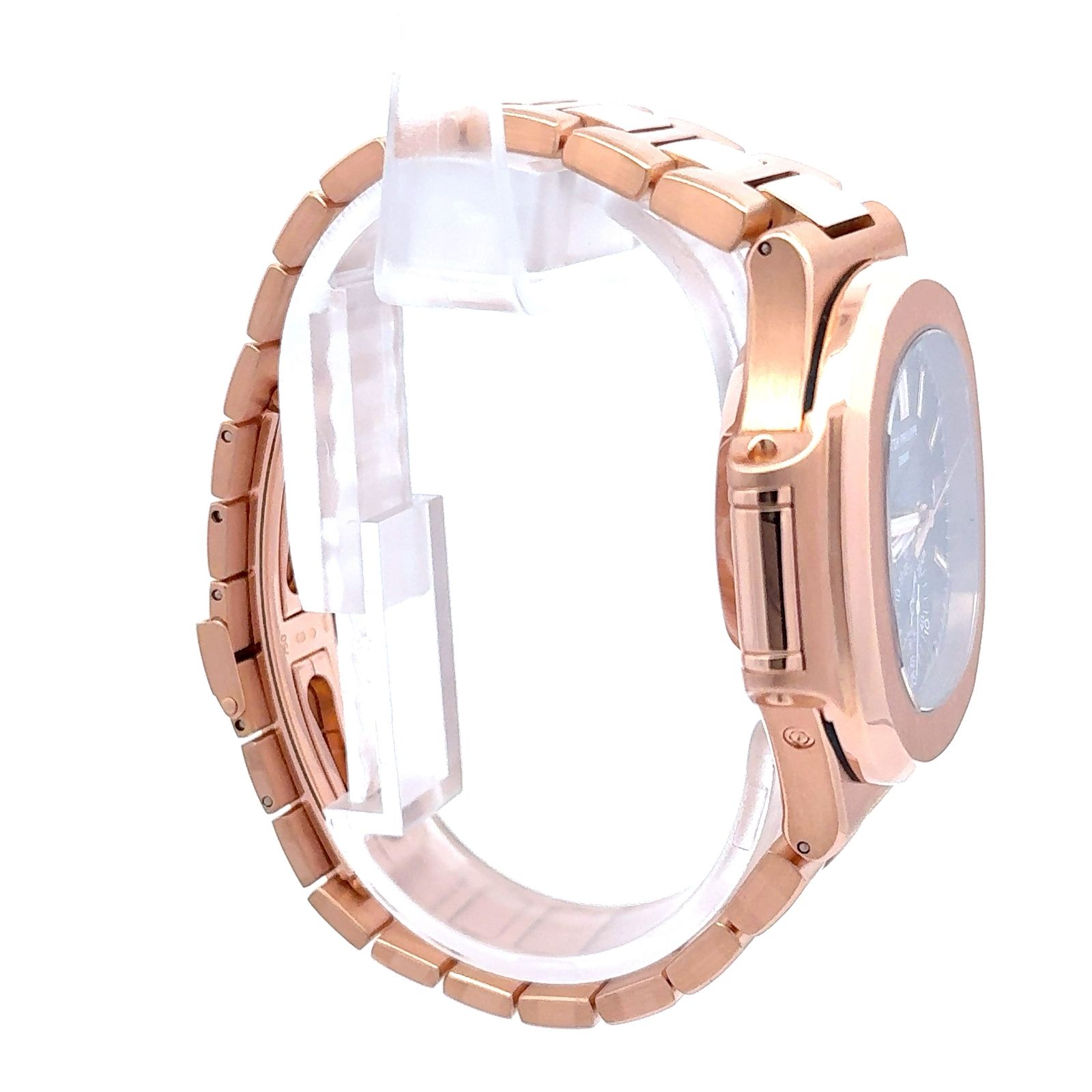 Patek Philippe Nautilus Chronograph 5980/1R-001 is a striking blend of sporty sophistication and luxurious craftsmanship. Crafted in 18k rose gold, its 40.5 mm case features the iconic rounded octagonal bezel, complemented by an integrated rose gold bracelet with a fold-over clasp. The grey gradient dial, enhanced with the Nautilus’ signature horizontal embossing, displays applied rose gold hour markers with luminescent coating, a date window at 3 o’clock, and a distinctive mono-counter at 6 o’clock that combines both the 60-minute and 12-hour chronograph registers in a single, elegantly balanced subdial. Powered by the self-winding Caliber CH 28-520 C, this timepiece offers a central chronograph seconds hand, precise timekeeping, and a power reserve of up to 55 hours, all visible through the sapphire-crystal exhibition caseback. Water-resistant to 120 meters, the Nautilus 5980/1R-001 stands out as one of Patek Philippe’s most coveted modern sports chronographs, blending technical mastery with timeless design.