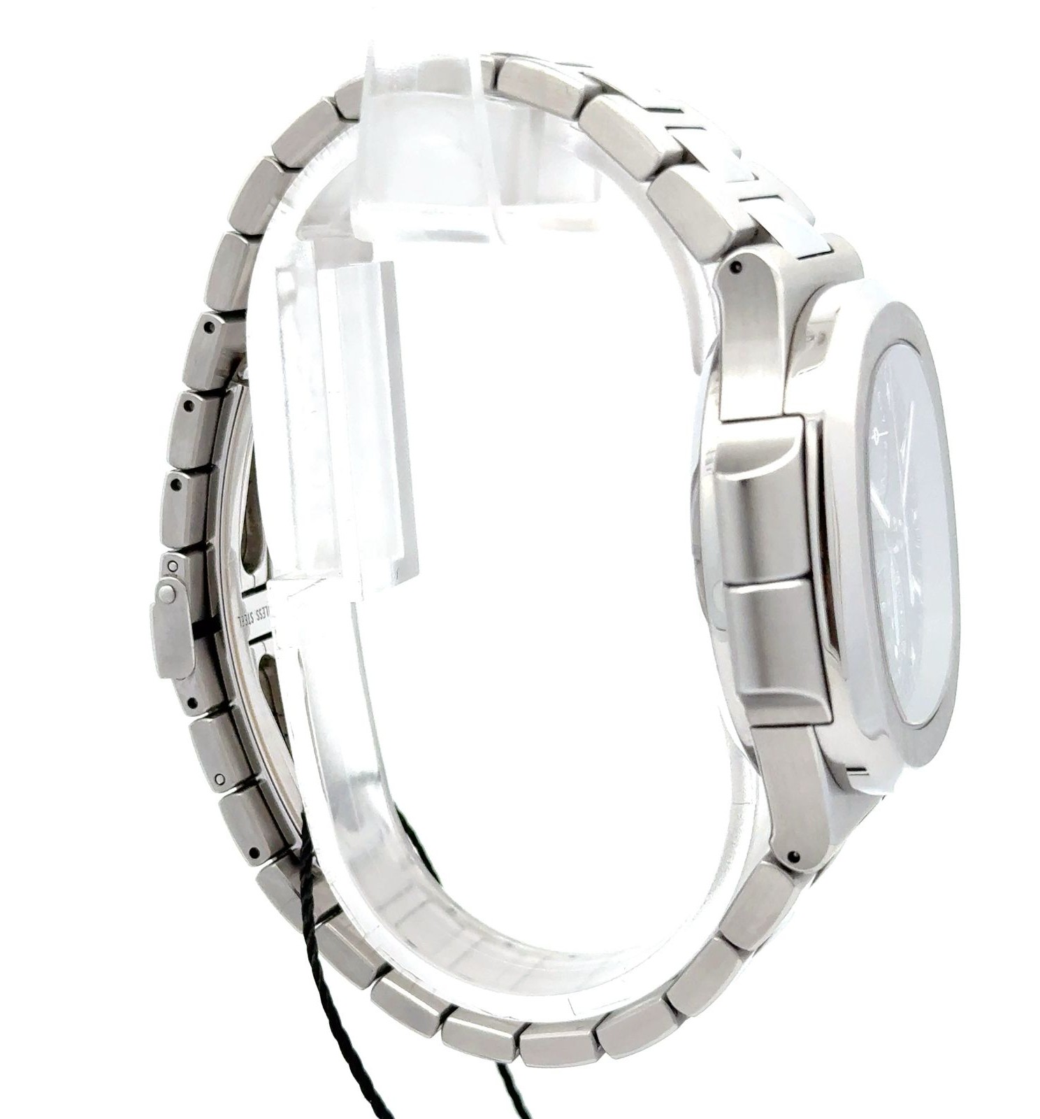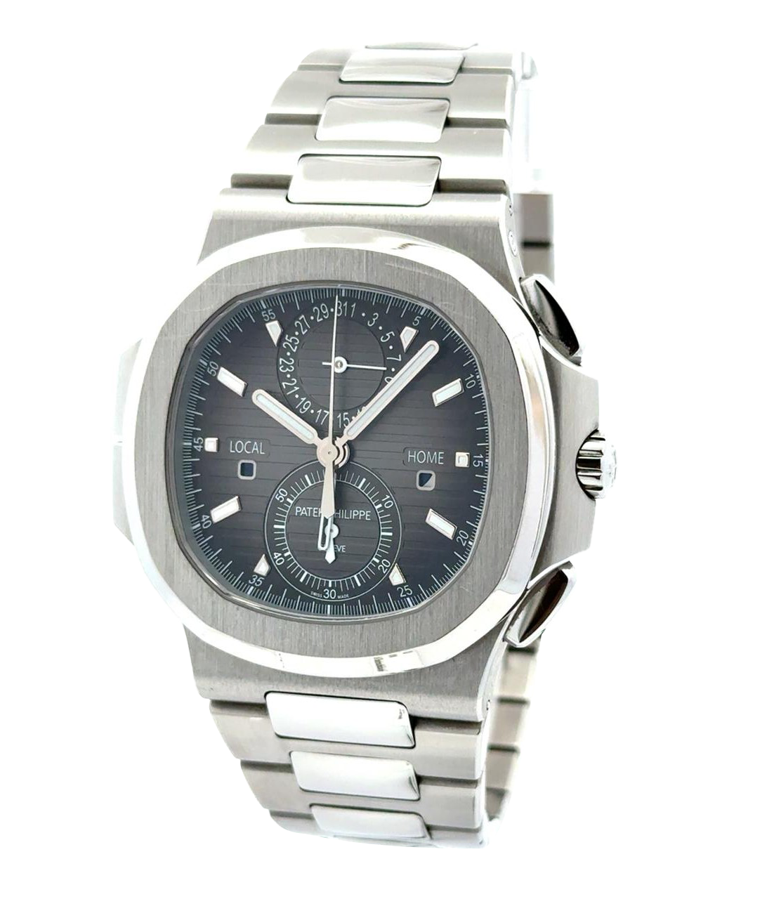 Patek Philippe Nautilus 5990/1A-001 is an exceptional blend of elegance, complexity, and sporty refinement. Crafted in stainless steel with a 40.5 mm case, it showcases a black gradient sunburst dial adorned with luminescent white gold hour markers for superb legibility. This masterpiece integrates a dual time zone (Travel Time) function, a flyback chronograph, and an analog date display linked to local time, providing seamless functionality for world travelers. Powered by the self-winding Caliber CH 28-520 C FUS, it offers a 55-hour power reserve, column-wheel chronograph mechanism, and impeccable finishing visible through the sapphire crystal caseback. The integrated stainless steel bracelet, featuring alternating brushed and polished surfaces, ensures a perfect fit and refined aesthetics. With 120-meter water resistance and precisely engineered pushers for adjusting the local hour hand, the 5990/1A-001 represents Patek Philippe’s signature craftsmanship, uniting form and function in one of the most iconic and versatile luxury sports watches ever created.