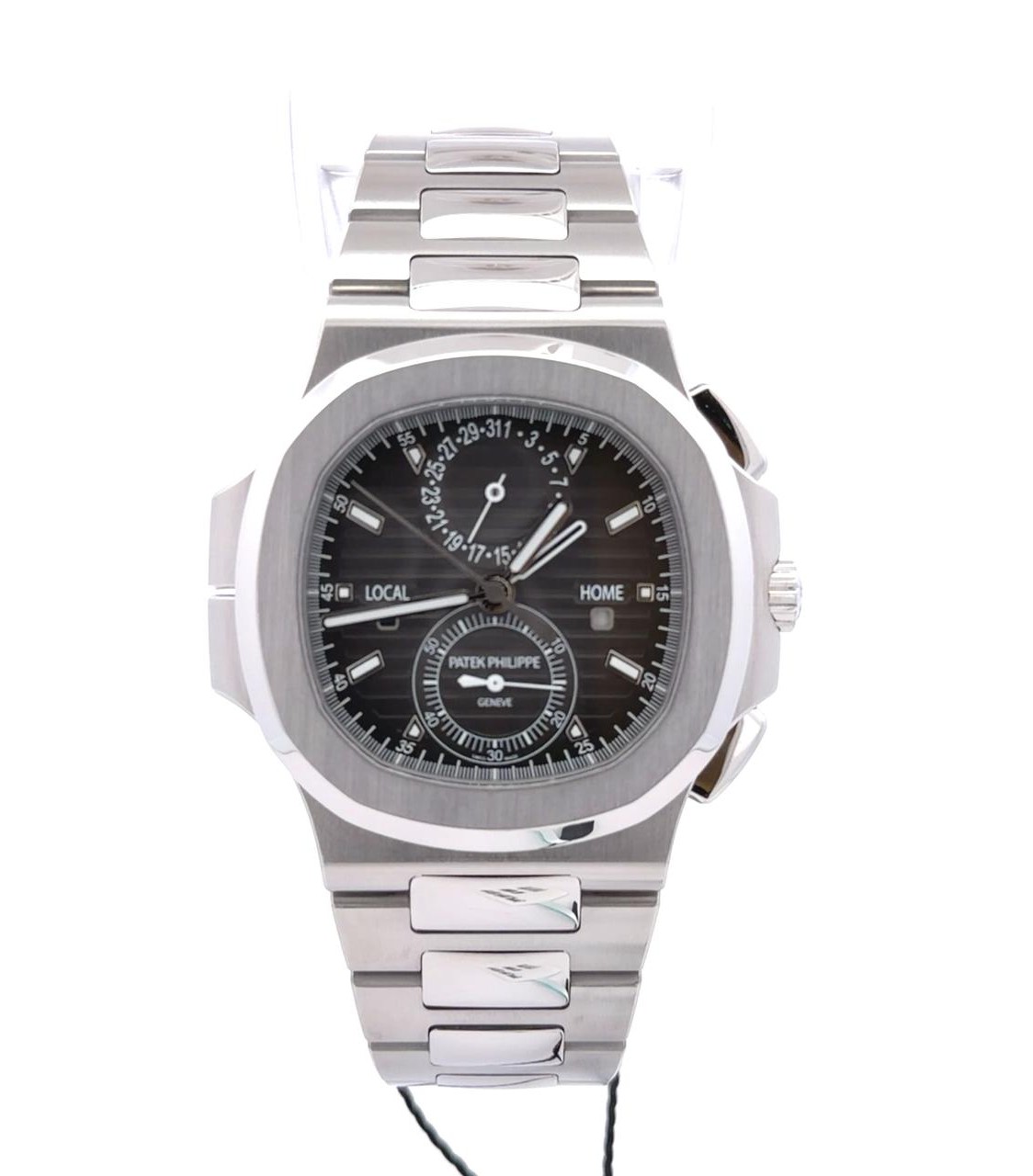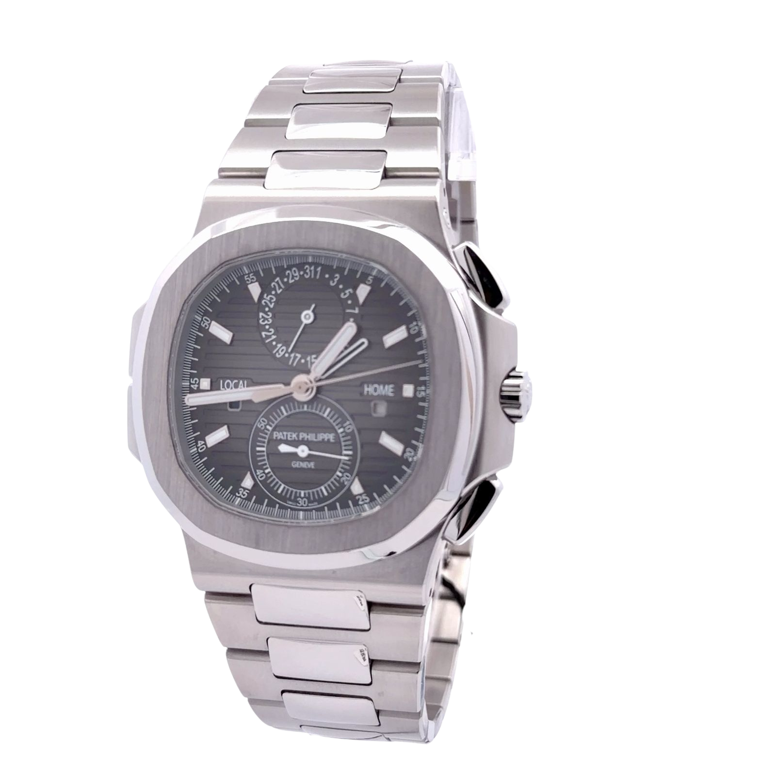 Patek Philippe Nautilus Travel Time Chronograph, reference number 5990/1A-001 features a robust 40.5mm stainless steel case and a matching integrated stainless steel bracelet with a double folding clasp. It is powered by the self-winding caliber CH 28-520 C FUS automatic movement, which combines a flyback chronograph with a dual time zone mechanism (Travel Time function). The black graduated dial displays local and home time, along with day/night indicators for both time zones, a date display, and a small seconds sub-dial. The watch is also water-resistant up to 120 meters and has a sapphire crystal case back.