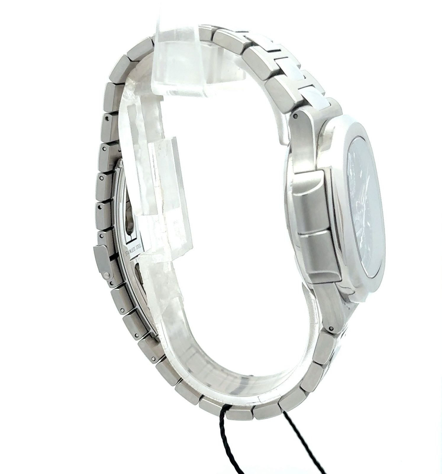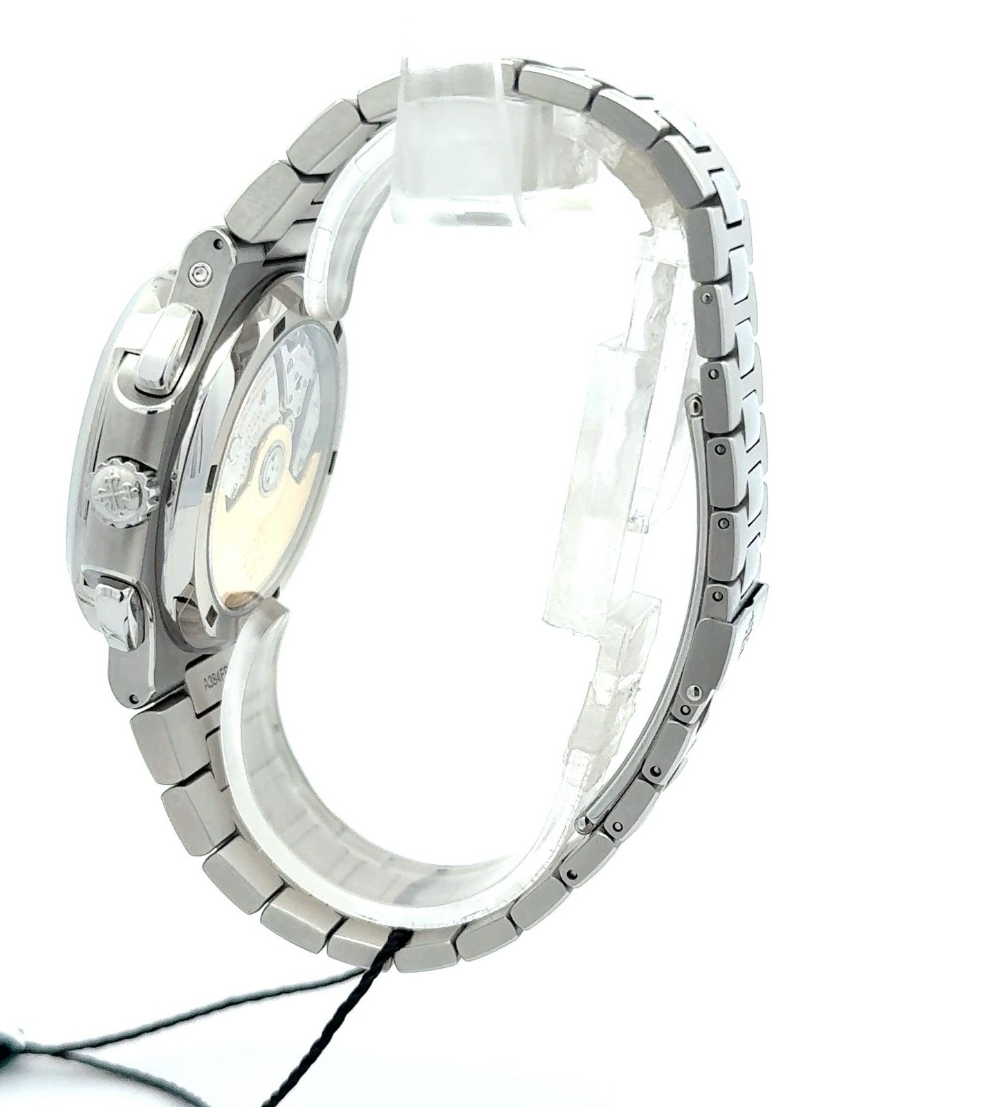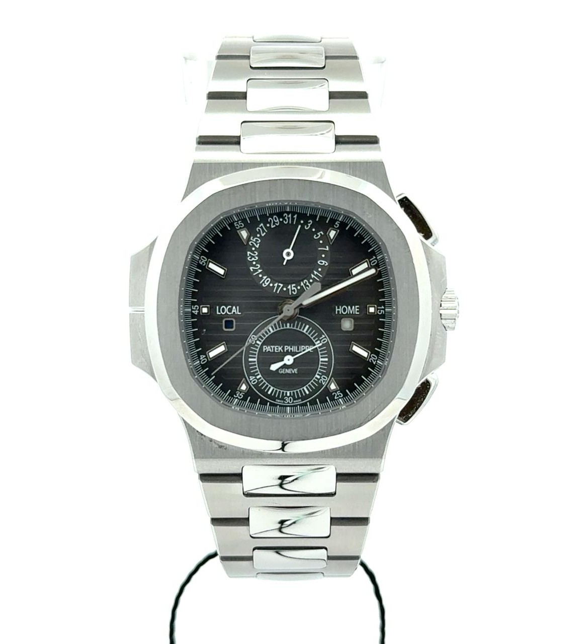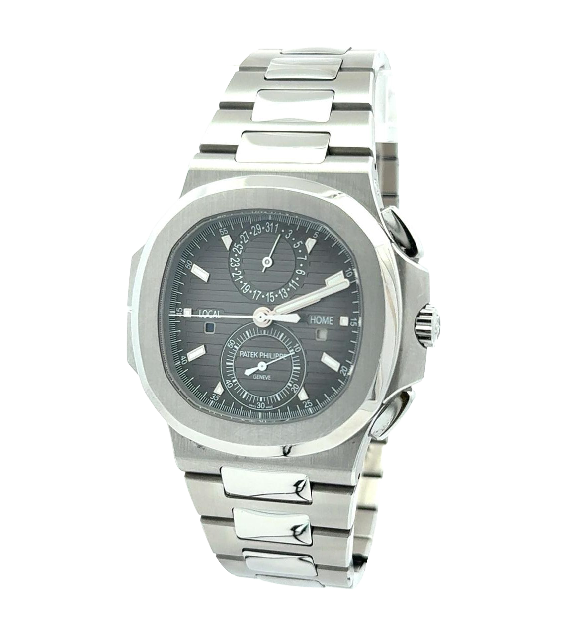 Patek Philippe Nautilus 5990/1A-001 is a masterclass in functional elegance, combining travel-ready complications with the iconic Nautilus design. This reference is crafted entirely in stainless steel, offering a robust yet refined presence with its signature 40.5mm cushion-shaped case and black gradient dial featuring horizontal embossing. At its heart lies the CH 28-520 C FUS caliber, a self-winding movement that powers a trio of complications: a flyback chronograph, a dual time zone display, and an instantaneous date tied to local time. The dial layout is both intuitive and symmetrical—day/night indicators for both home and local time flank the center axis, while the date sub-dial sits at 12 o’clock and the running seconds at 6 o’clock. Luminescent hands and applied hour markers ensure legibility, while the integrated steel bracelet with polished center links adds a touch of sport-luxury sophistication.