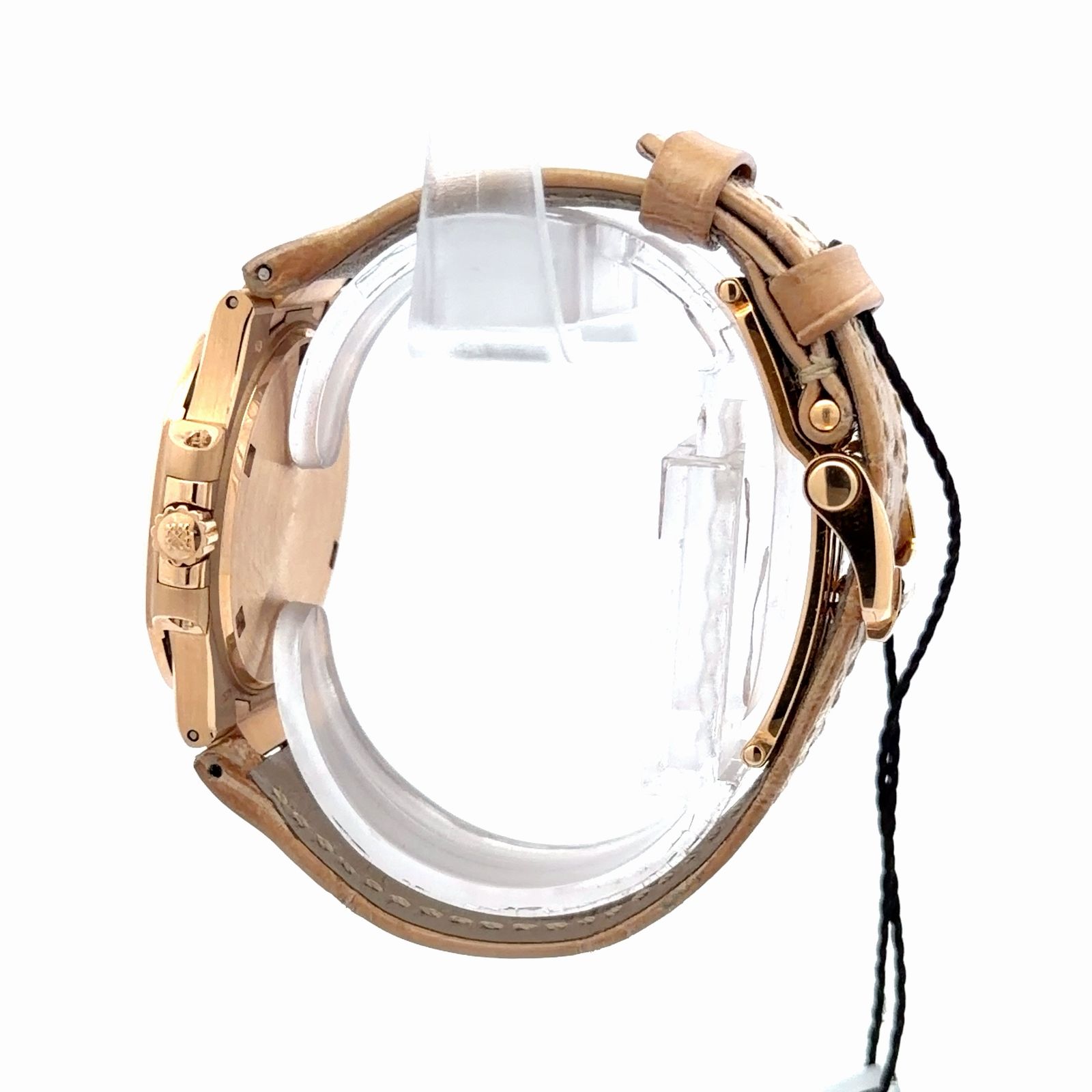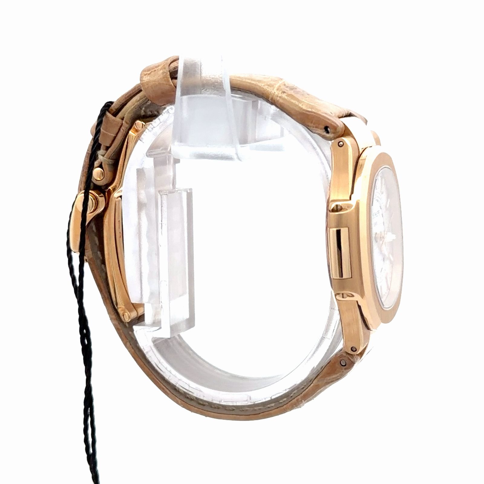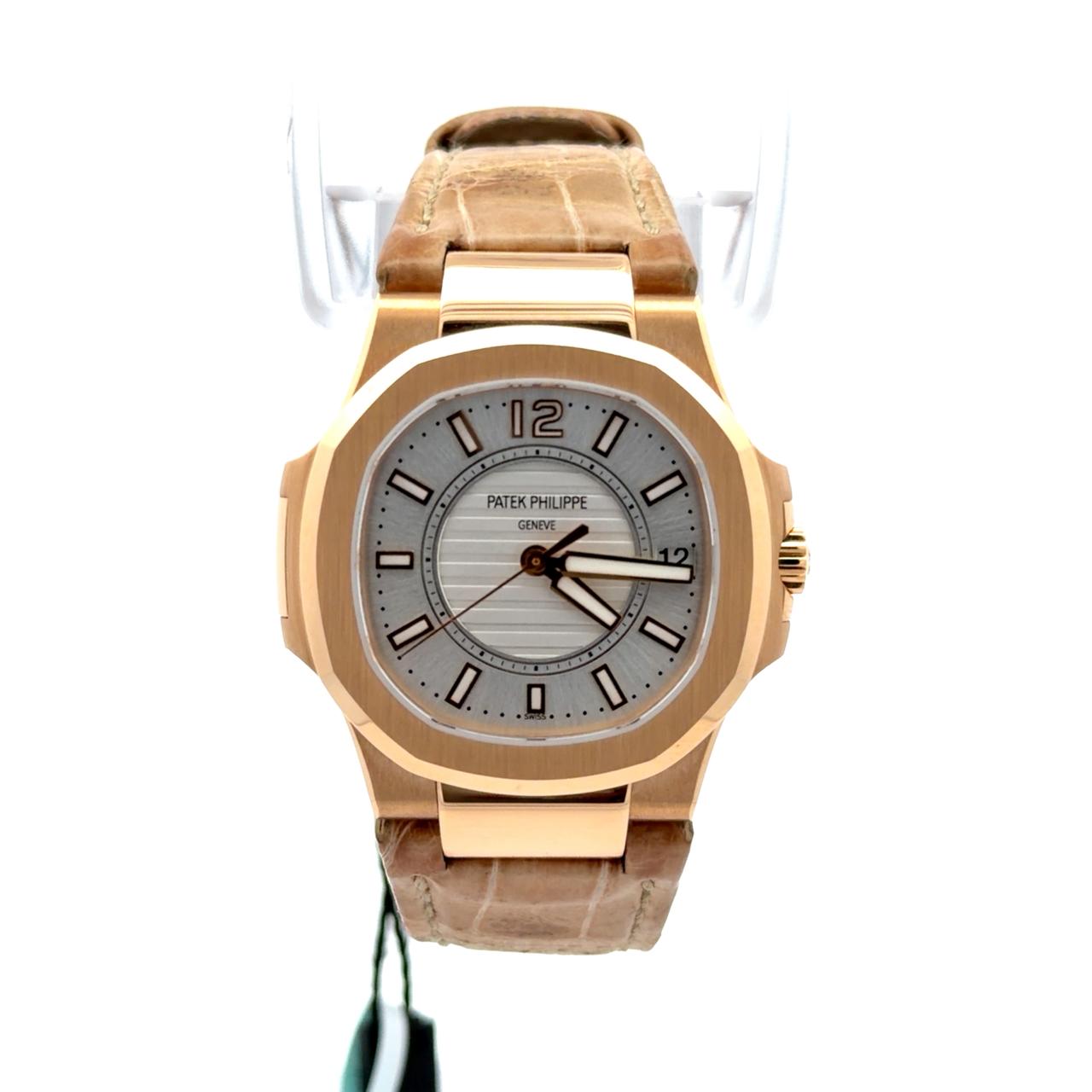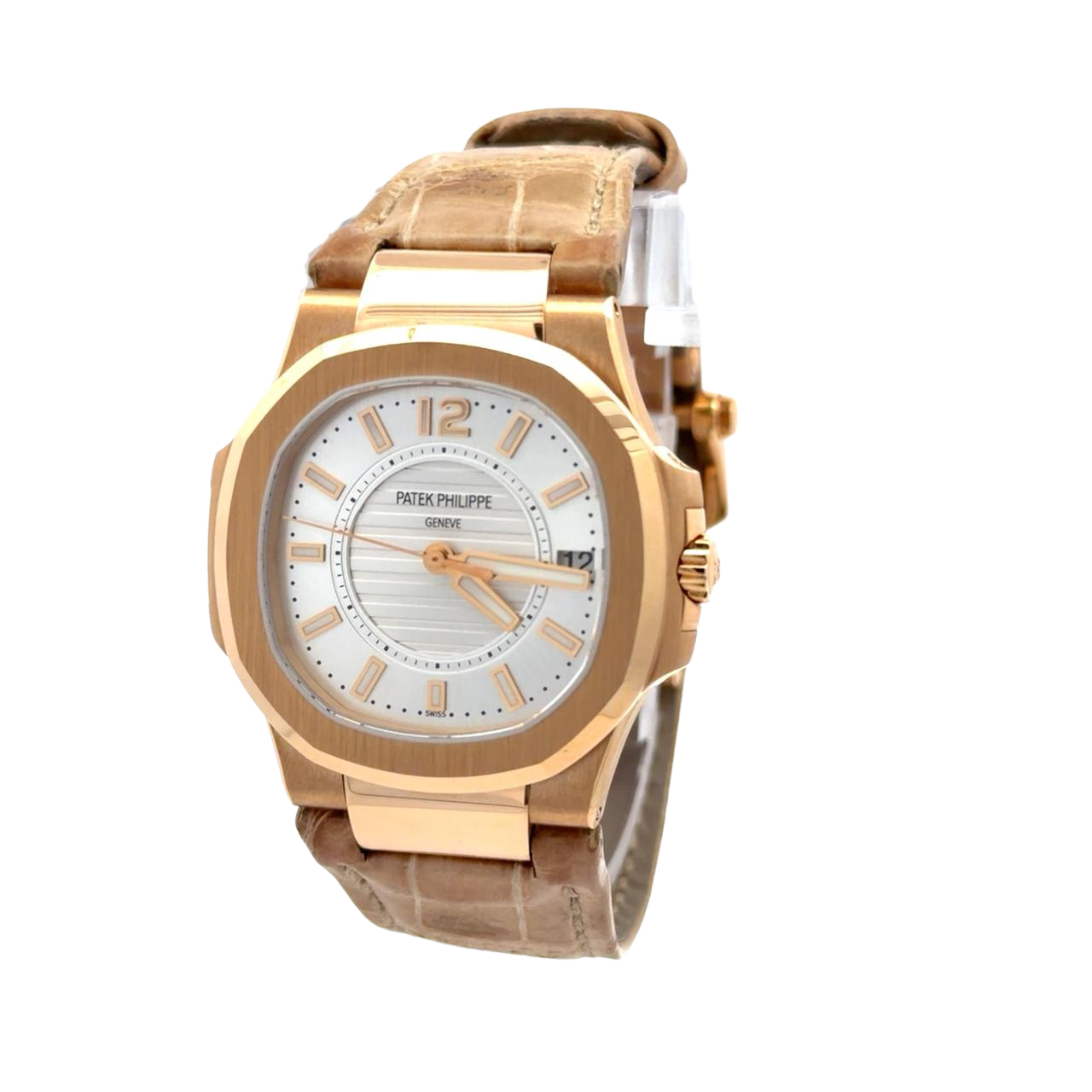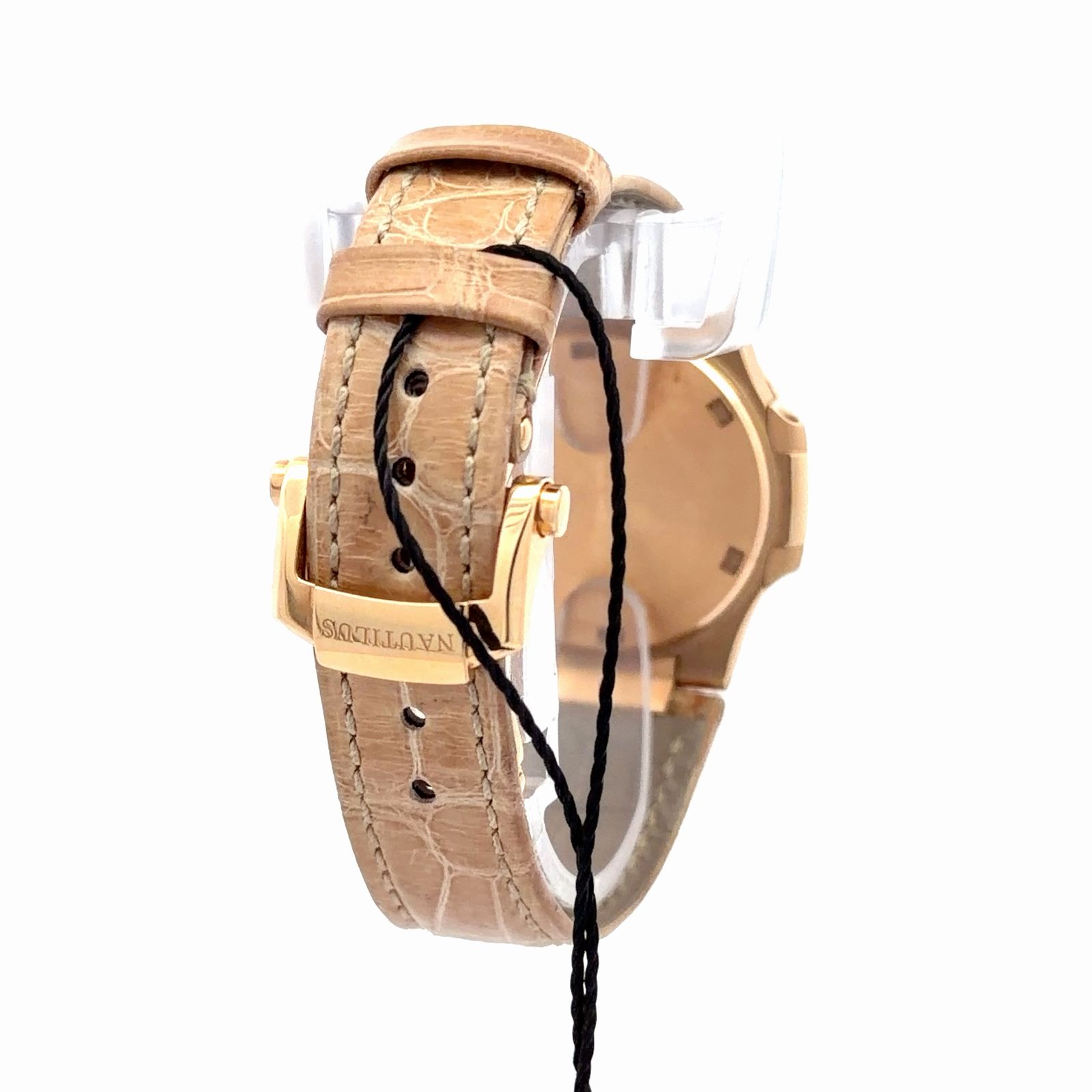 Patek Philippe 7011/1R-001 is a Nautilus model featuring a 32mm rose gold case and a white baton dial. This timepiece, utilizes a quartz movement. It comes with a beige leather strap, complementing its elegant and classic aesthetic.