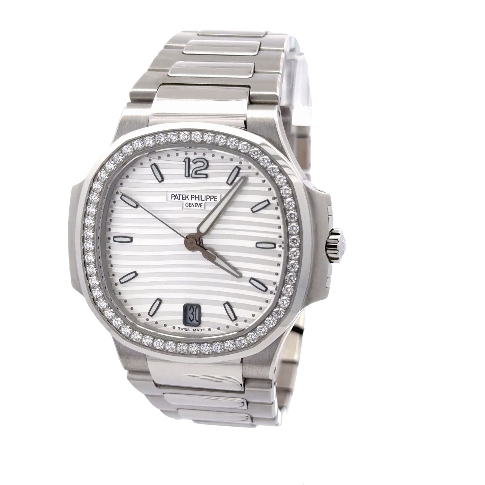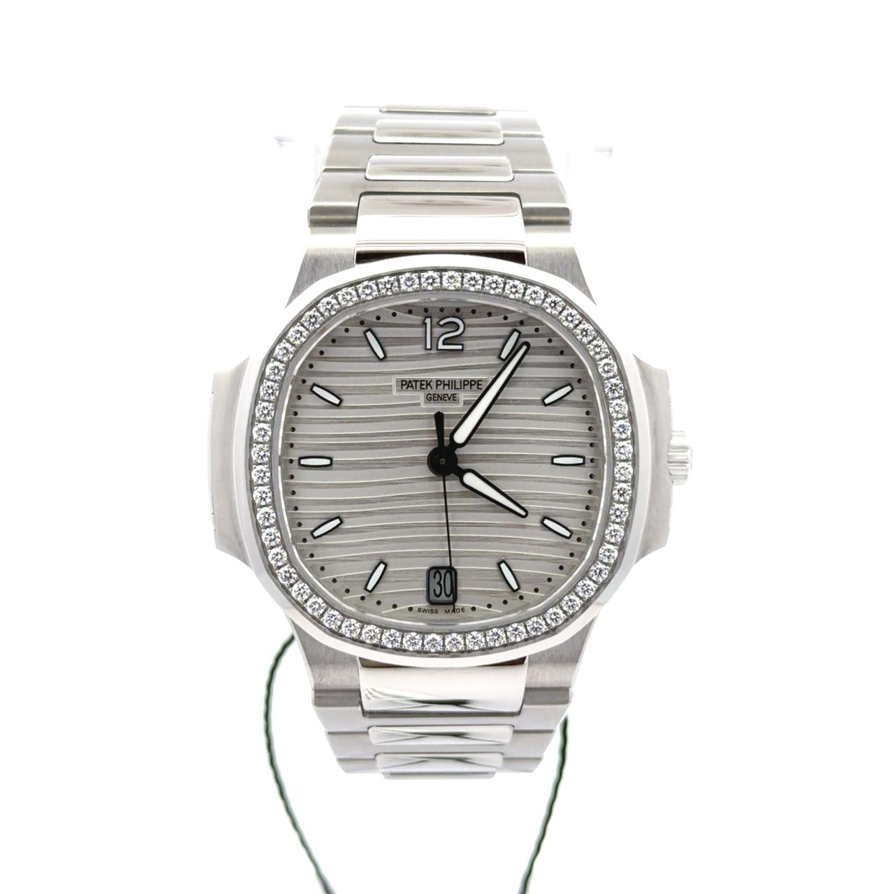 Patek Philippe Nautilus 7118/1200A-010 is an elegant, sporty-chic ladies' timepiece featuring a 35.2 mm stainless steel case with a slim profile of 8.62 mm. It showcases a white-silvery opaline dial adorned with the signature Nautilus horizontal "wave" motif and applied white gold hour markers and numerals, all treated with luminescent coating for visibility in low light. Practical features include a date aperture at 6 o'clock and a sweep seconds hand. The watch is powered by the self-winding Caliber 324 S C, offering a 45-hour power reserve and visible through a transparent sapphire crystal case-back. Designed for daily versatility, it is water-resistant to 60 meters.