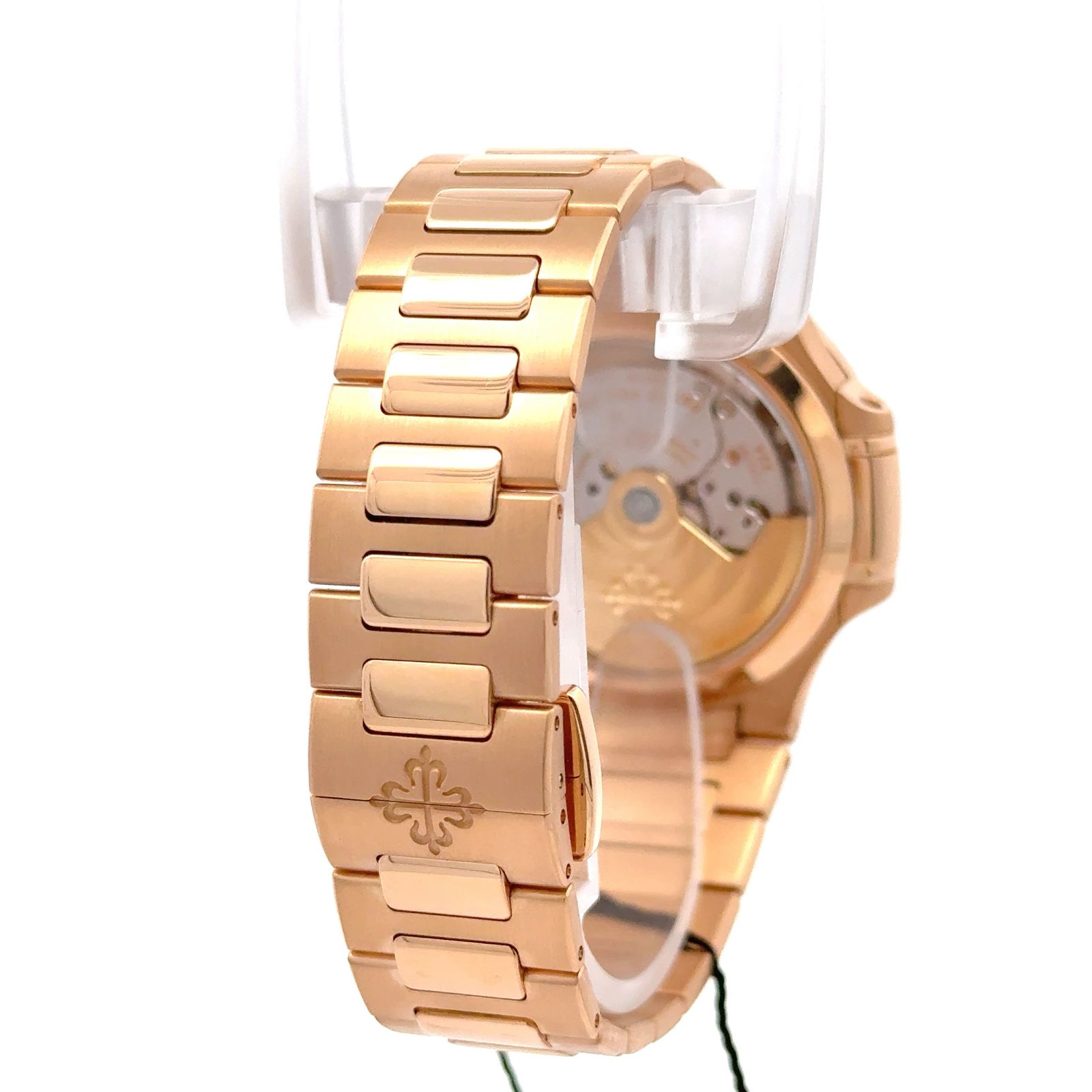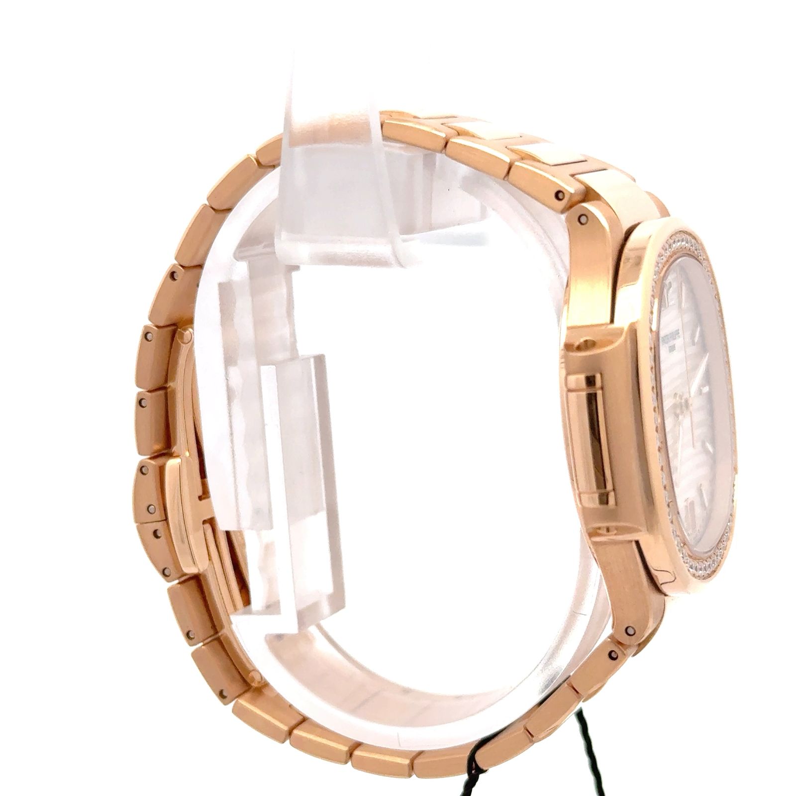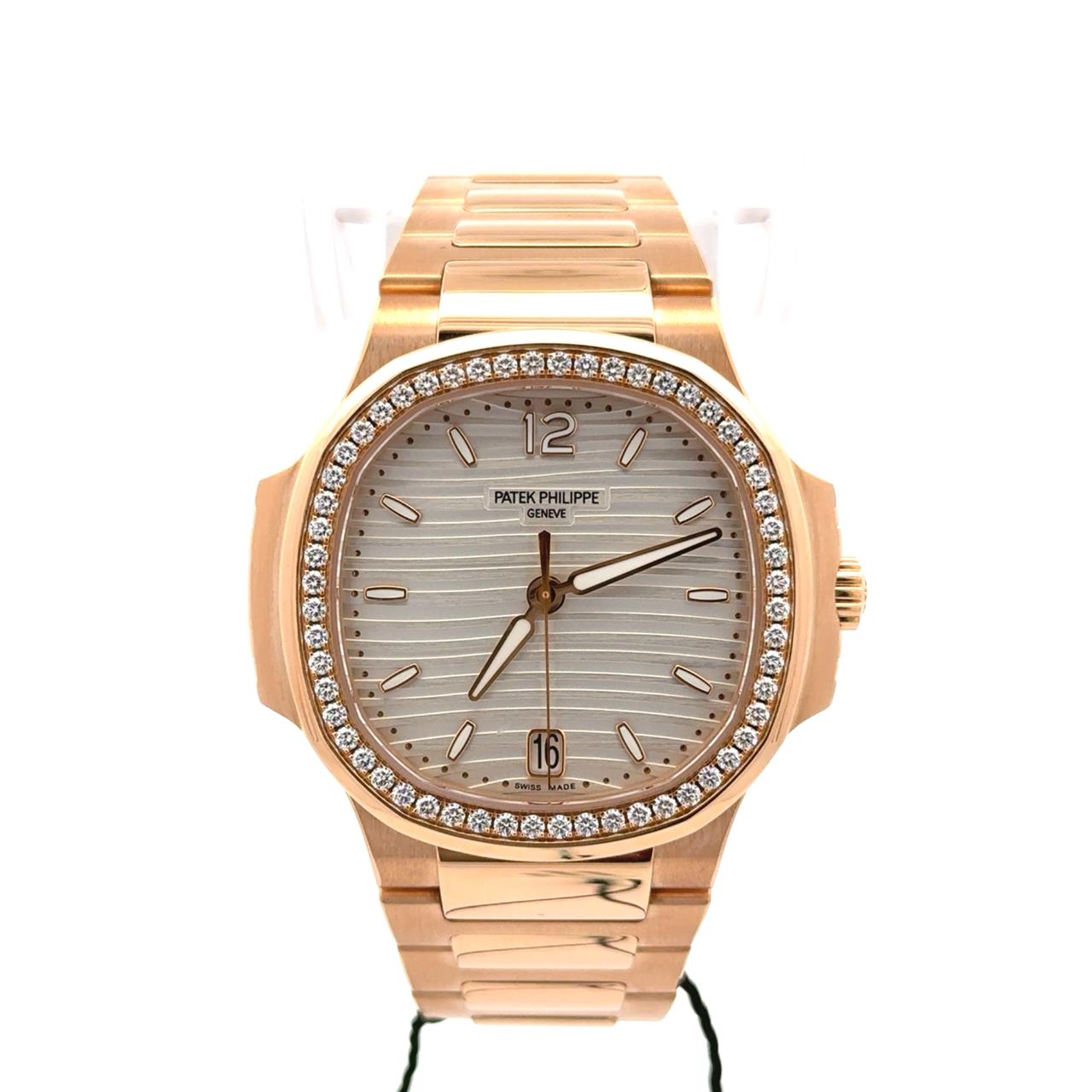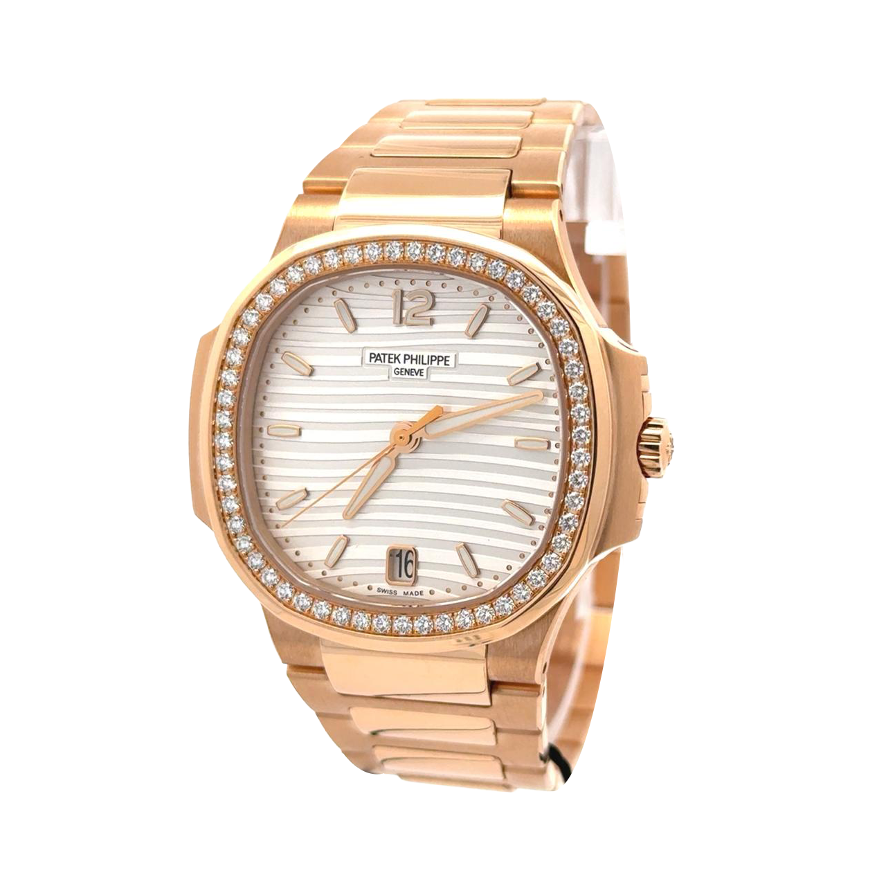 Patek Philippe Nautilus 7118/1200R-001 is a graceful embodiment of sporty femininity, crafted in 18K rose gold and adorned with diamonds to elevate its iconic silhouette into a refined statement of luxury. This ladies’ Nautilus features a 35.2 mm rose gold case with the collection’s signature rounded octagonal bezel, set with 56 brilliant-cut diamonds totaling approximately 0.67 carats. The silvery opaline dial is decorated with wave-like horizontal embossing, a softer take on the classic Nautilus pattern, and is complemented by rose gold applied hour markers with luminescent coating for elegant legibility. A date aperture at 6 o’clock adds practical functionality without disrupting the dial’s serene symmetry. Powered by the Caliber 324 S C, a self-winding mechanical movement, the watch offers a power reserve of up to 45 hours, visible through a sapphire crystal caseback that reveals Patek Philippe’s meticulous finishing and the Geneva Seal hallmark. The integrated rose gold bracelet with a fold-over clasp ensures seamless comfort and visual continuity. With water resistance up to 60 meters.