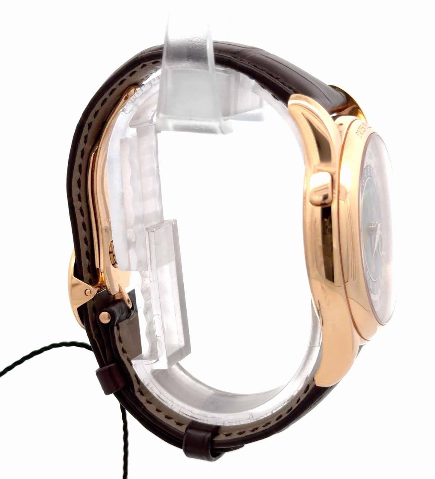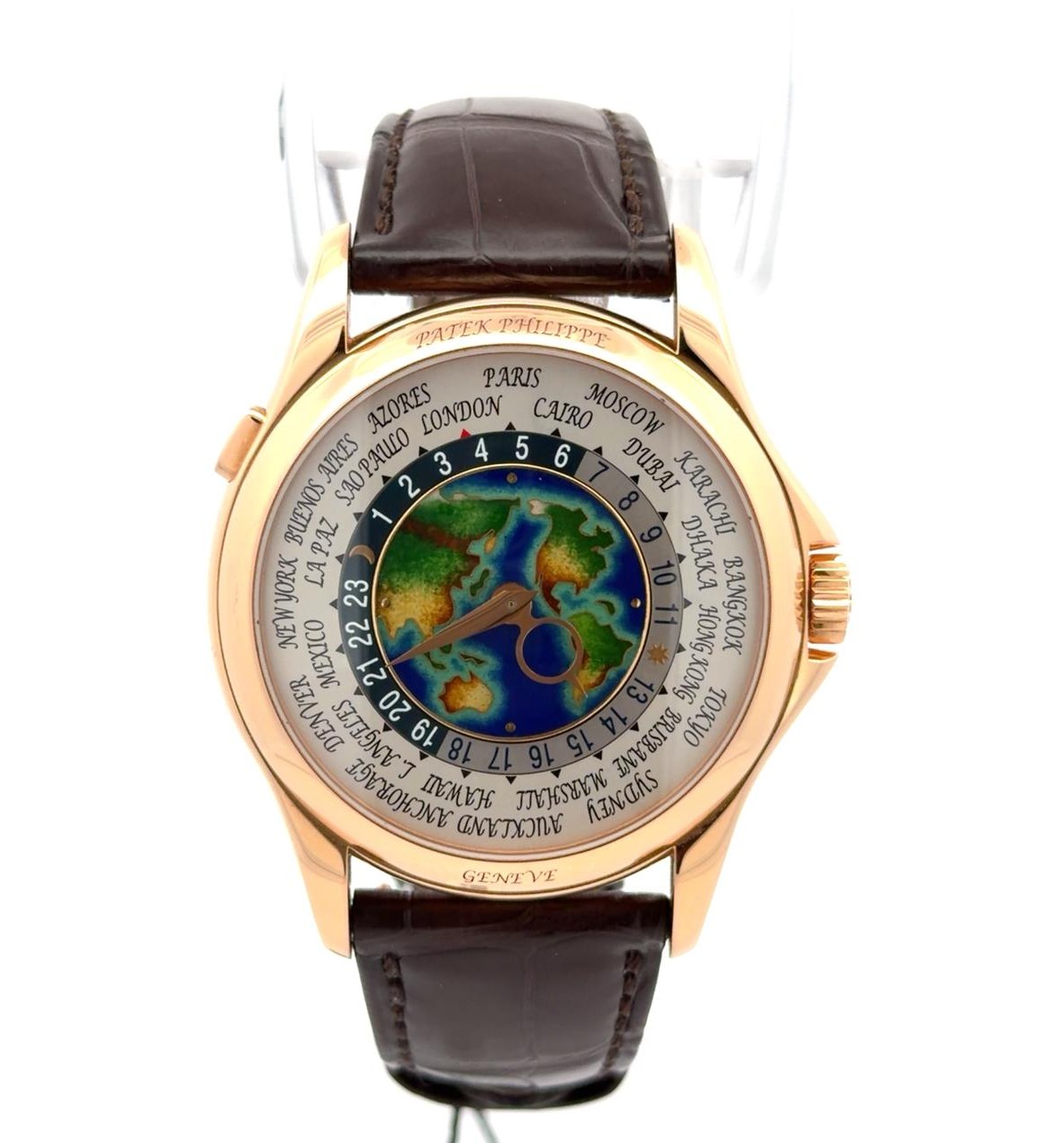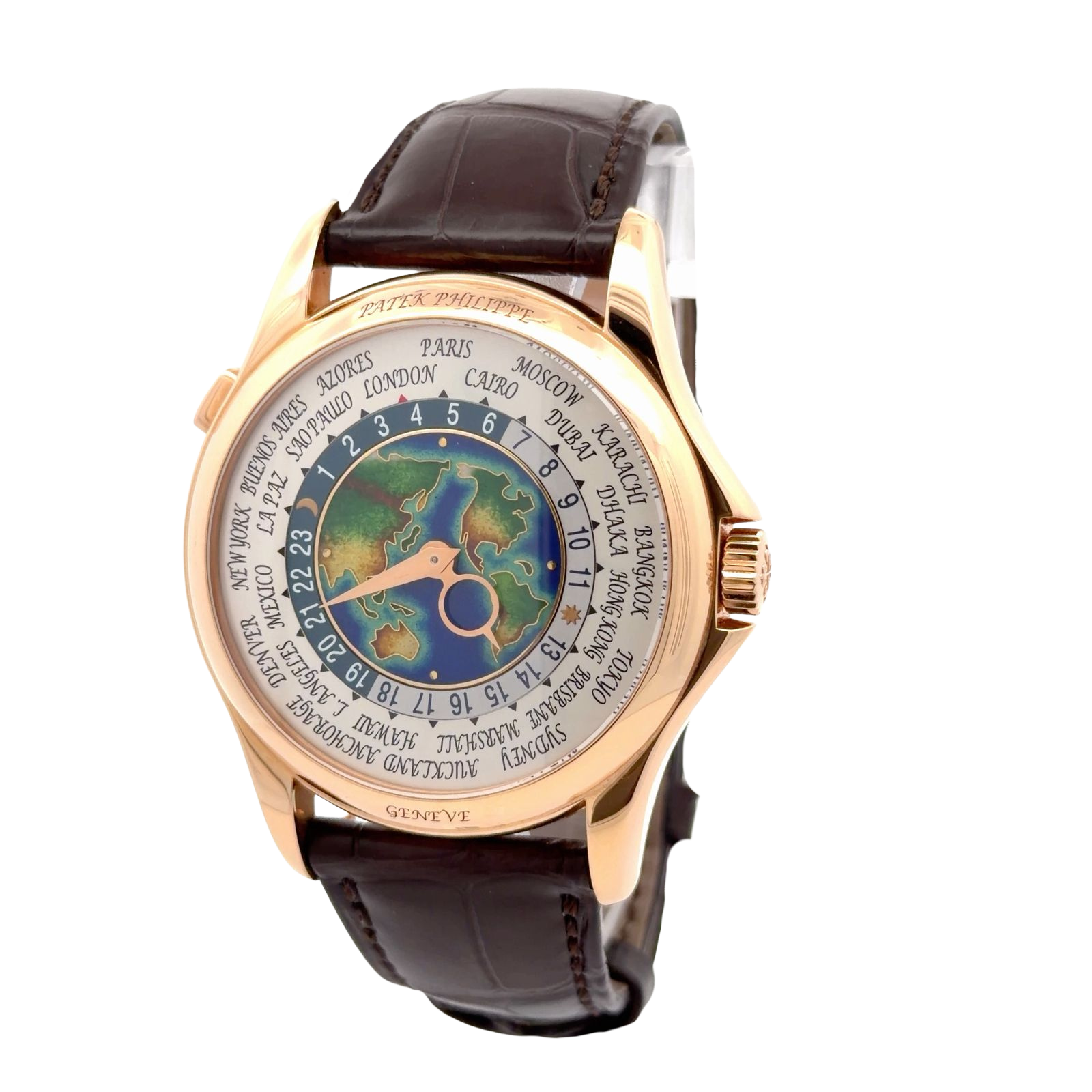 Patek Philippe World Time Ref. 5131R-010 is a horological masterpiece that combines technical ingenuity with rare artistic handcrafts. Housed in a 39.5mm 18k rose gold case, this model is defined by its breathtaking cloisonné enamel dial, which features a vibrant, hand-painted map depicting Asia, Oceania, and the Americas. The watch is powered by the ultra-thin, self-winding Calibre 240 HU, which allows the wearer to read the time in 24 global time zones simultaneously using a unique city disc and a 24-hour ring with day/night indicators.