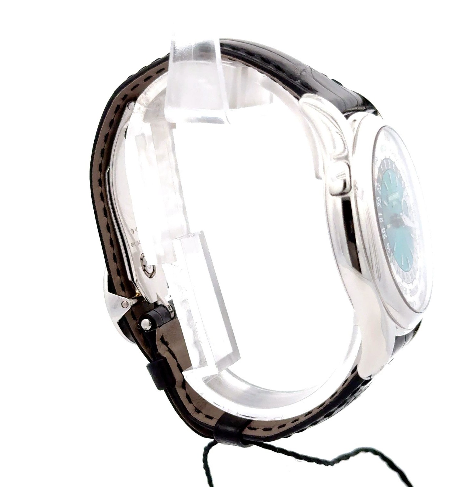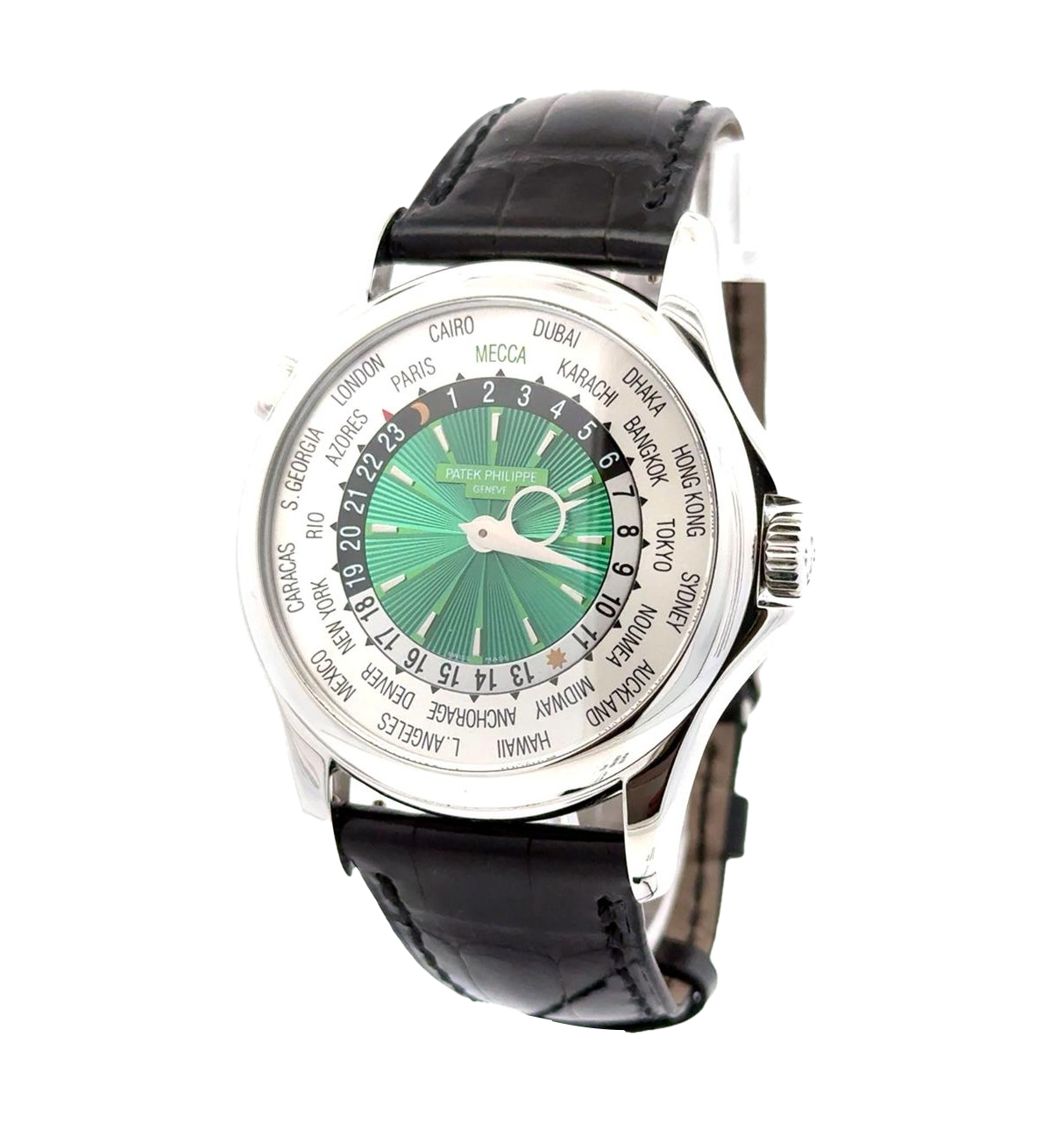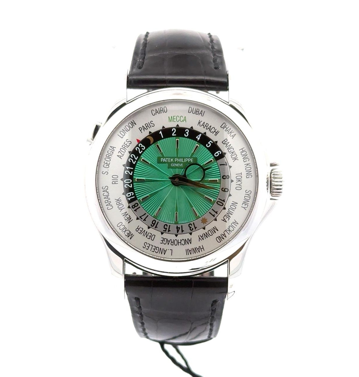 Patek Philippe 5130P-015 “Mecca Edition” is an extraordinary and highly coveted limited-edition World Time watch, created in a series of just 150 pieces to honor the city of Mecca. Crafted from platinum, this timepiece embodies refined elegance and cultural reverence, featuring a striking emerald green guilloché dial, a symbolic color in Islamic tradition. The city of Mecca is specially highlighted in green on the 24-city rotating disc, a unique detail that sets this edition apart. Measuring 39.5 mm in diameter, the 5130P-015 is powered by Patek Philippe’s ultra-thin automatic Caliber 240 HU, a beautifully engineered movement with a 22K gold micro-rotor and a 48-hour power reserve. The signature world time function allows the wearer to instantly view the time across all 24 time zones, with a pusher at 10 o'clock adjusting the city ring and hour hand simultaneously.