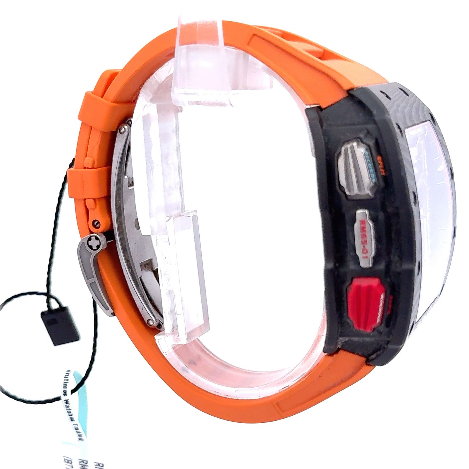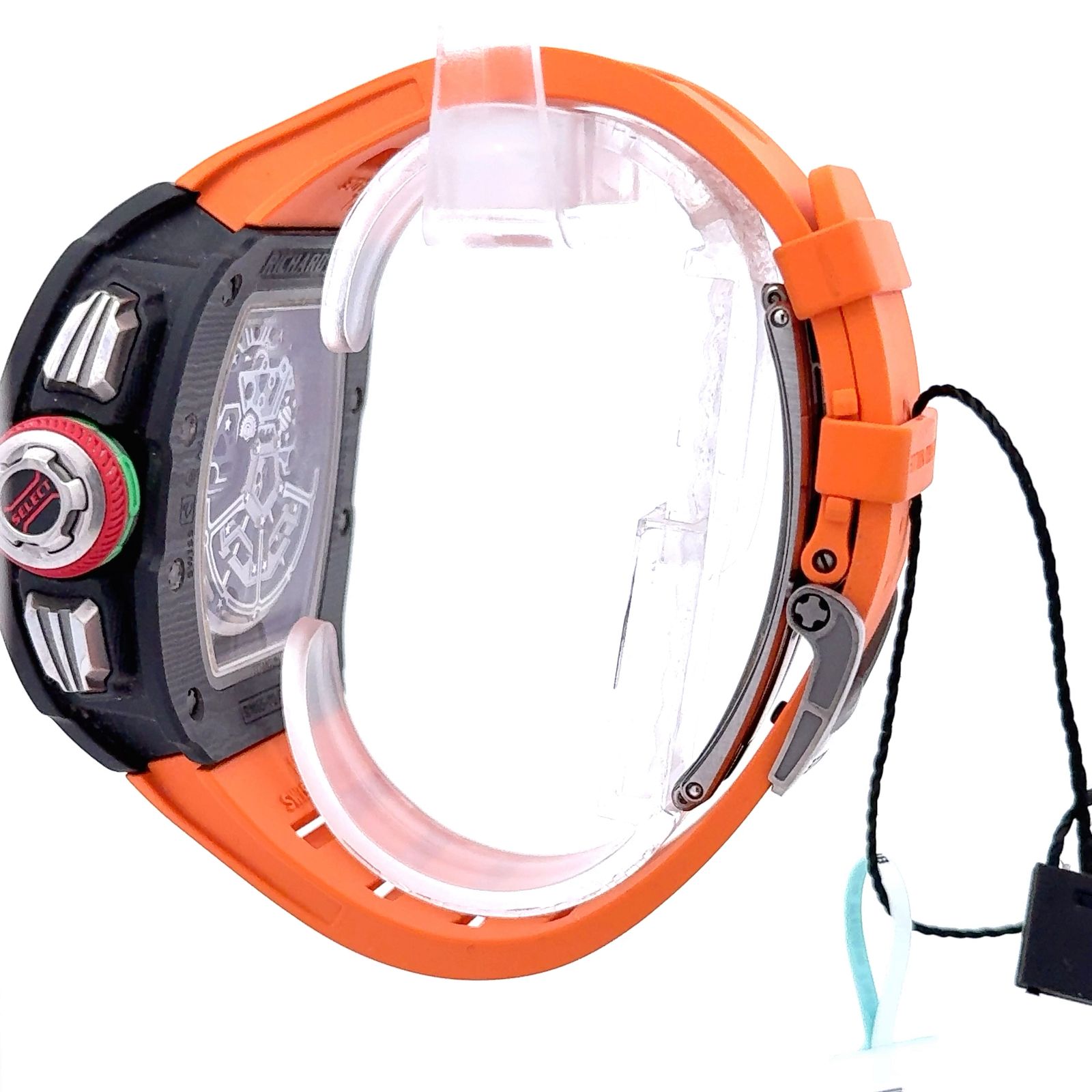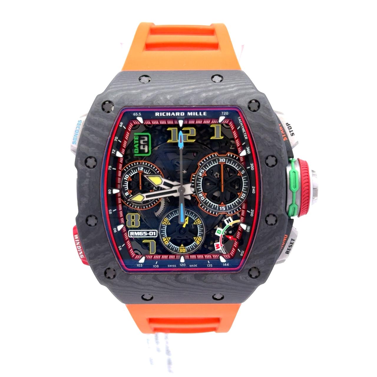 Richard Mille RM 65-01 Automatic Split-Seconds Chronograph is a technical marvel designed for high-performance precision and visual dynamism. Encased in Carbon TPT, its tonneau-shaped case showcases the brand’s signature layered texture and extreme resilience. The dial is a riot of purposeful complexity, featuring a split-seconds chronograph, 30-minute and 12-hour counters, a small seconds subdial, and a date display—all color-coded for intuitive readability. A function selector at 4 o’clock allows the wearer to toggle between winding, neutral, and hand-setting modes, while the vibrant pushers—marked “START,” “STOP,” “RESET,” and “WINDING”—highlight its motorsport DNA. The bright orange rubber strap adds a bold contrast, reinforcing the watch’s kinetic energy. Powered by the in-house Caliber RMAC4, this timepiece is engineered to handle intense chronometric demands with style, making it one of the most complex and compelling automatic chronographs in the Richard Mille lineup.