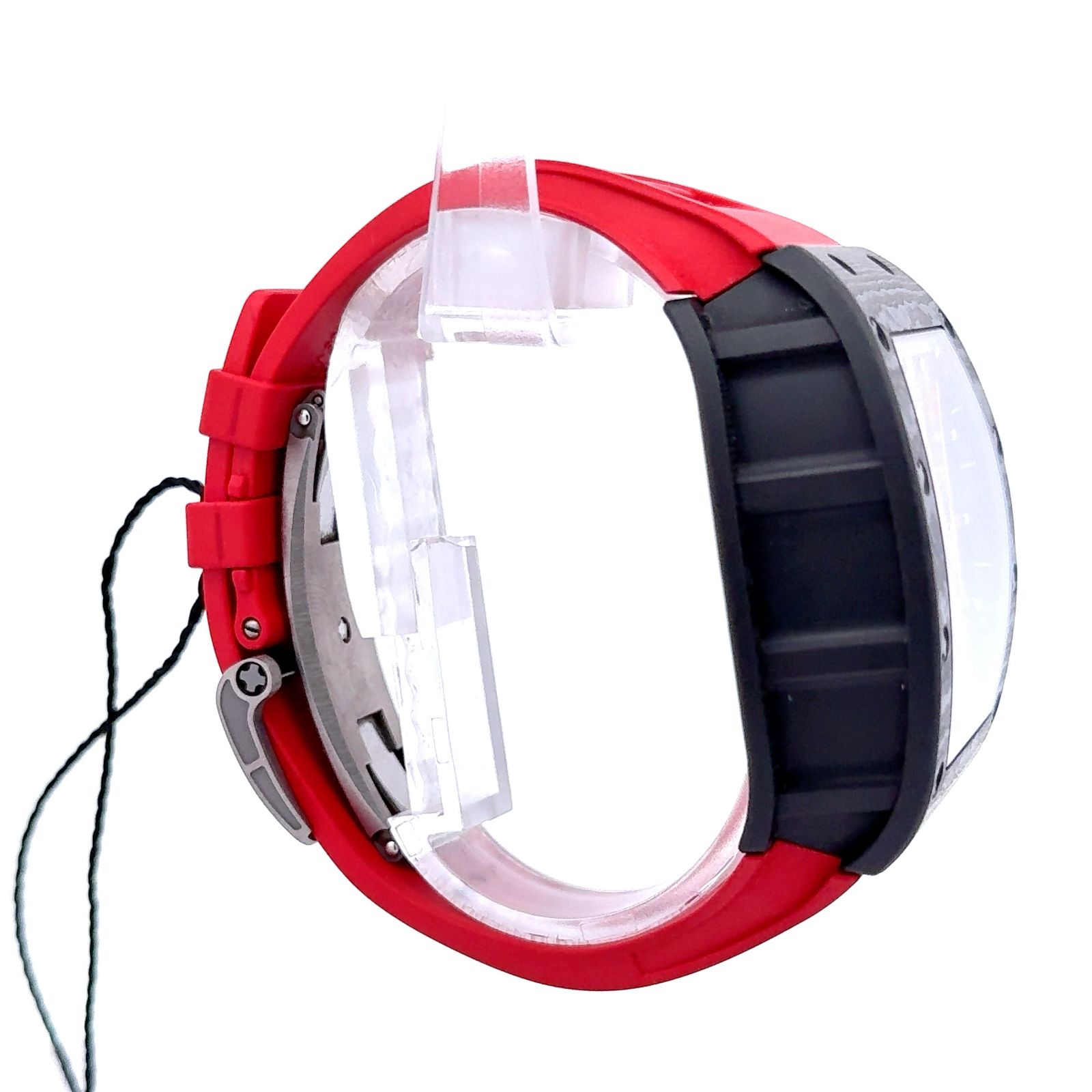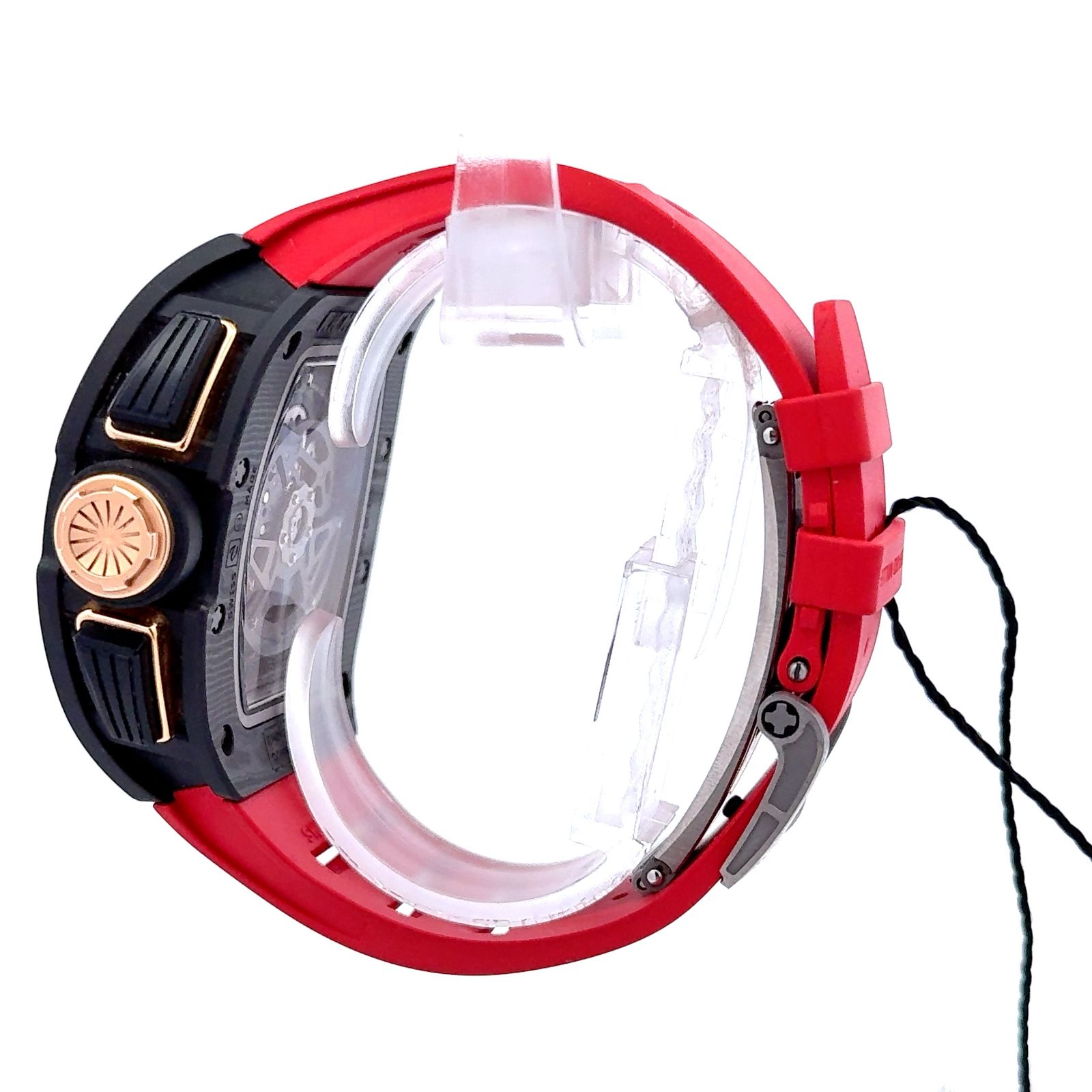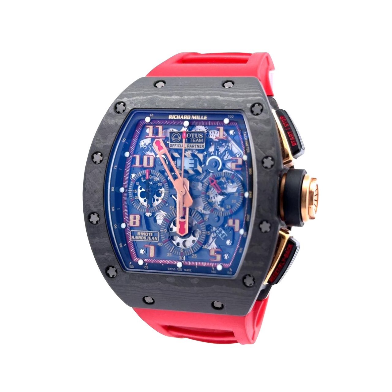 Richard Mille RM 011 Lotus is a high-octane fusion of motorsport engineering and avant-garde horology, created in partnership with the Lotus F1 Team. Its tonneau-shaped case, crafted from lightweight and resilient materials like NTPT carbon or titanium, houses a skeletonized dial that reveals the intricate flyback chronograph movement beneath. Red and gold accents energize the dial, while bold Arabic numerals and a tachymeter scale underscore its racing pedigree. The sub-dials track elapsed minutes, hours, and running seconds, complemented by a date display and annual calendar functionality. Prominent pushers labeled “START” and “RESET,” along with the Lotus Team branding, reinforce its track-inspired identity. Paired with a vivid red strap, the RM 011 Lotus is not just a timepiece—it’s a kinetic sculpture built for speed, precision, and prestige.