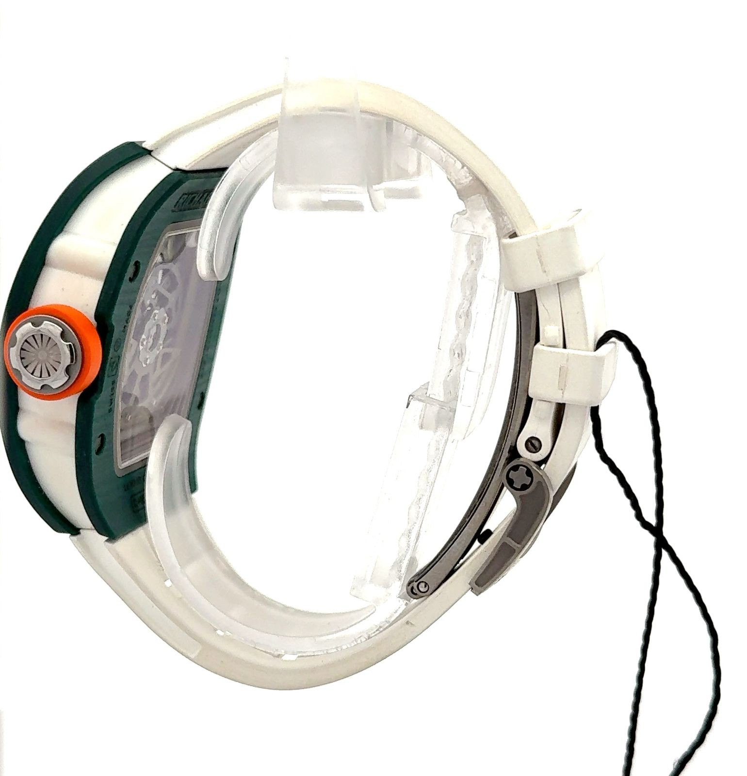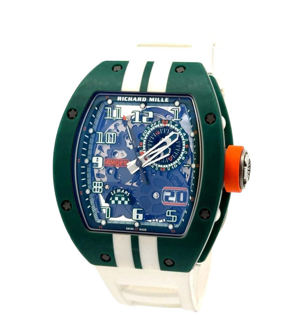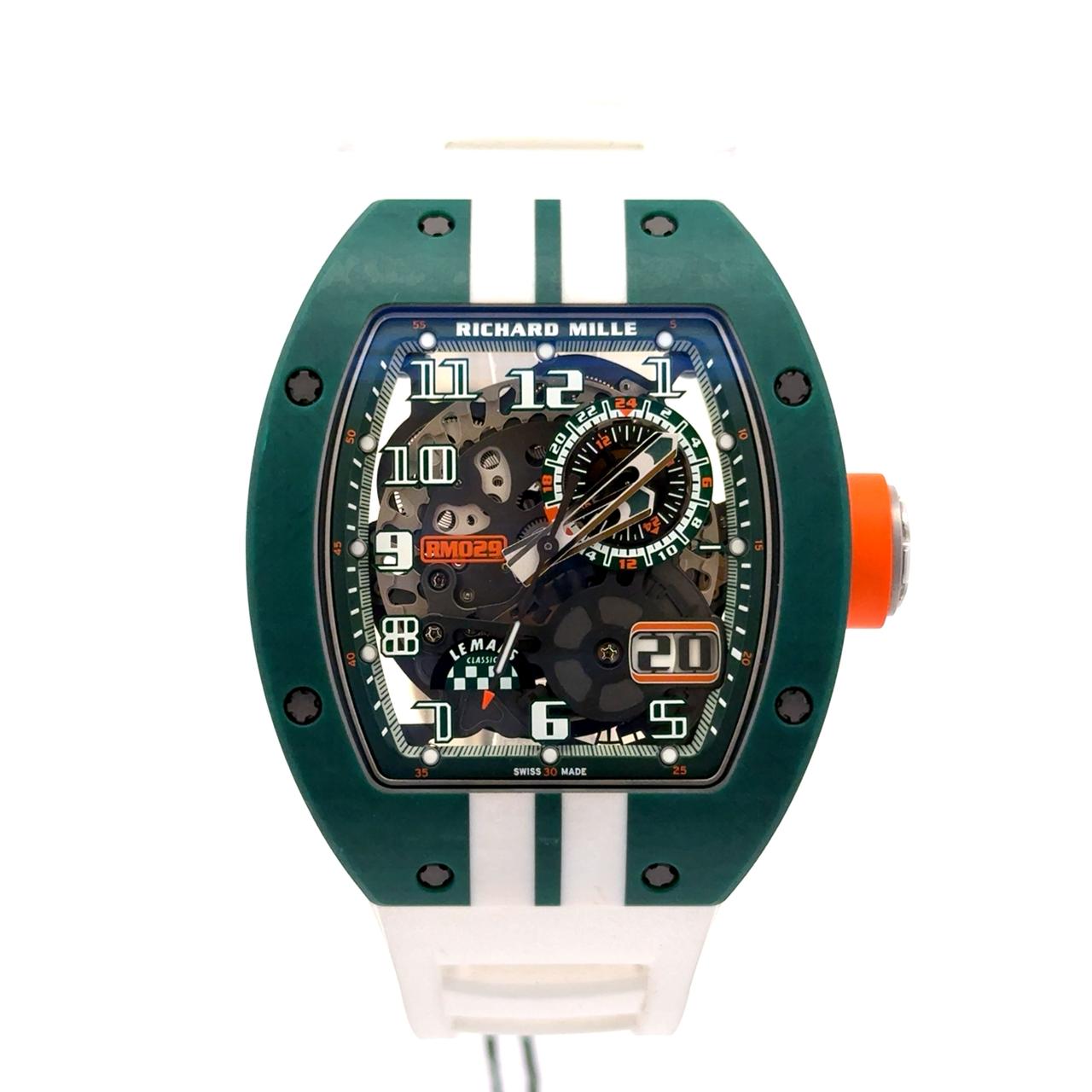 Richard Mille RM029 Le Mans Classic is a vibrant tribute to motorsport heritage, blending technical innovation with bold design. Crafted in the brand’s signature tonneau-shaped case, this limited edition features a striking green Quartz TPT bezel paired with a white caseband and matching white strap accented by green racing stripes—evoking the spirit of the legendary Le Mans Classic event. The skeletonized dial reveals the intricate architecture of the automatic Caliber RMAS7, showcasing a 55-hour power reserve and a variable-geometry rotor designed for optimal winding efficiency. Luminescent Arabic numerals float above the movement, while a date window at 4 o’clock and a 24-hour subdial add functional depth. The crown, accented with a vivid orange ring, injects a playful contrast into the otherwise motorsport-inspired palette. With “LE MANS CLASSIC” and a checkered flag motif emblazoned on the dial, this RM029 is not just a timepiece—it’s a celebration of endurance racing, mechanical excellence, and Richard Mille’s avant-garde aesthetic.