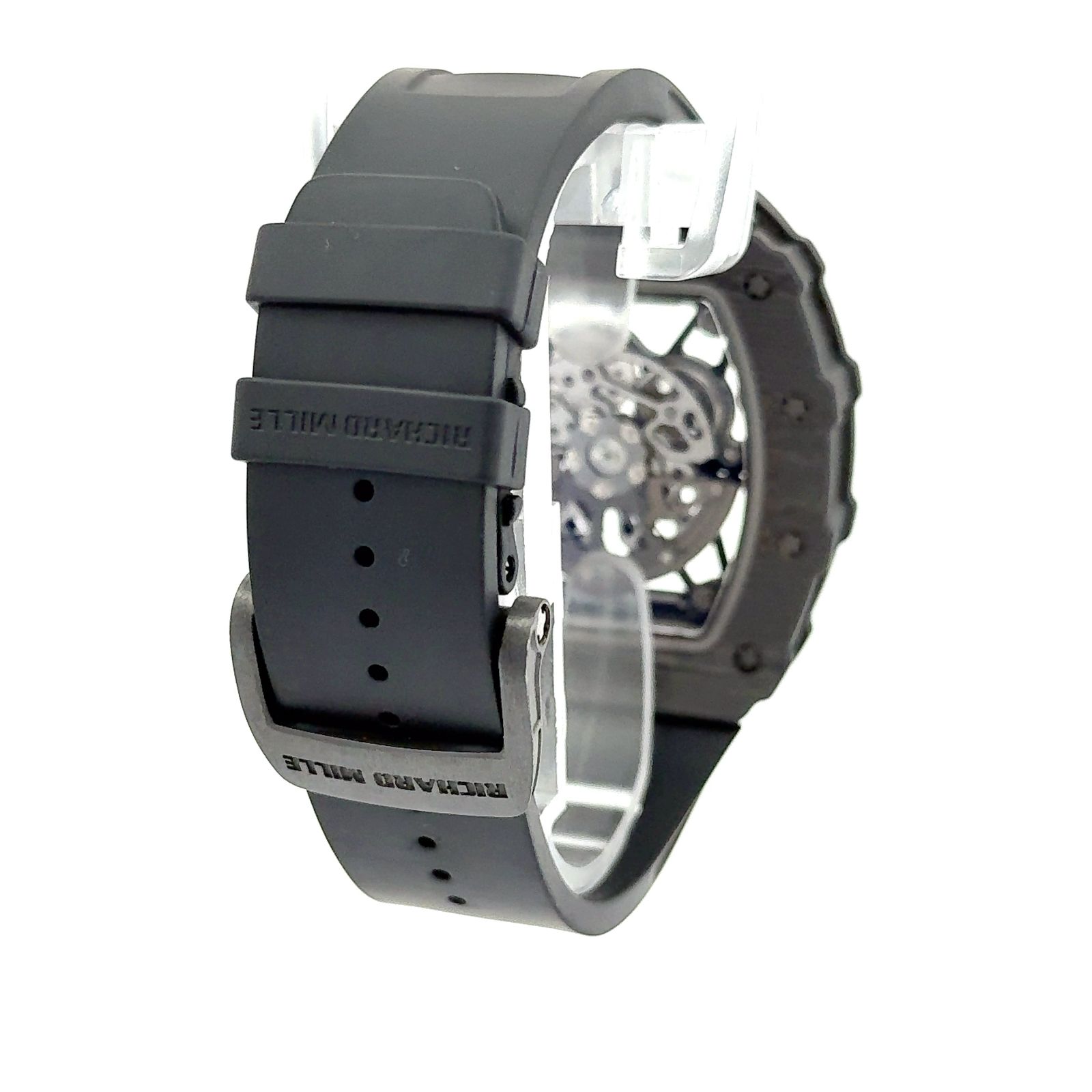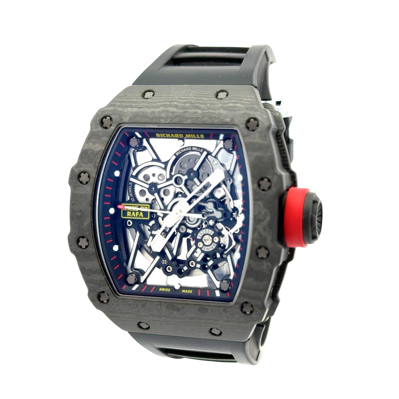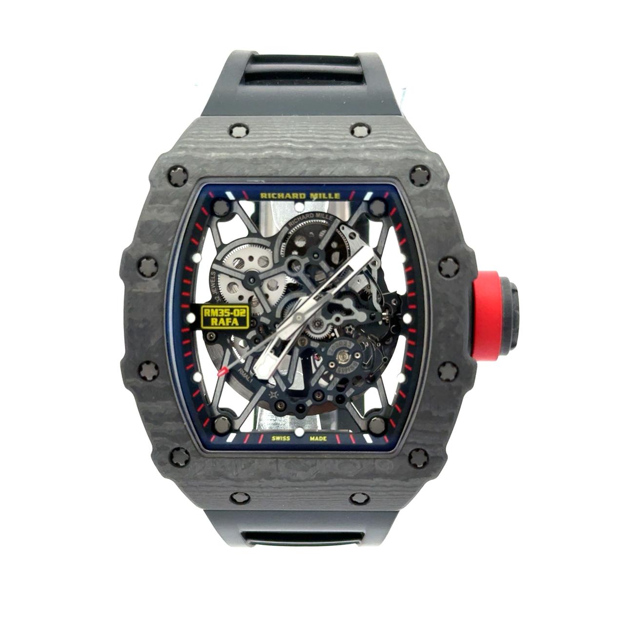 Richard Mille RM 35-02 “Rafael Nadal” is a high-performance timepiece that fuses cutting-edge materials with athletic engineering, designed to withstand the extreme conditions of professional sport while showcasing the brand’s signature skeletonized aesthetic. The RM 35-02 was the first automatic movement in the Nadal collection, responding to collectors’ demand for a self-winding version of the RM 35-01. It features the RMAL1 caliber, a skeletonized movement with grade 5 titanium bridges and baseplate, treated with PVD and Titalyt for enhanced rigidity and corrosion resistance. The tonneau-shaped case is ergonomically curved and features a sapphire crystal caseback—a first for the Nadal line—allowing full view of the movement from both sides.